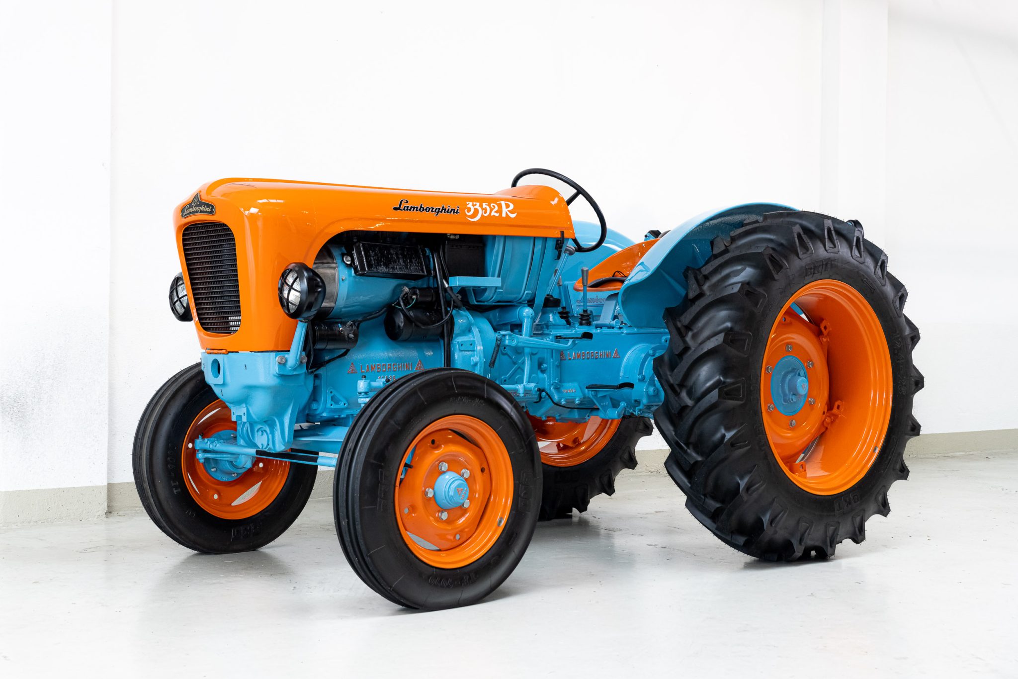 Orange-finished steel wheels are accented by blue hubs and mounted with 5.50–16 front and 12.4–28 rear BKT tires. Stopping power is provided by independent rear drum brakes.
