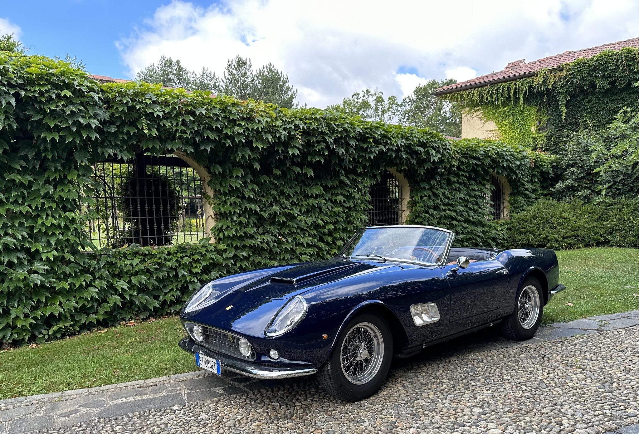 This re-creation’s aluminum bodywork was fabricated by Stefano Allegretti, the son of Carrozzeria Allegreti founder Mario Allegretti, to replicate that of one of the approximately 55 original SWB California Spyders built. According to a 2022 letter from Allegretti shown in the photo gallery below, the project was based on the rolling chassis of a 250 GTE, with the donor car’s frame was shortened to accommodate the abbreviated wheelbase. Finished in dark blue, the car features faired-in headlights with bright bezels, grille-mounted driving lights, quad exhaust outlets, and a dark blue convertible top.
