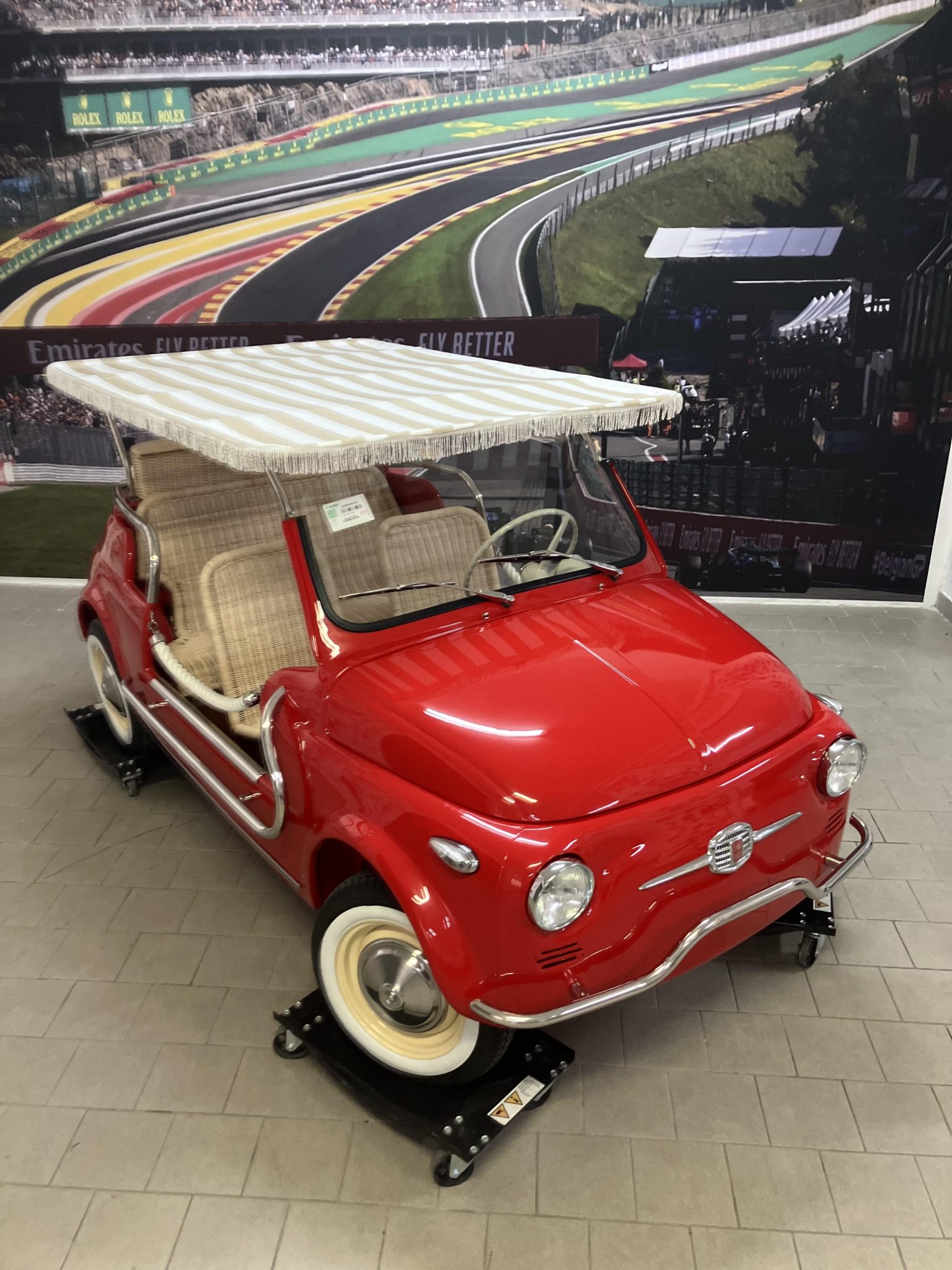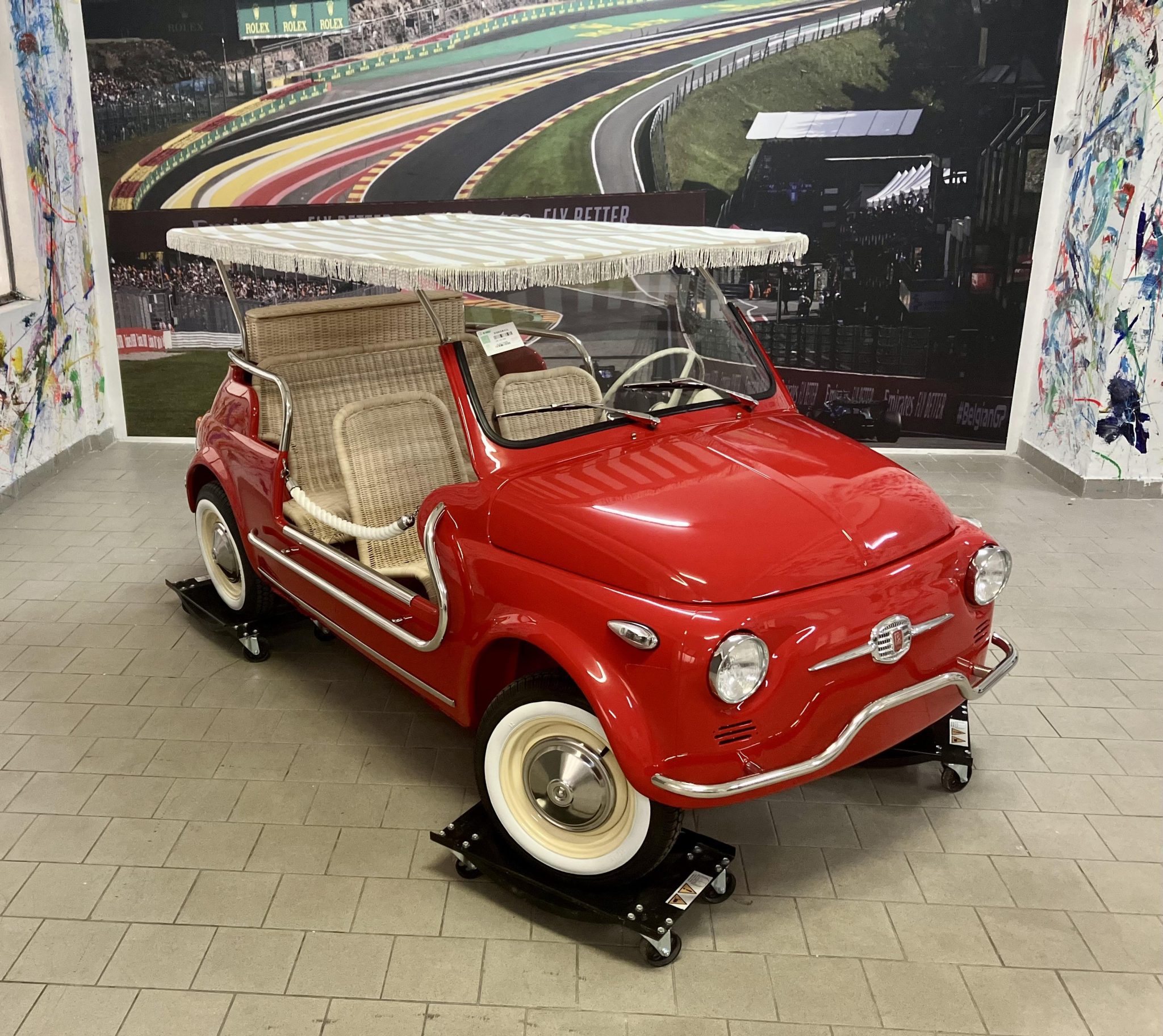 Beige-finished 12″ steel wheels wear polished hubcaps, and the tires are fitted with Atlas whitewall inserts. The suspension and four-wheel drum brakes were reportedly overhauled during the refurbishment.