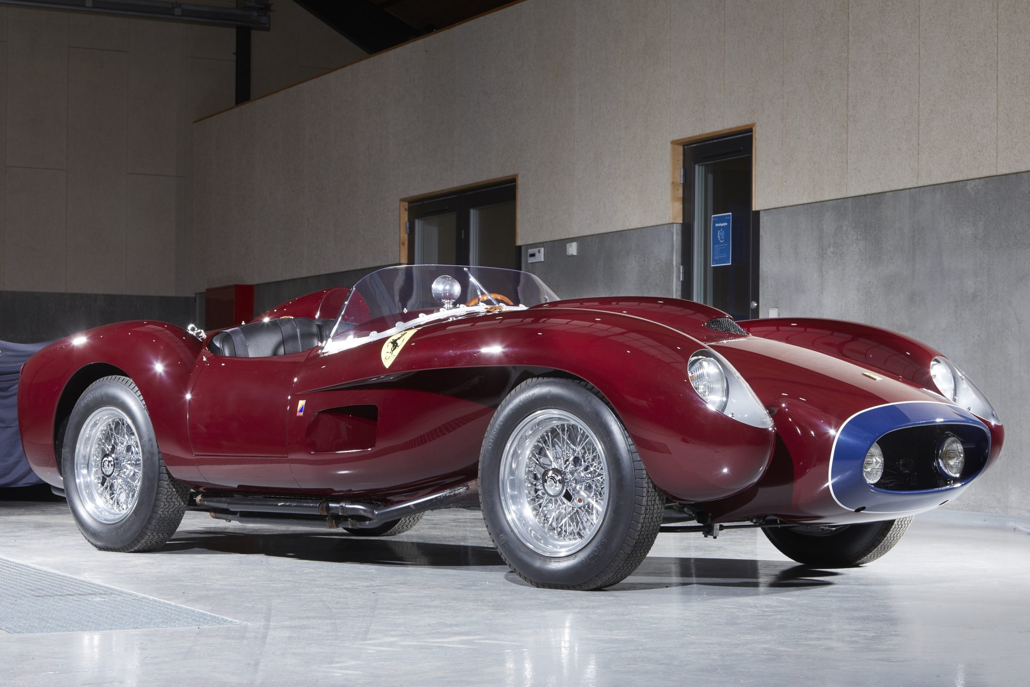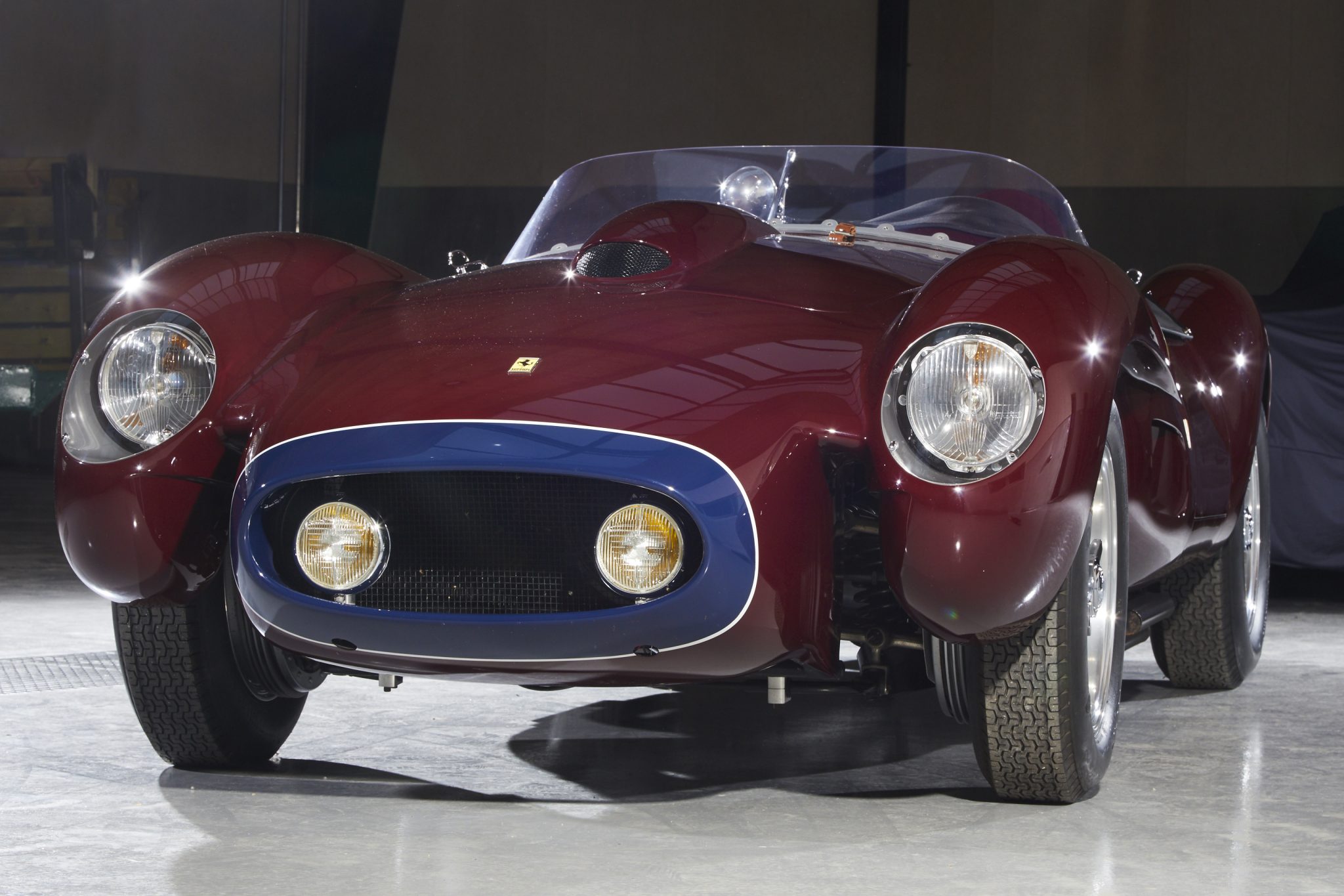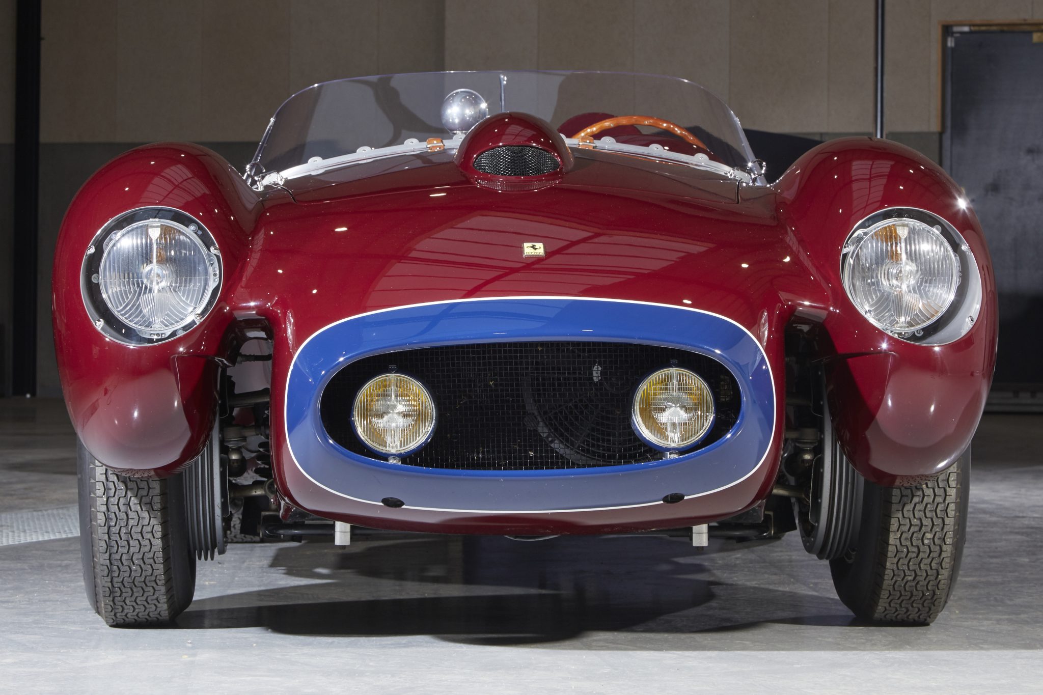 This re-creation features aluminum coachwork finished in burgundy with a blue and white accent around the leading edge of the nose. Features include faired Marchal headlights, Cibie yellow foglights set within the grille, a hood scoop, a full-width plexiglass windshield, a driver-side rear fairing housing a fuel-filler cap, Scuderia Ferrari fender shields, and quad megaphone exhaust outlets.