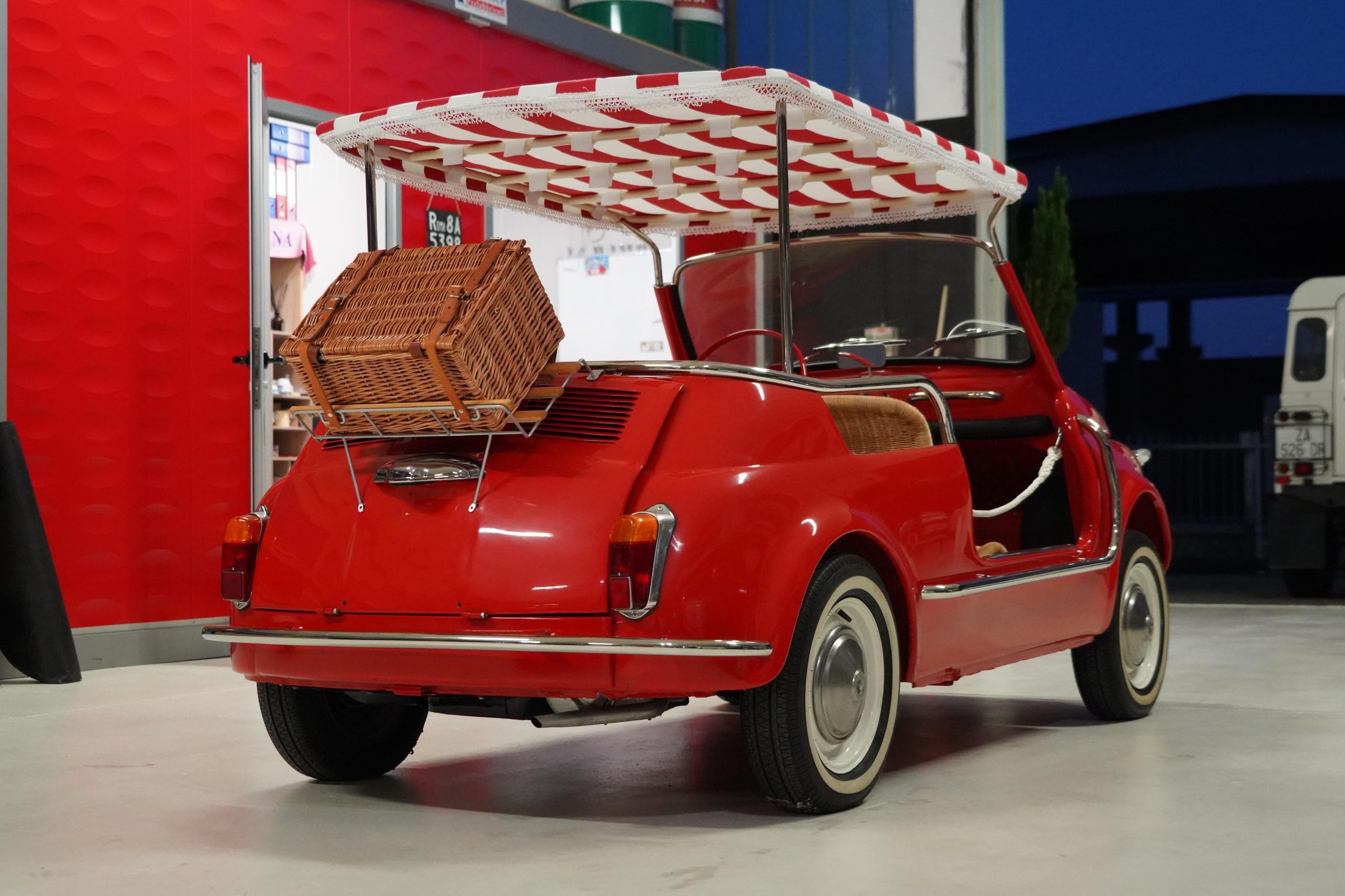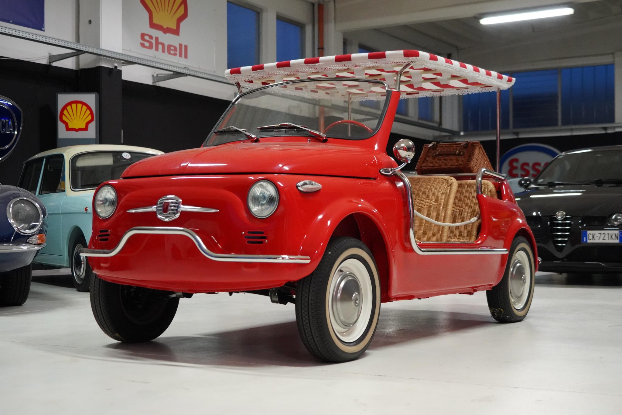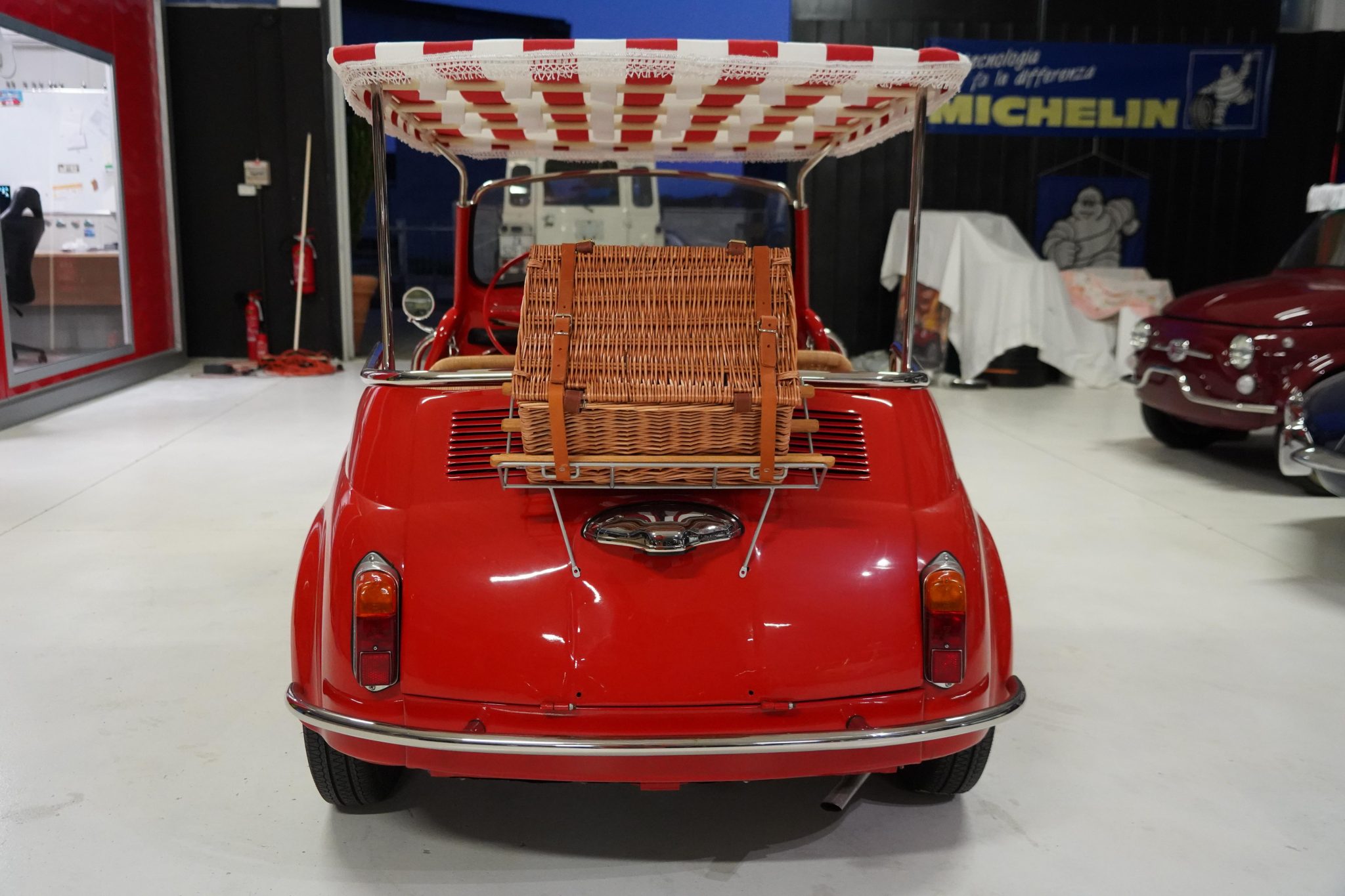 White-finished 12″ steel wheels wear polished hubcaps and are mounted with Nuvolari TN-1 Radiale whitewall tires. Stopping power is provided by four-wheel drum brakes.