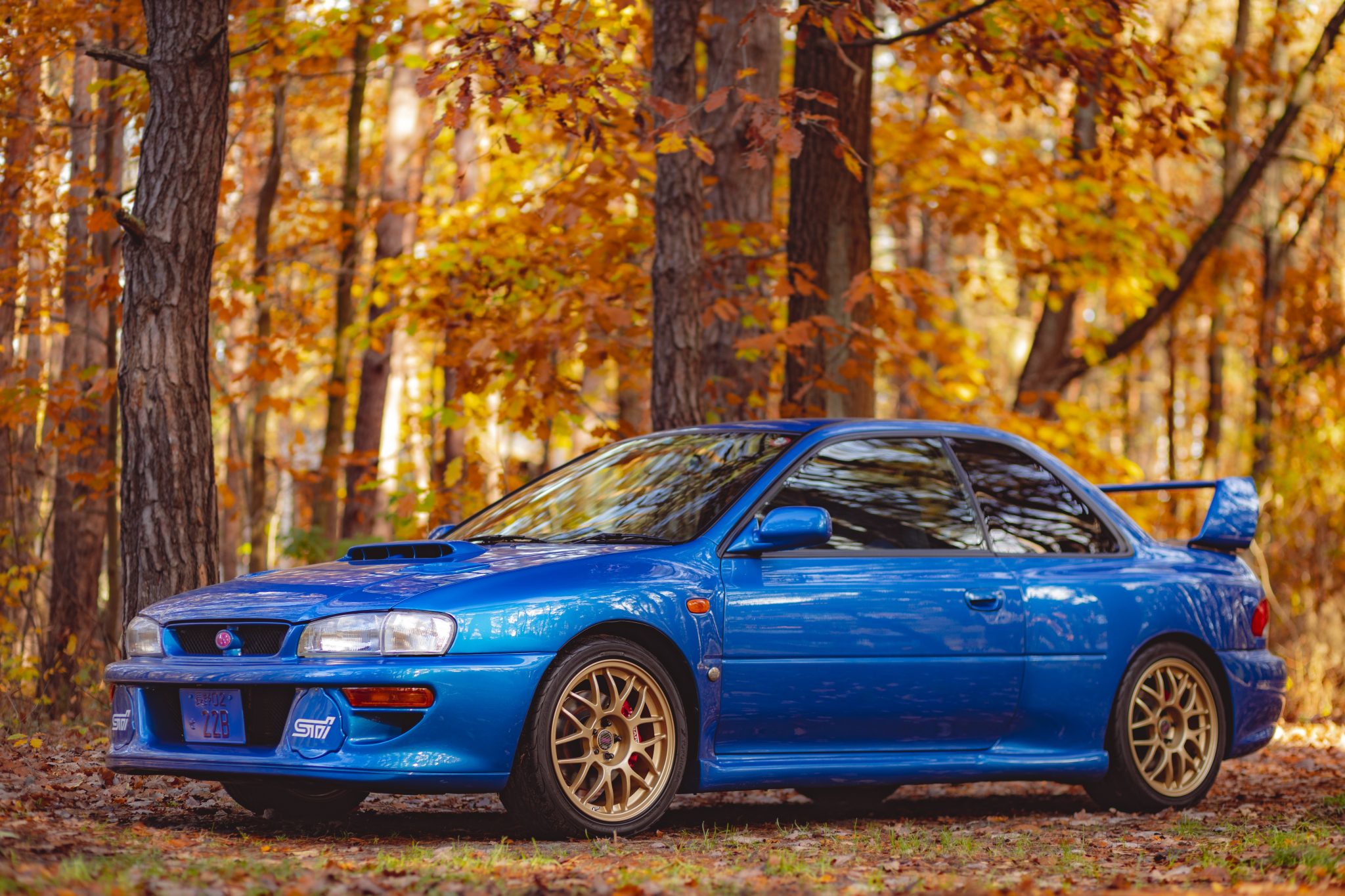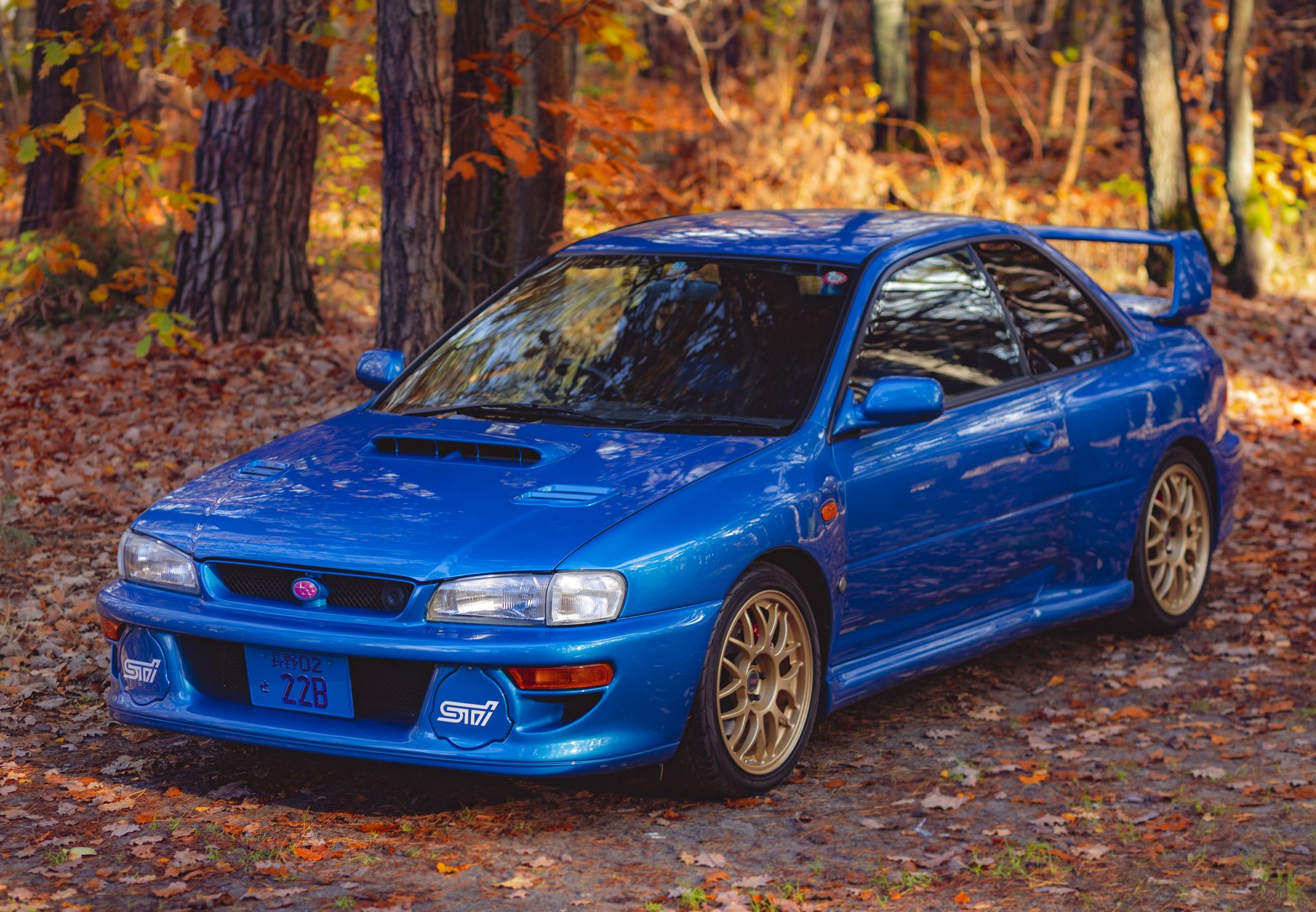 Factory 17″ gold-finished BBS wheels are wrapped in Yokohama S Drive tires, while a non-matching spare wheel is stored in the trunk compartment. The car is equipped with a carbon-fiber strut tower bar and rides on Cusco adjustable coilovers, while stopping power is provided by red-finished Subaru-branded calipers over vented discs. The removed Bilstein suspension components are included in the sale.
