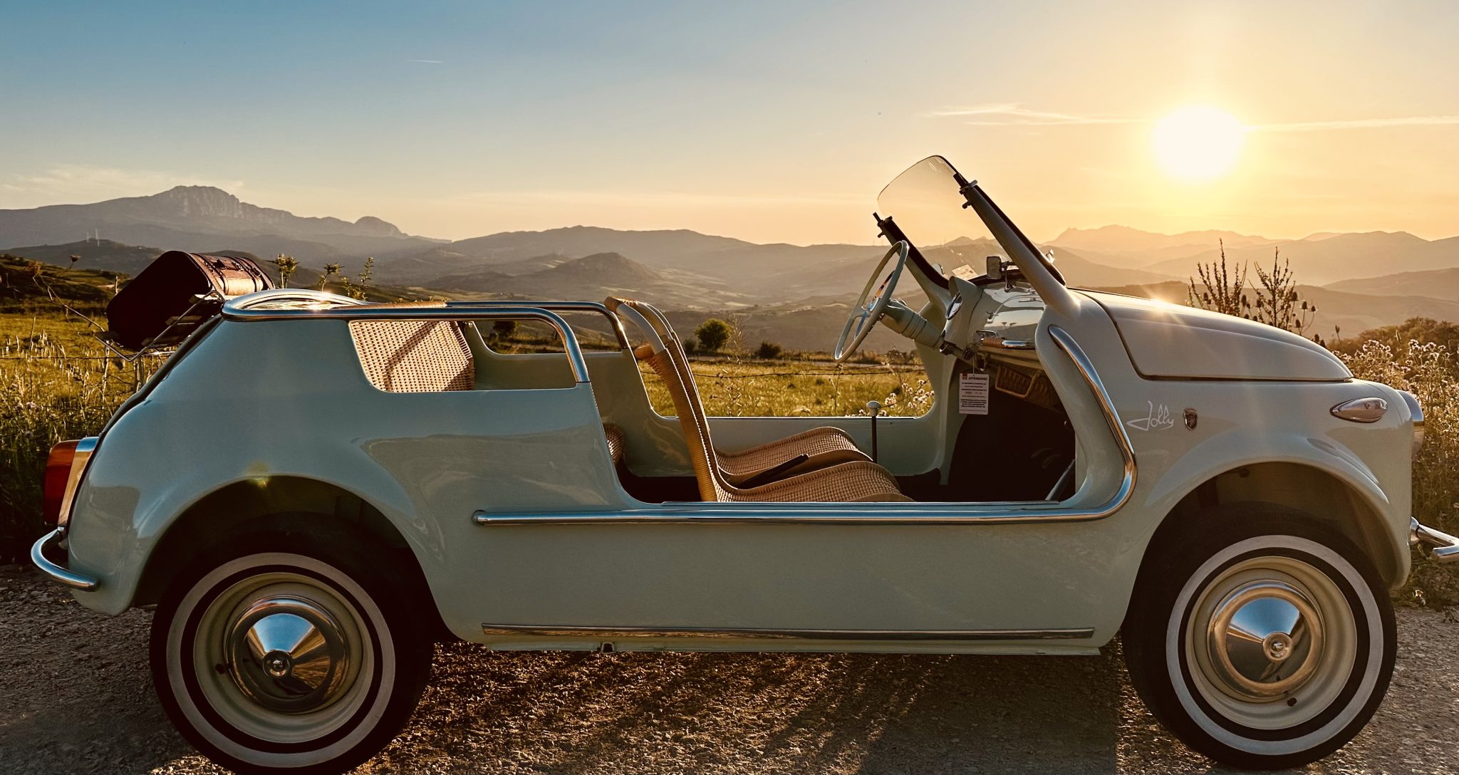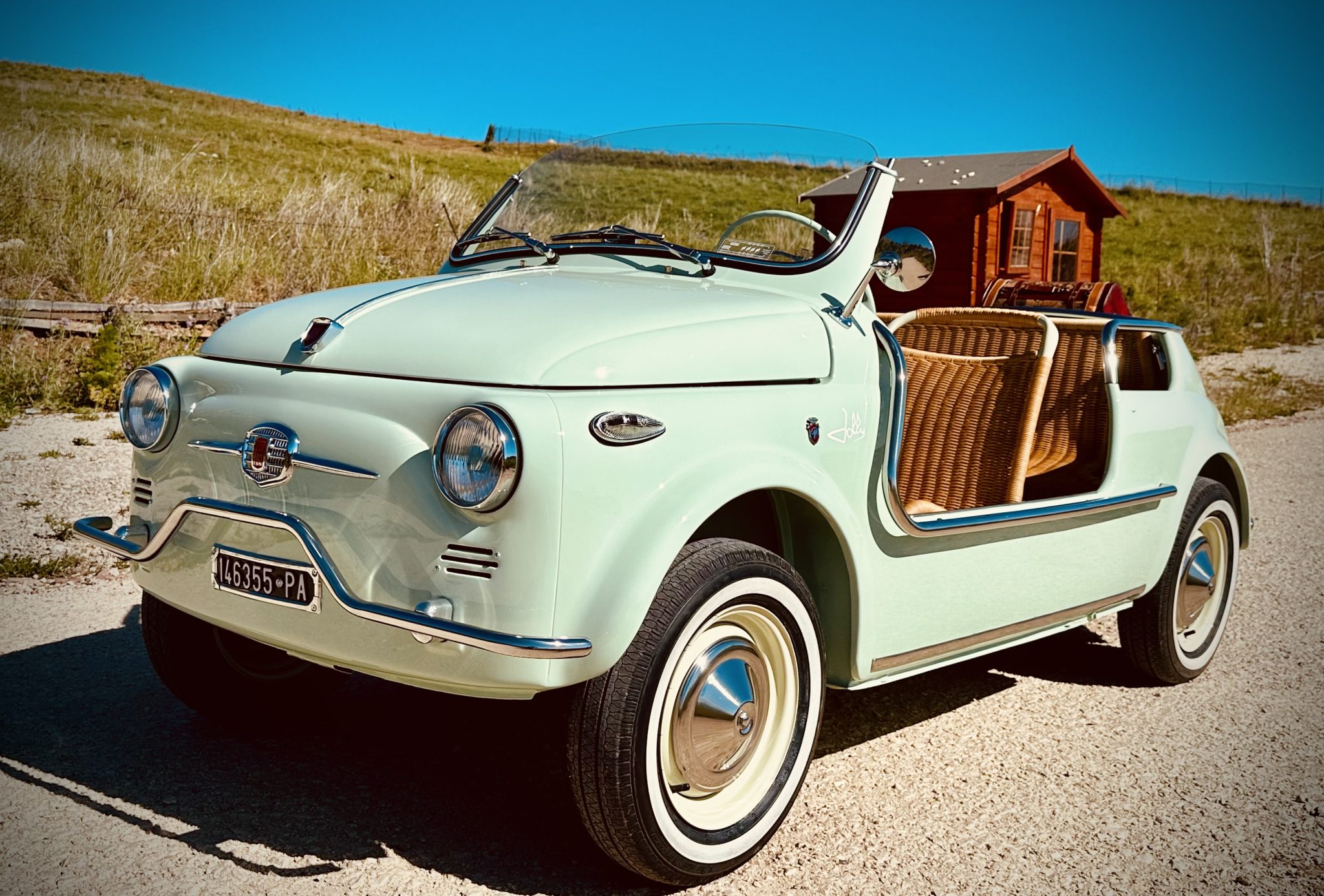 The 12″ steel wheels are mounted with 125-series Nuvolari TN-1 radial tires. The suspension features a transverse leaf spring setup at the front paired with semi-trailing arms and coil springs out back. Braking is handled by four-wheel drums.