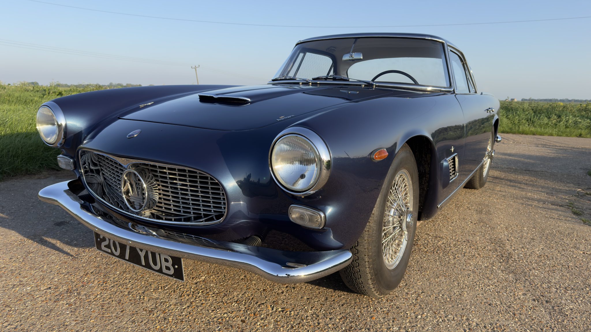 This example was stripped to bare metal and repainted in its current shade of Blu Sera Metallizzato during the refurbishment performed by Project Heaven in Peterborough, England, between 2014 and 2021. The brightwork is also said to have been re-plated during the project. Features include oval front side markers, a hood scoop, fender vents with bright grilles, a lockable fuel filler cap, and dual exhaust outlets.