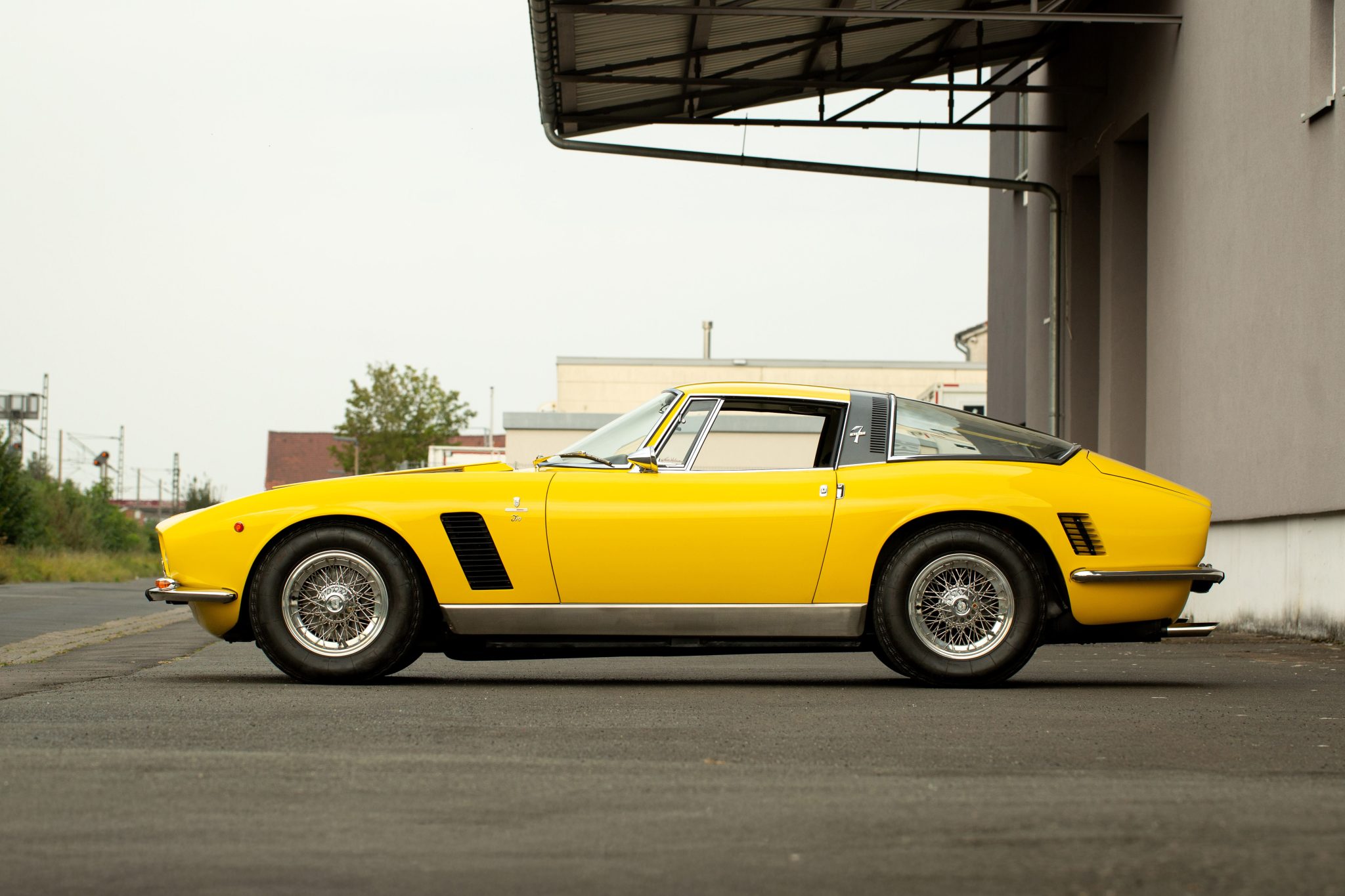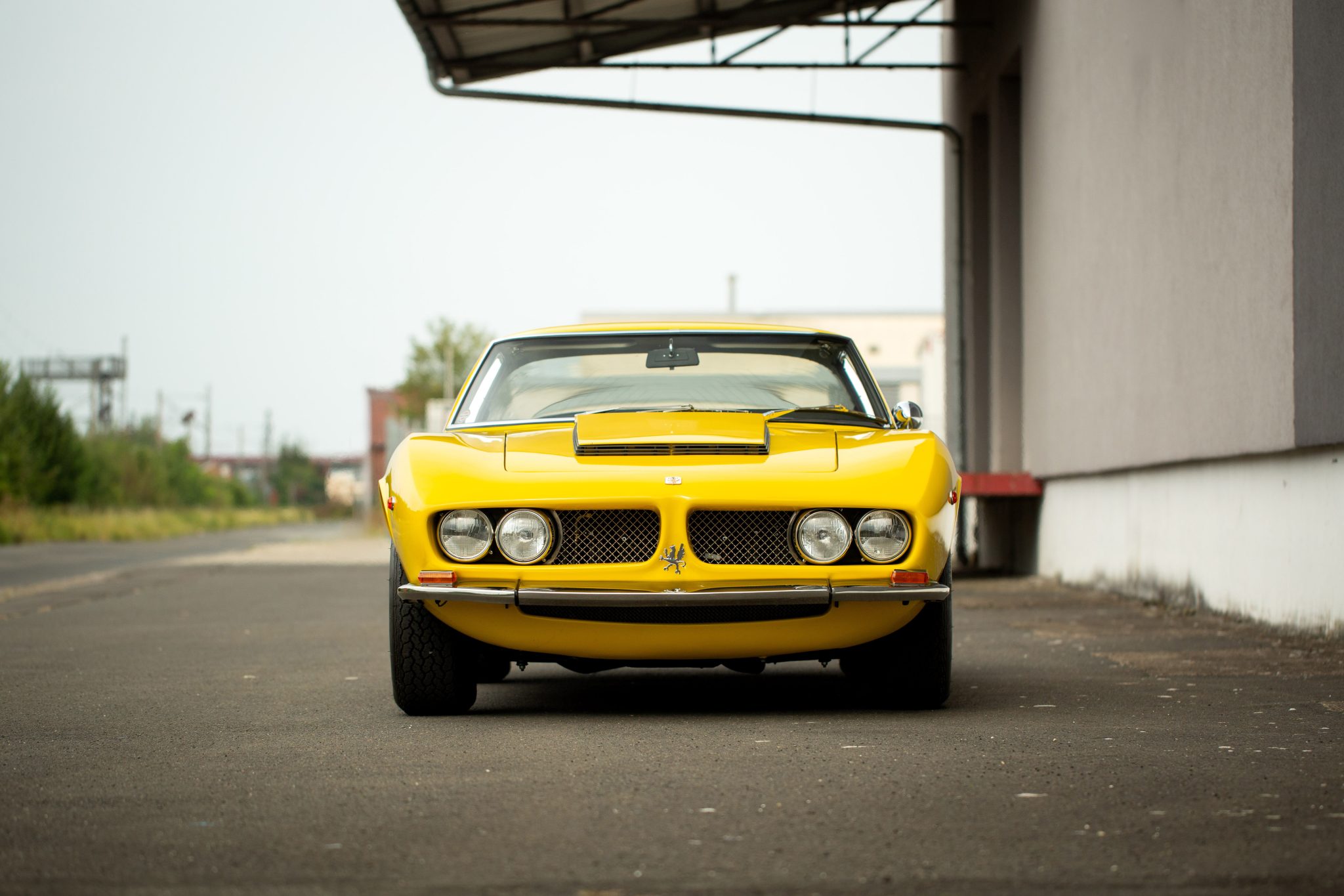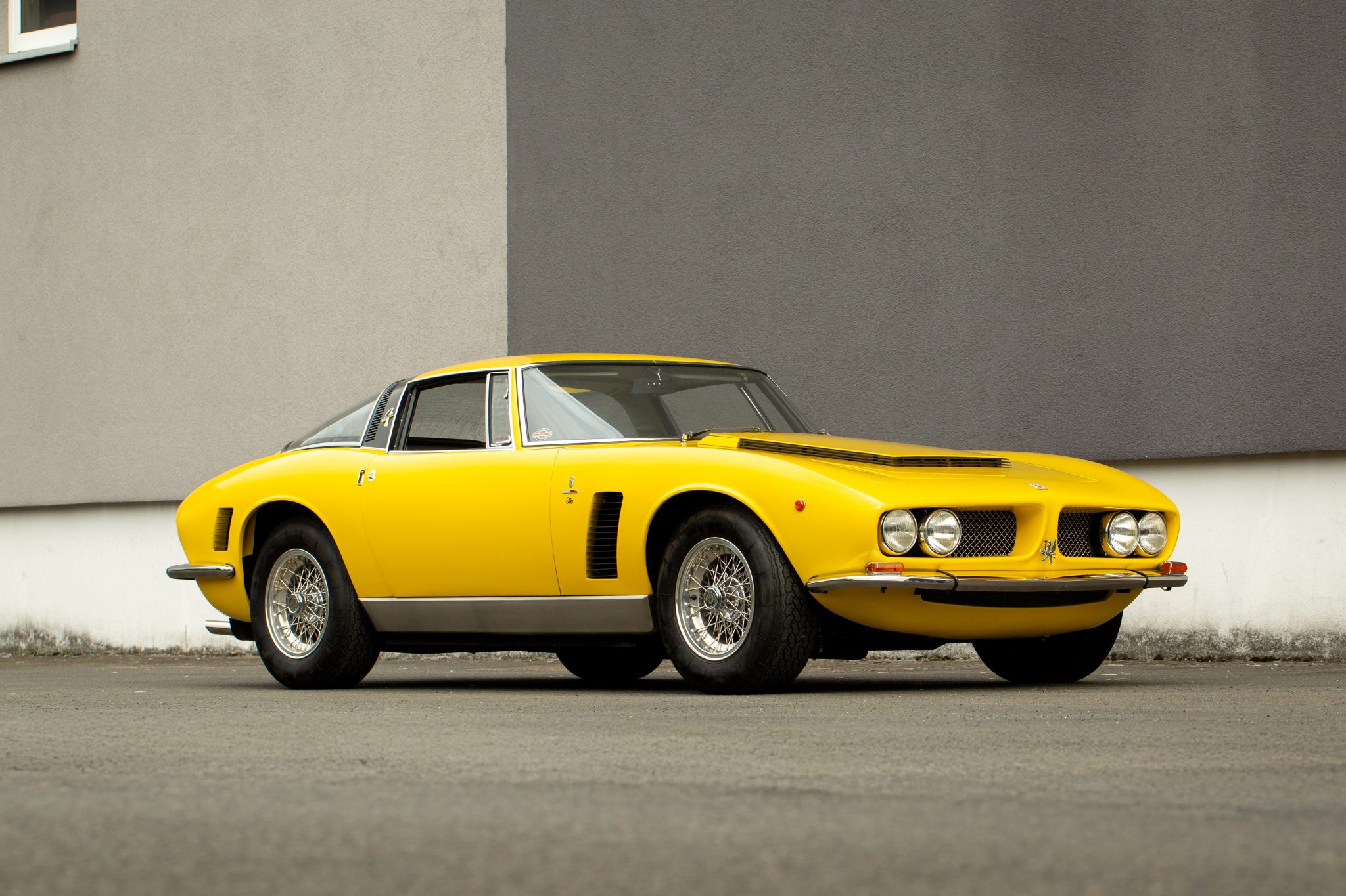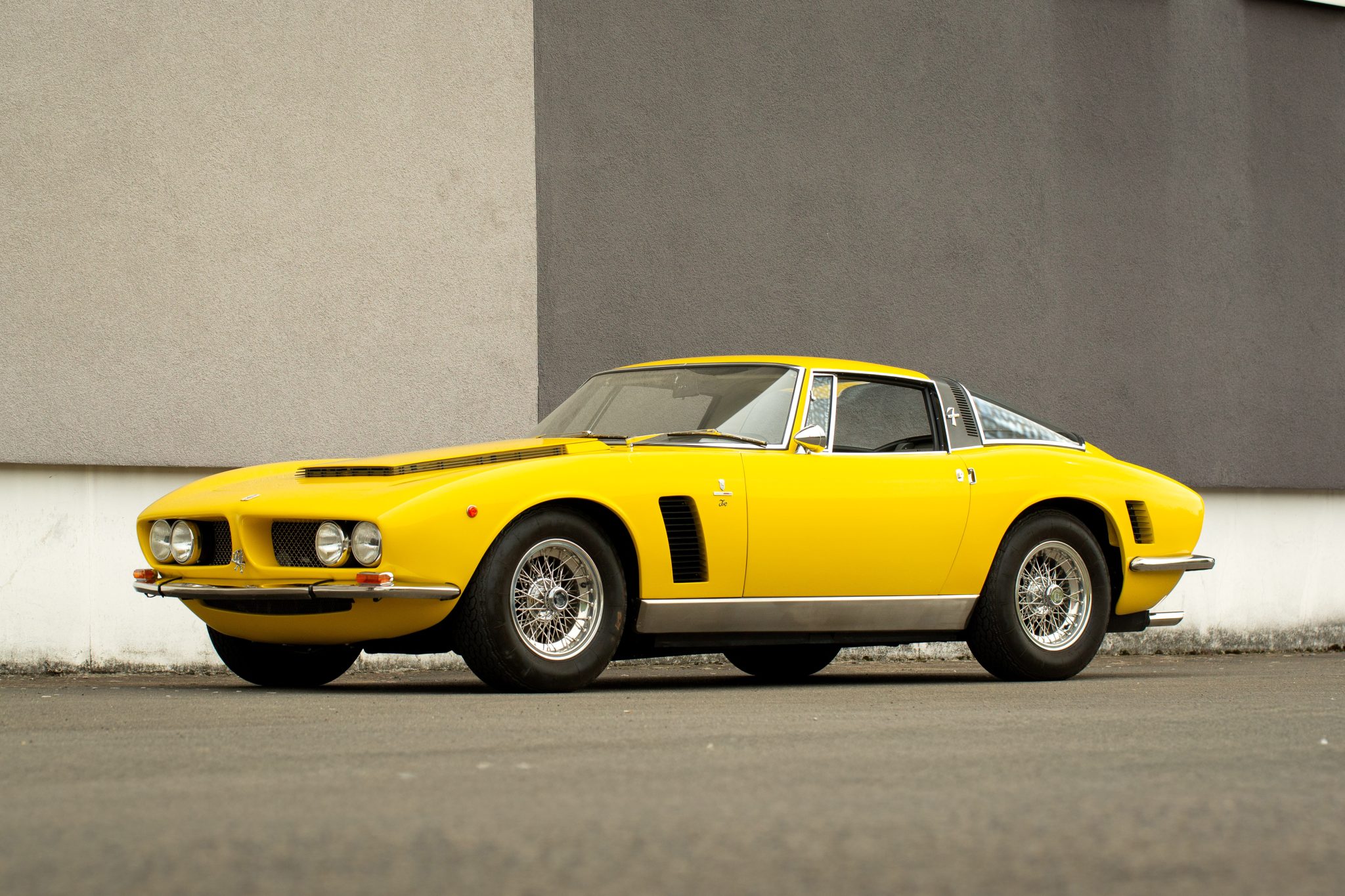 This example left the factory finished in Giallo and was repainted in its original shade during the refurbishment performed between 2018 and 2022. Bodywork features Giugiaro-penned fastback styling with a panoramic rear window, a raked windshield, a split grille between quadruple headlights, horizontal sail-panel vents, louvered vents rearward of each wheel, pocket-style door handles, and a bullet-style driver-side mirror.