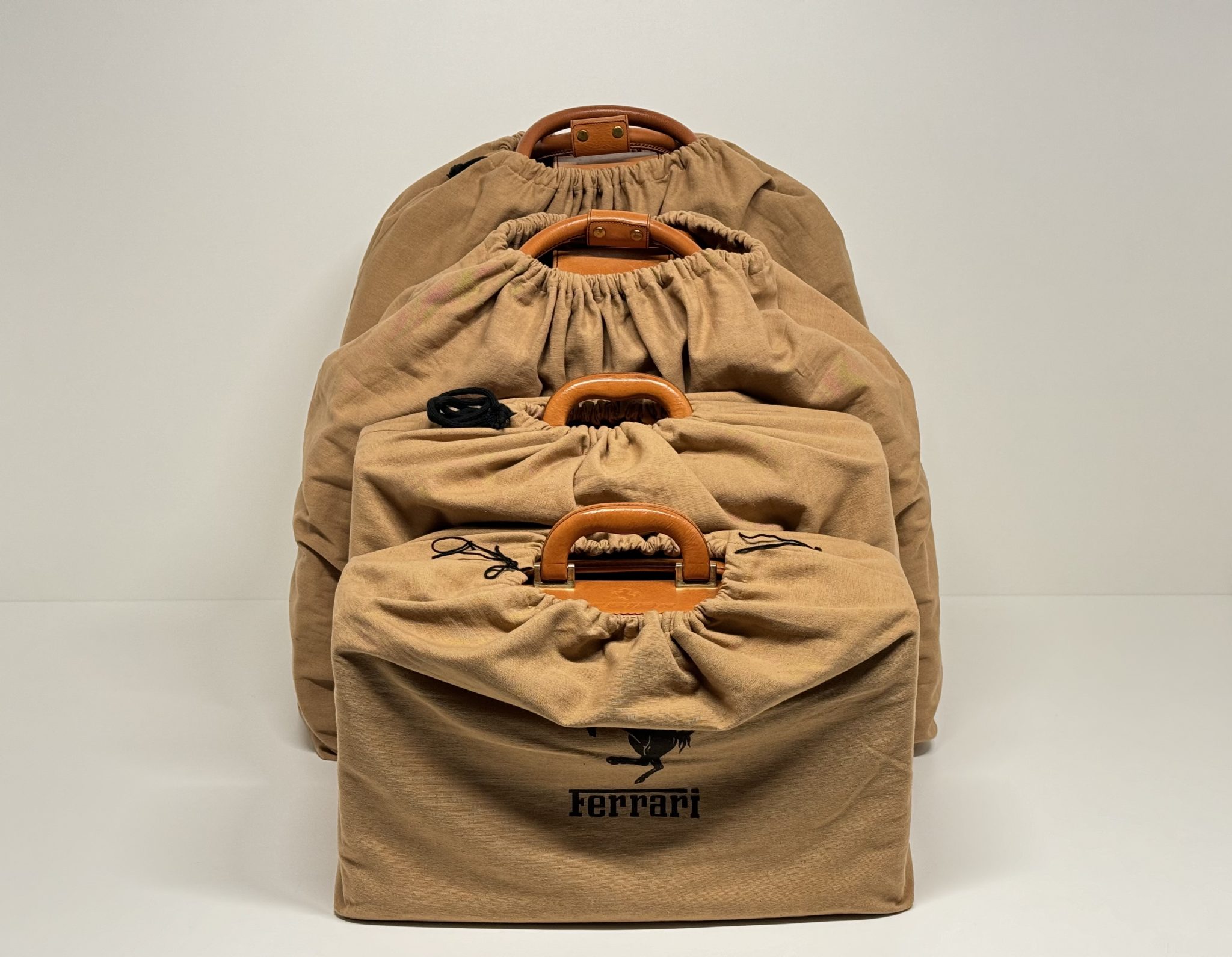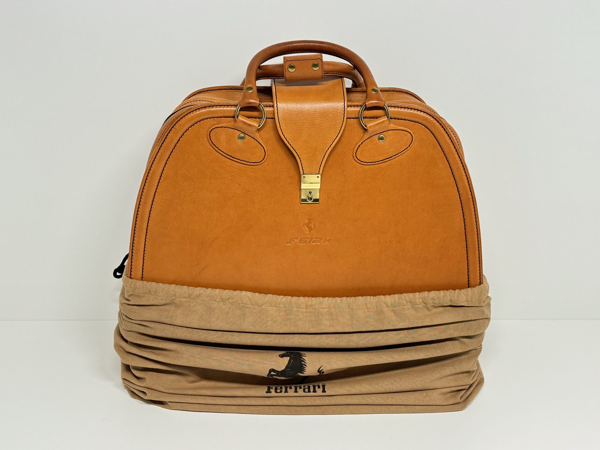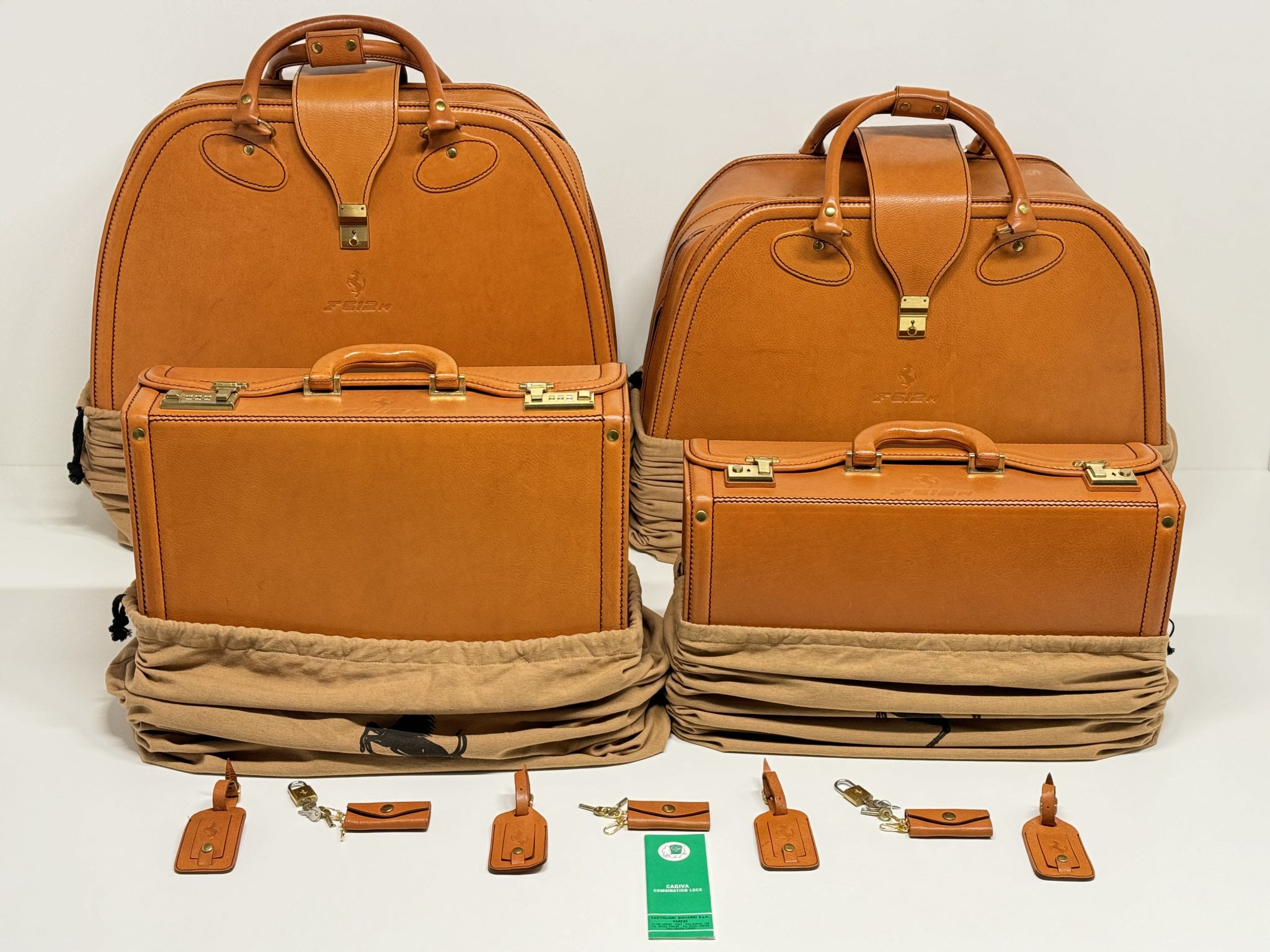 This collection includes two large soft-sided bags, each featuring leather twin-loop handles, black YKK zippers, and a leather closure strap with brass hardware. Each piece is debossed with a prancing horse and F512 M logo. The zippers can be locked closed with the included padlocks, and the brass clasps are secured with a key.