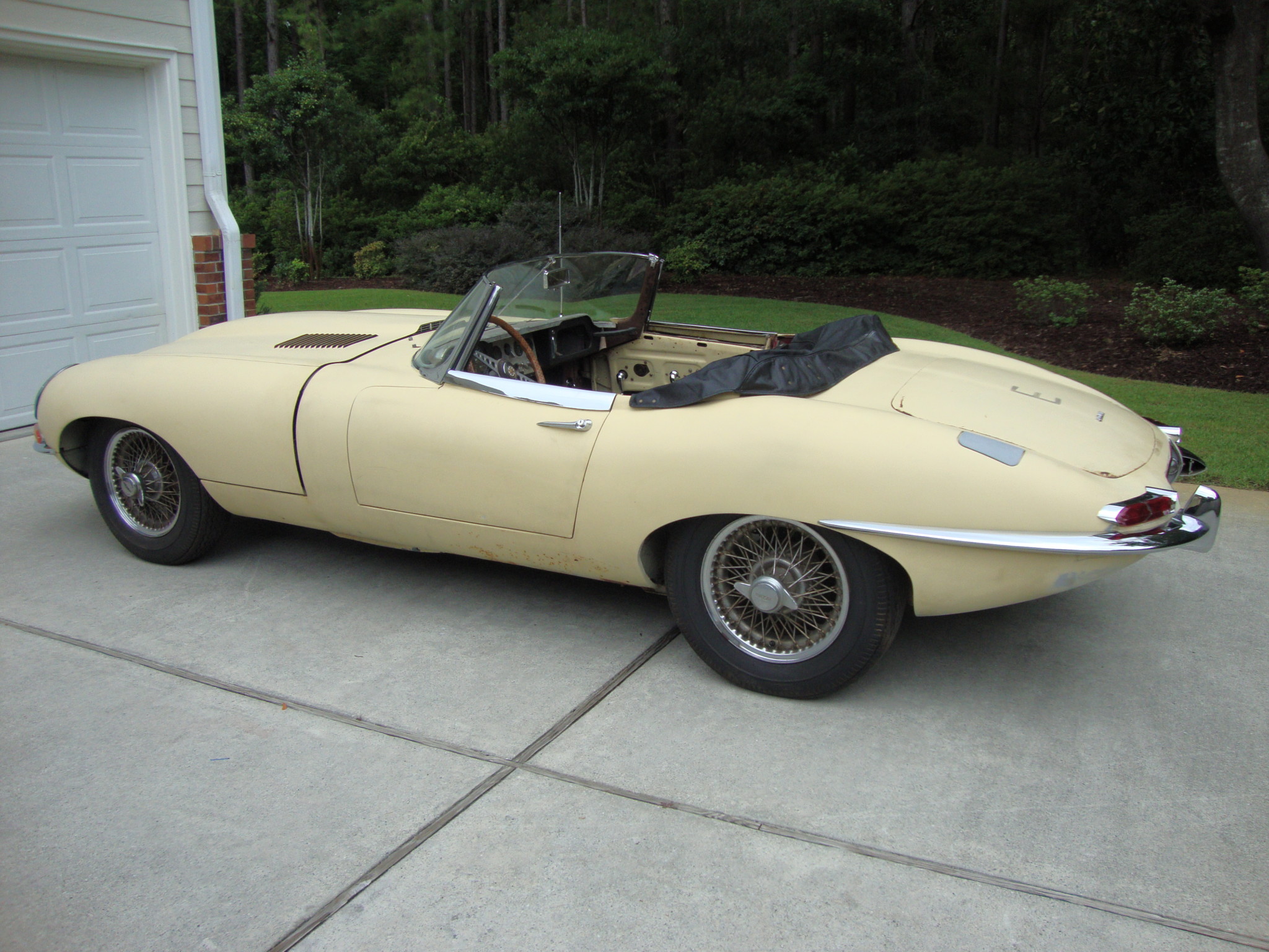 Knock-off wire wheels show corrosion and wear two-eared spinners and mismatched older tires. The black soft top is torn and missing its rear window.