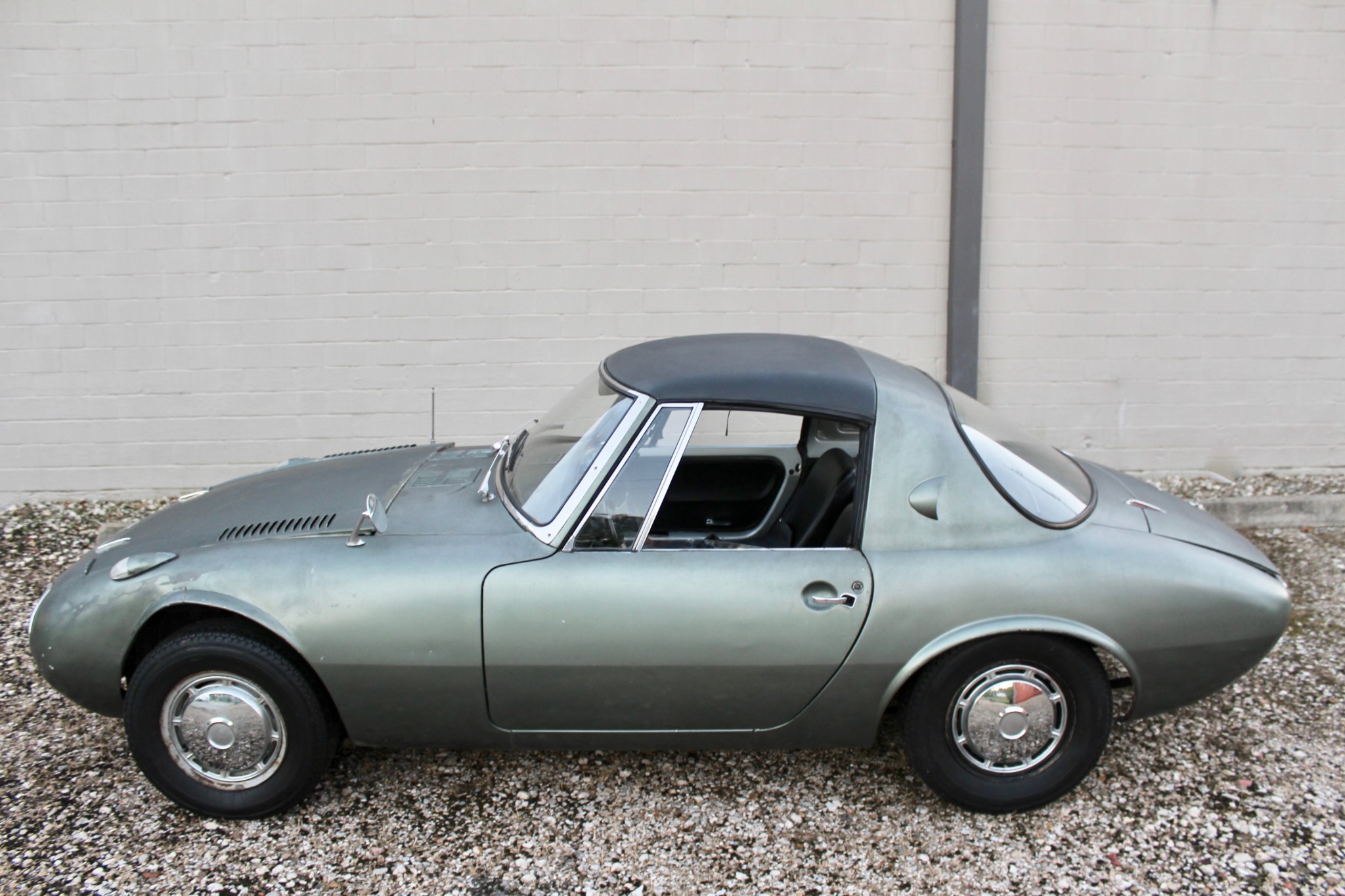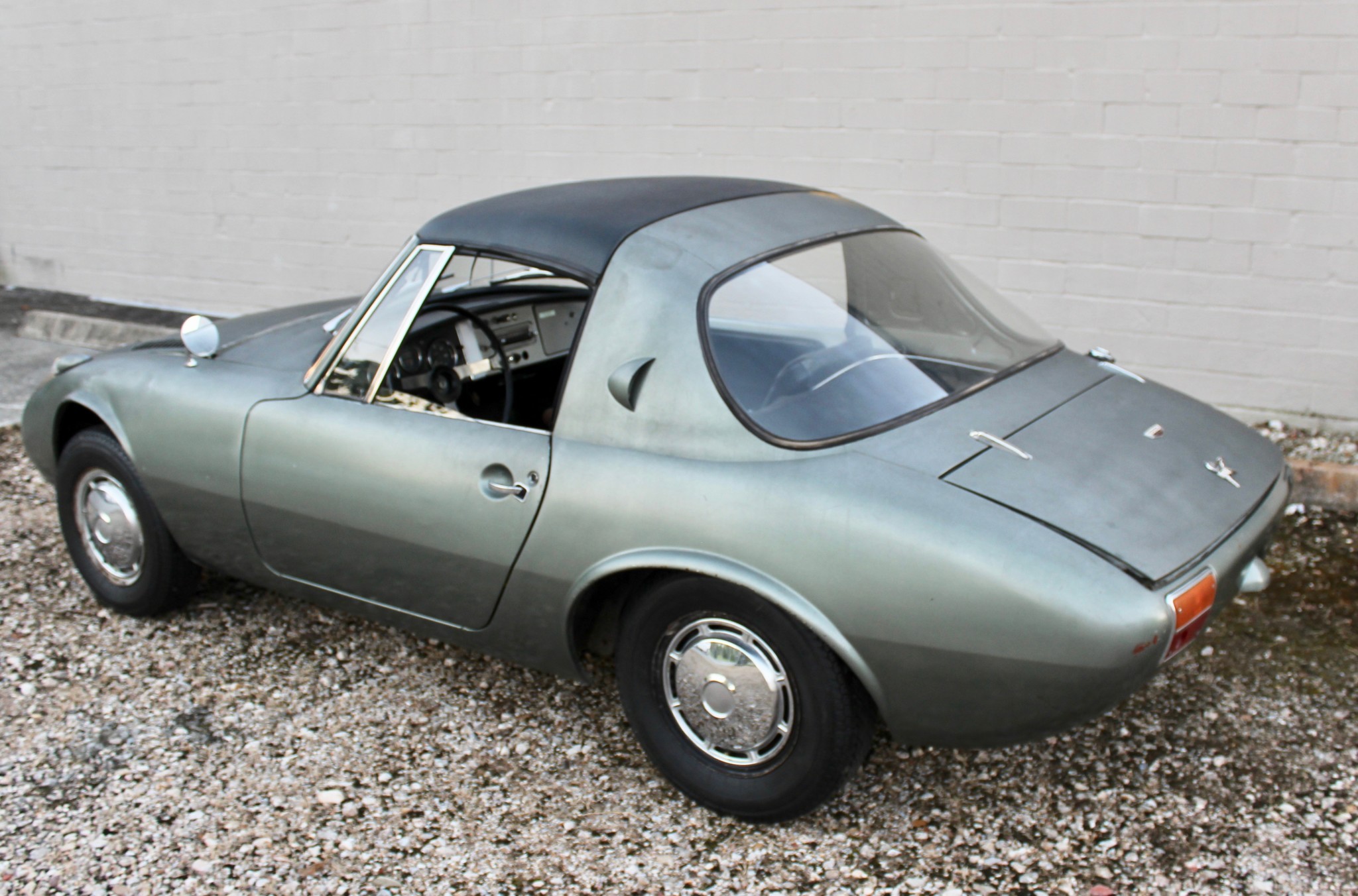 More than 3,100 Sports 800s were produced, though only about 300 were left-hand drive. The 12″ steel wheels on this example wear polished hubcaps and show corrosion.