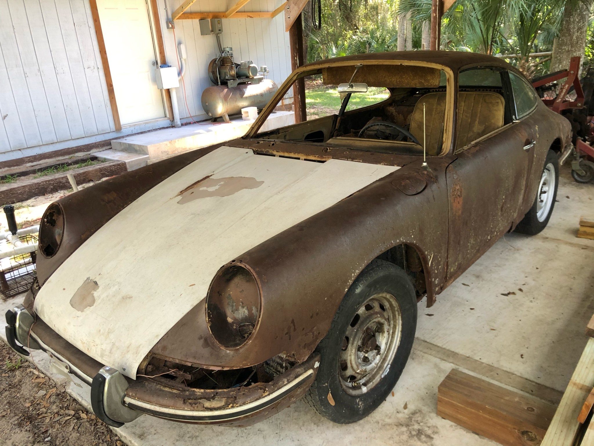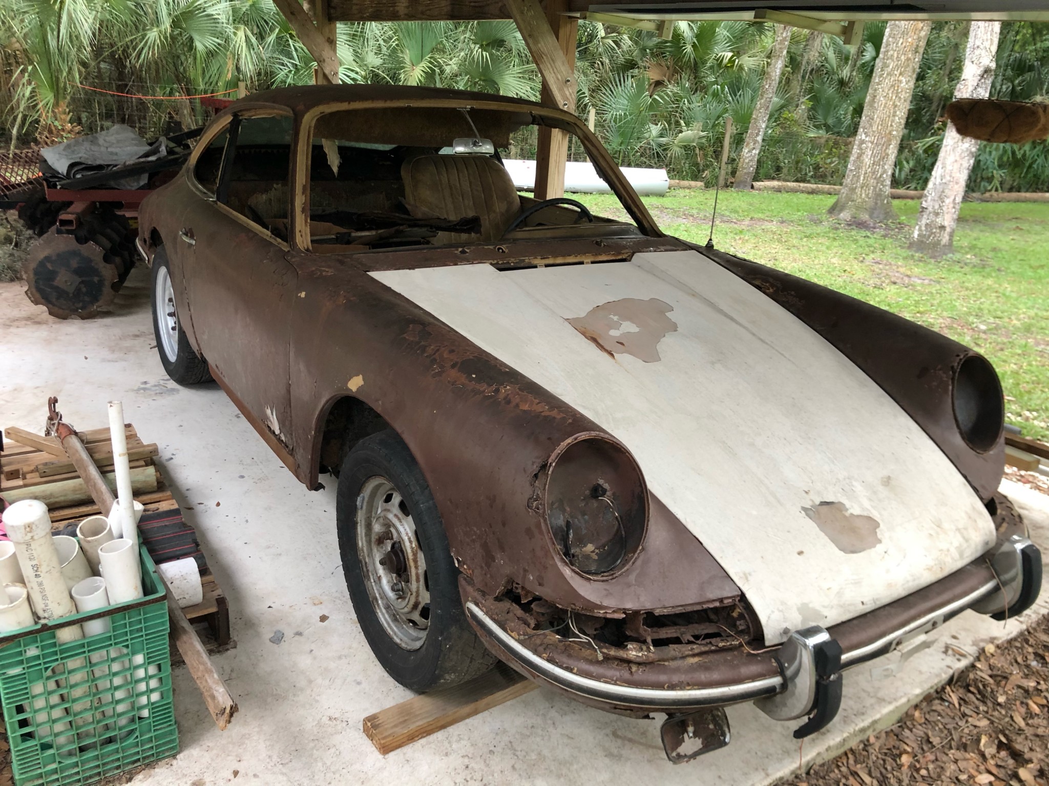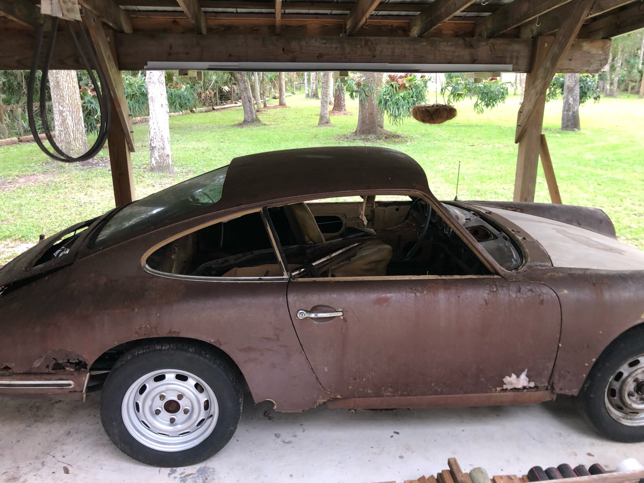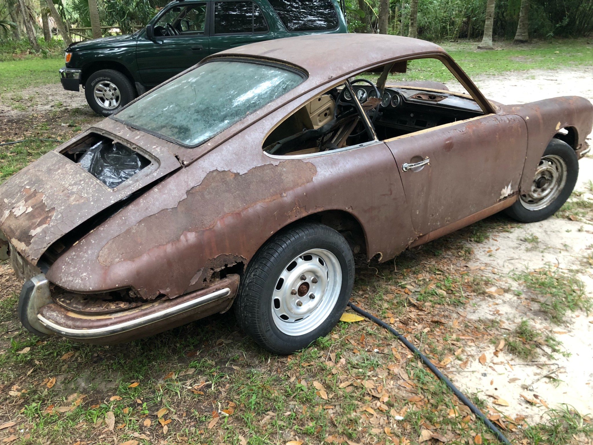 Replacement 15″ steel wheels are mounted in the rear, with older ones remaining on the front. Replacement studs have been added to the hubs, and the suspension and braking systems are said to remain.