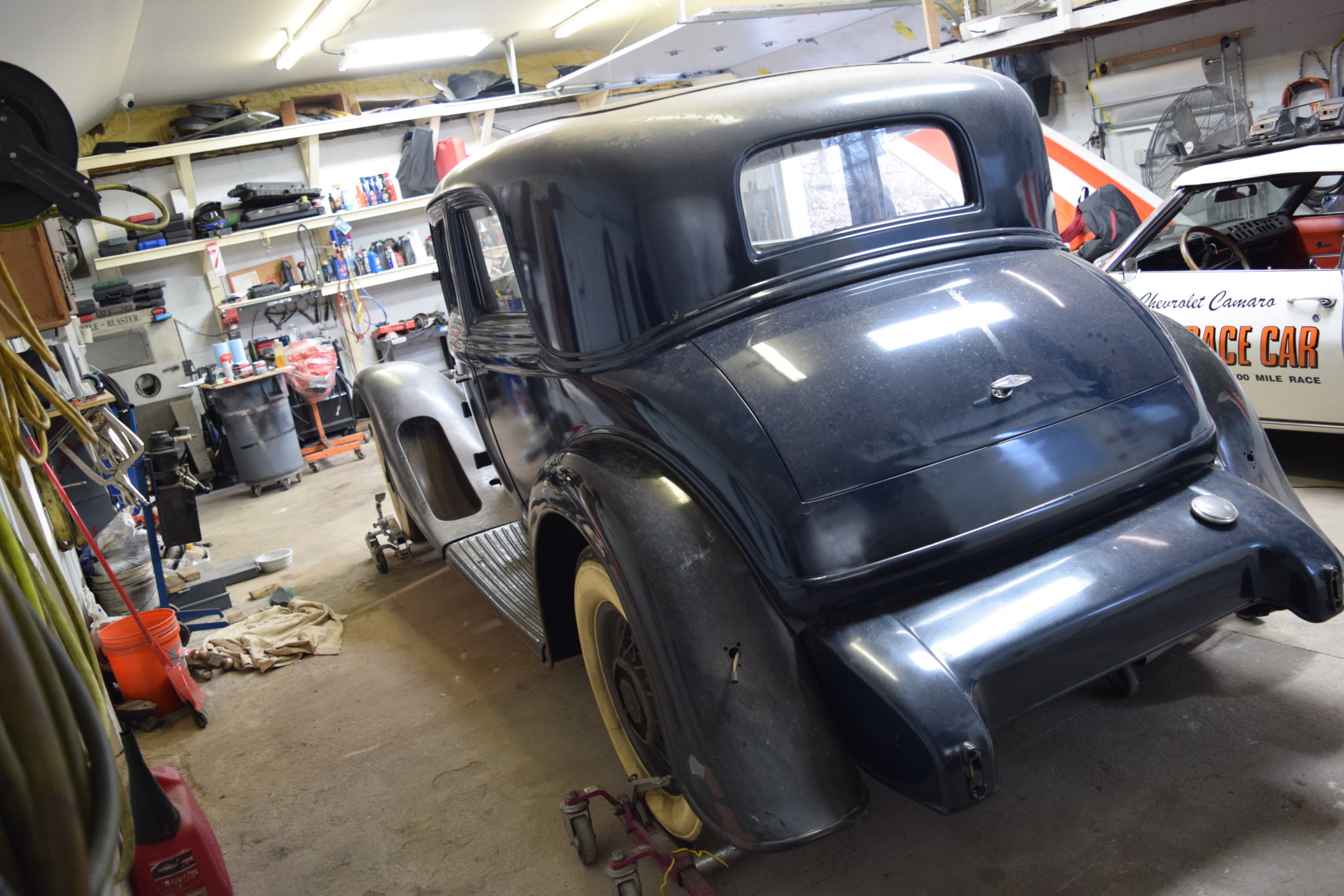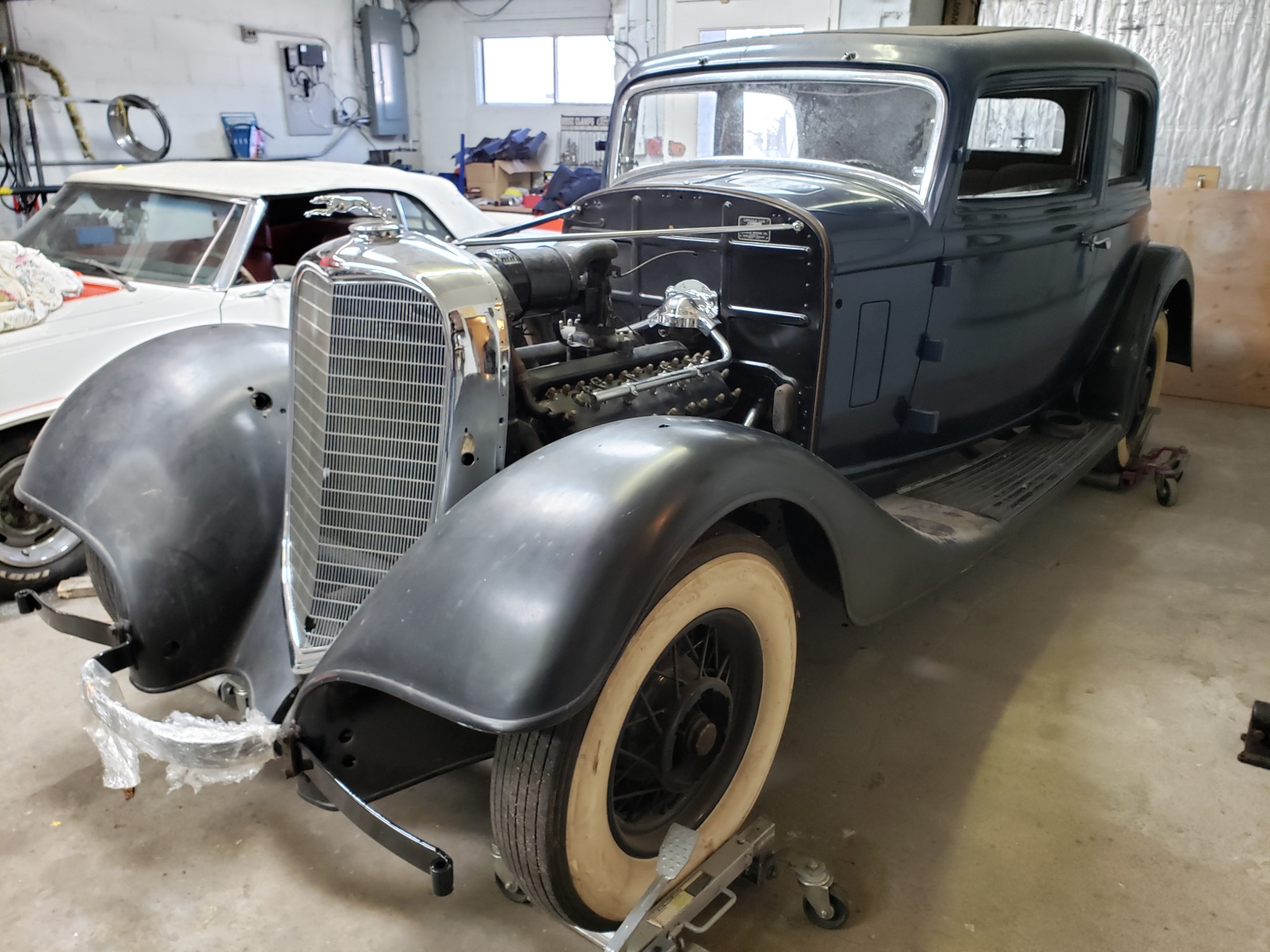 Spoked 18″ wheels are painted in matching blue and wear 7.00-18 whitewall tires. Spares can be mounted on both sides of the car, and two spare wheels mounted with tires are included in the sale. Factory equipment included an adjustable-pressure braking system and thermostatic shock absorbers that would self-adjust for temperature.