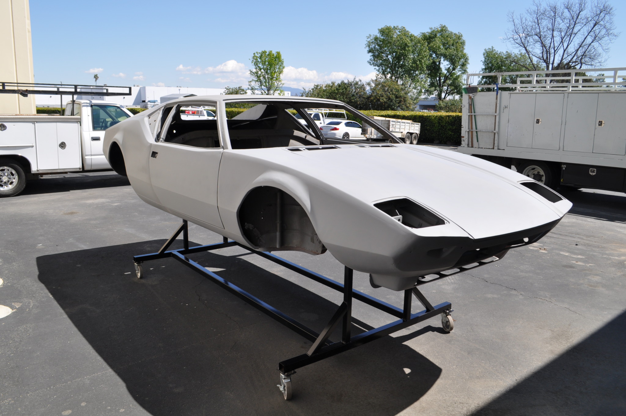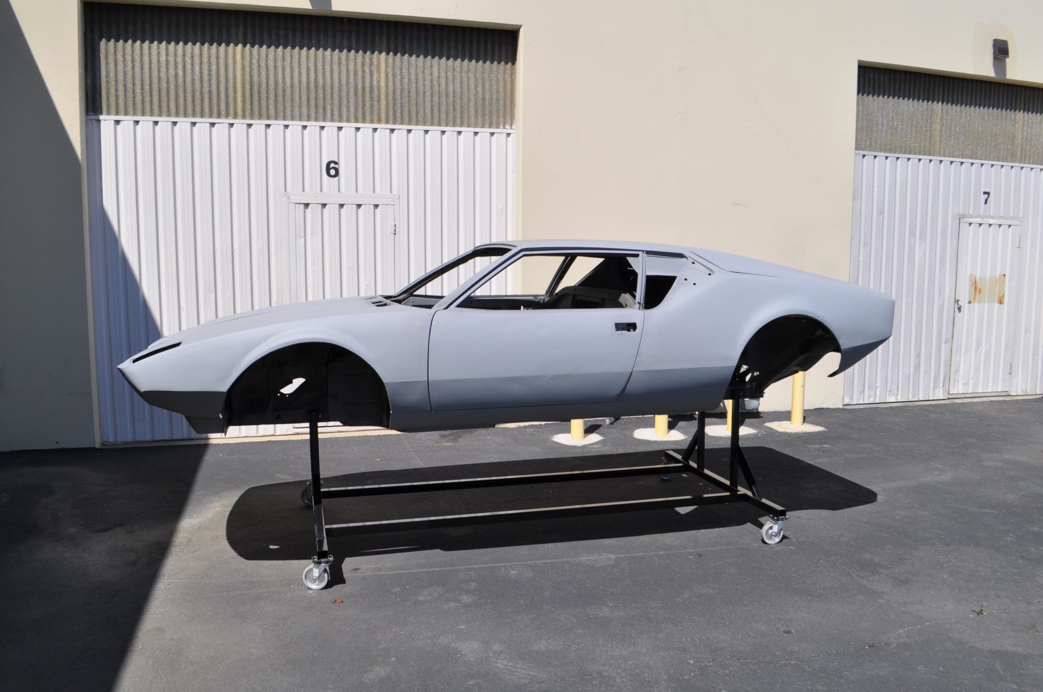 Images of the body in a bare-metal state as well as after application of primer can be seen in the photo gallery below, along with closeups of welded repairs. Front and rear bumpers are included, as are a DeTomaso emblem and script and unrestored metal trim for the windshield, door frames, and drip channels. Refurbished cowl grilles and finned quarter window trim are also included, as are glass panels, though the rear window is said to require replacement. Two headlight assemblies, two pairs of European-market taillights, and a pair of US-market taillights are included, along with a license plate lighting fixture and aftermarket side mirrors. The body panels were adjusted to accommodate European-market side markers in lieu of US units.