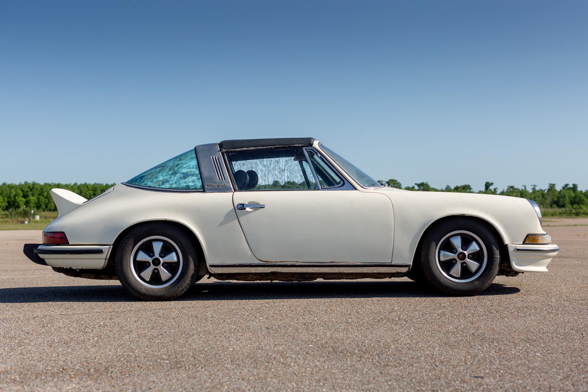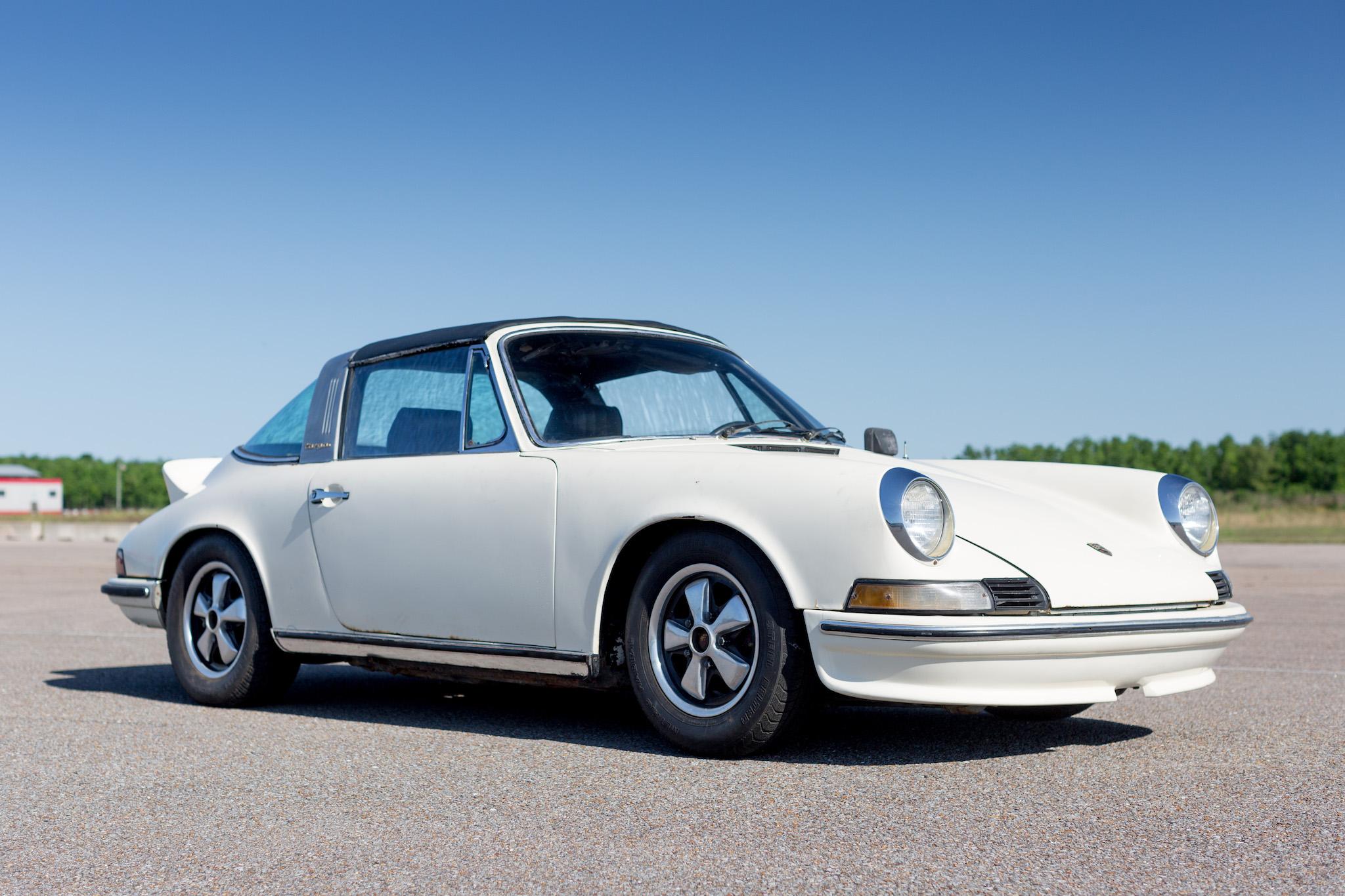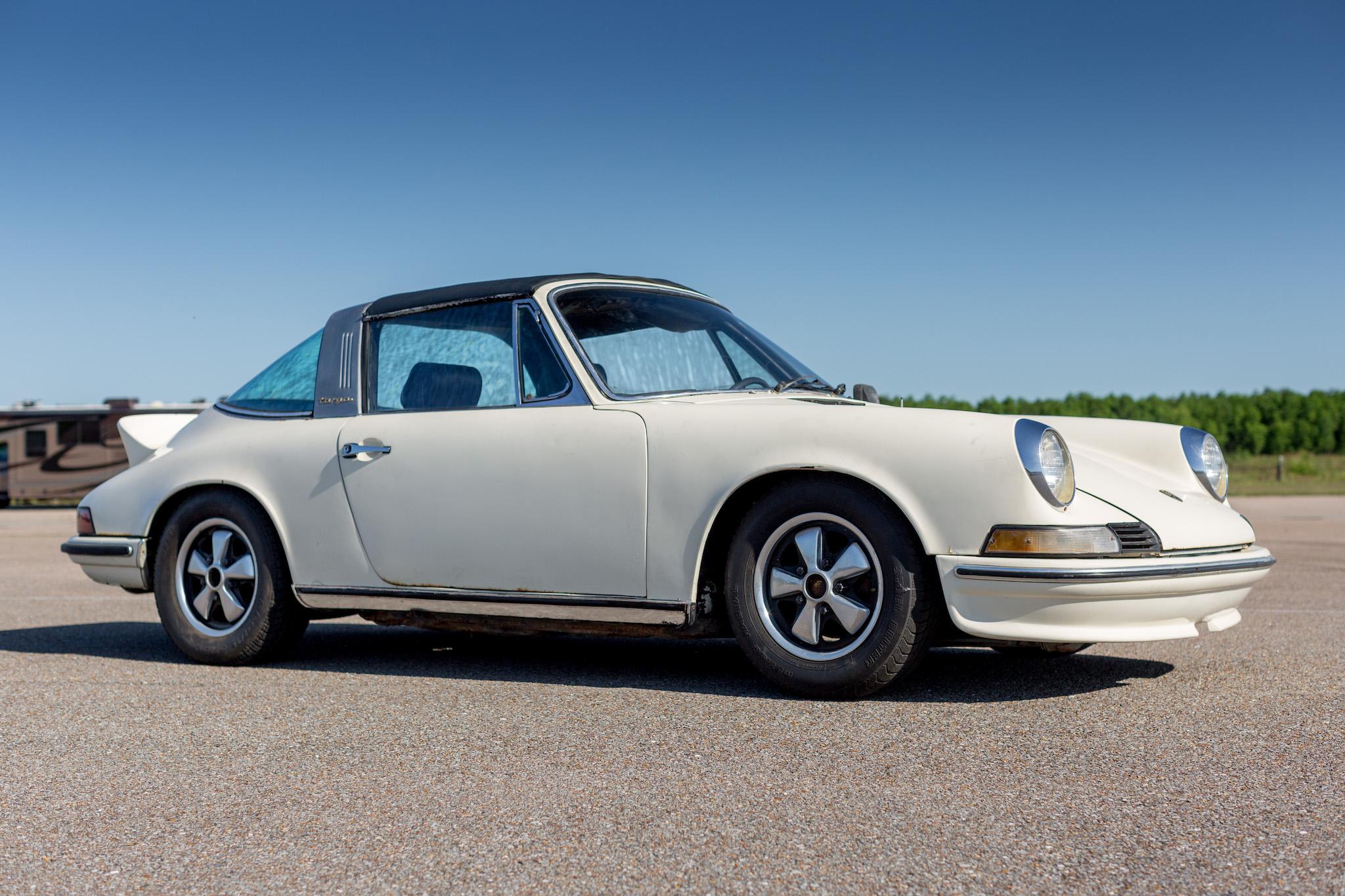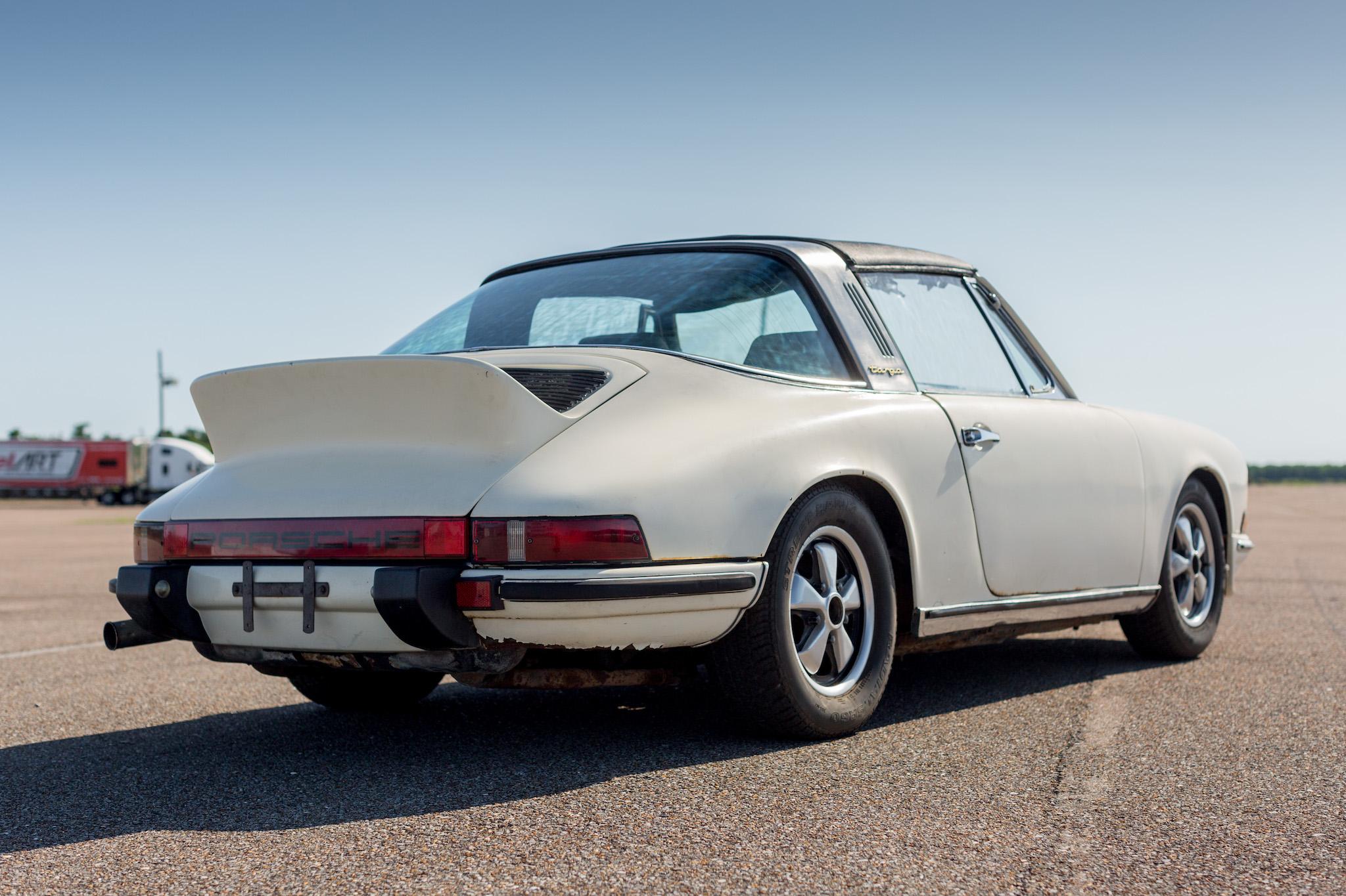 Fuchs wheels are missing their center caps and wear mismatched older 15″ tires, while the brake calipers have been freed for transport. The gallery shows rust in the rocker panels, the included replacement deck lid, and photos of the car as it was acquired by the selling dealer.