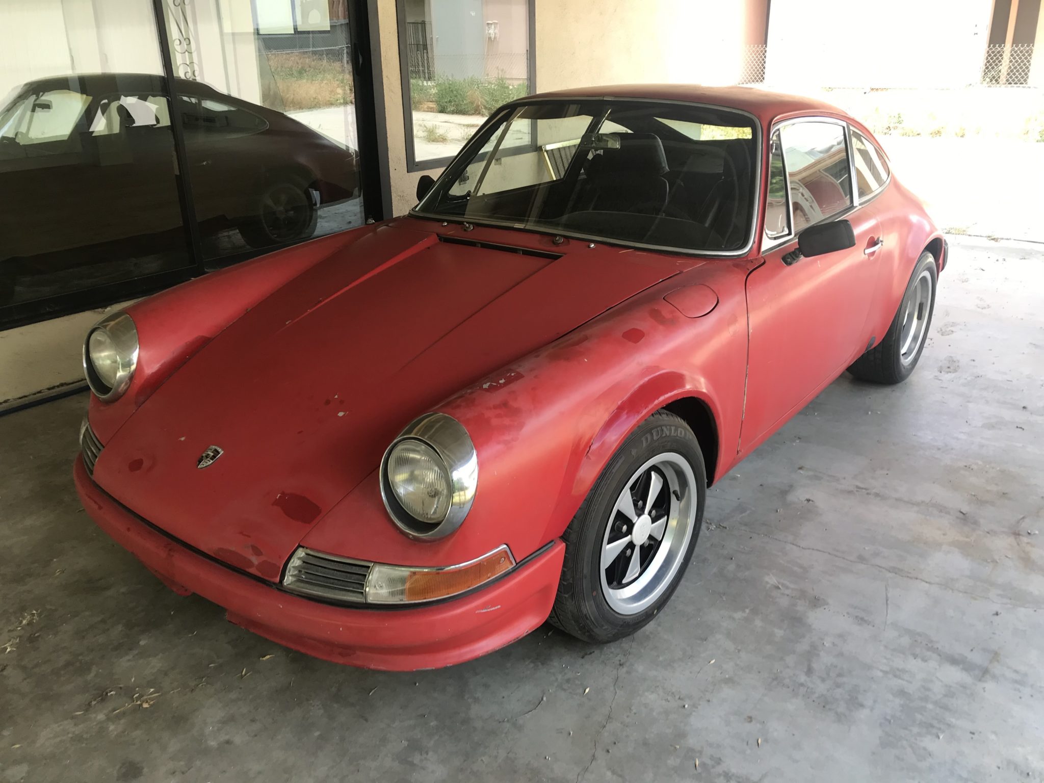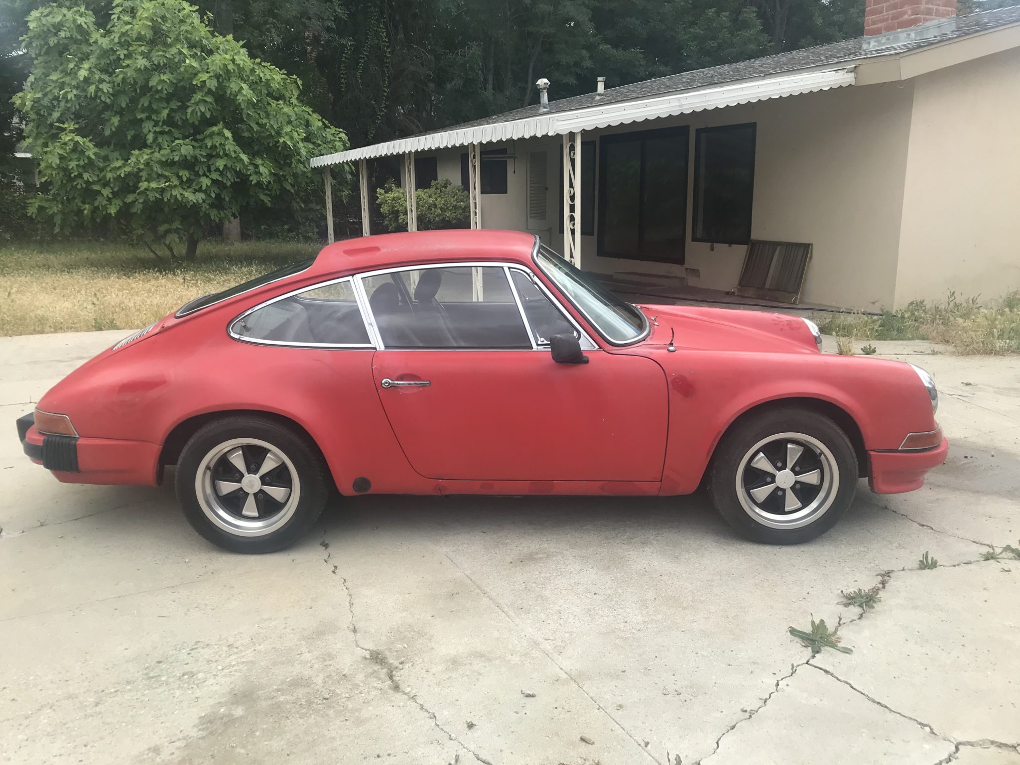 Staggered-width 15″ Fuchs-style wheels measure 7″ in width up front and 8″ at the rear and wear a mixed set of tires, all of which show cracking. A spare 15×6″ Fuchs-style wheel is included in the sale.