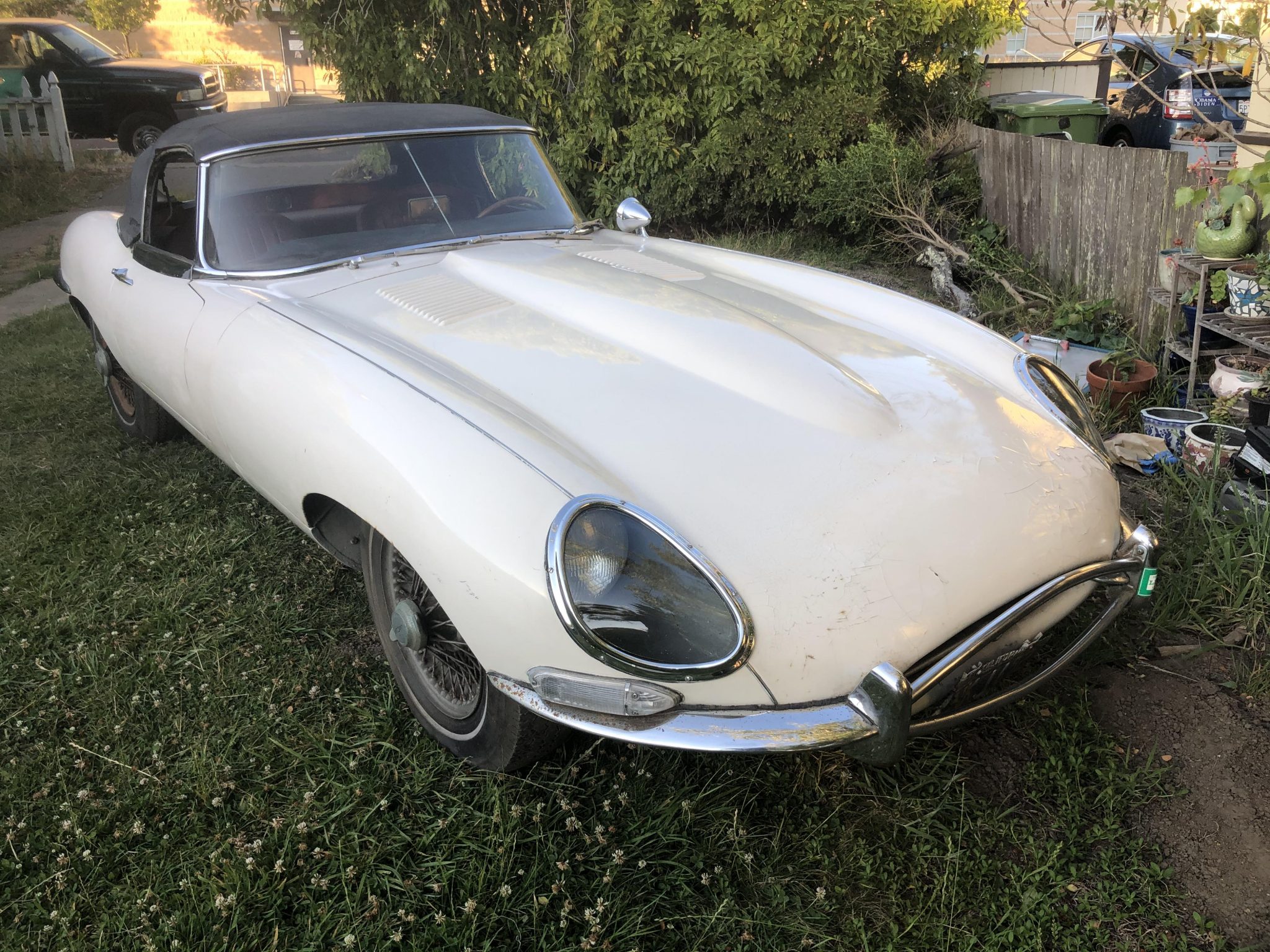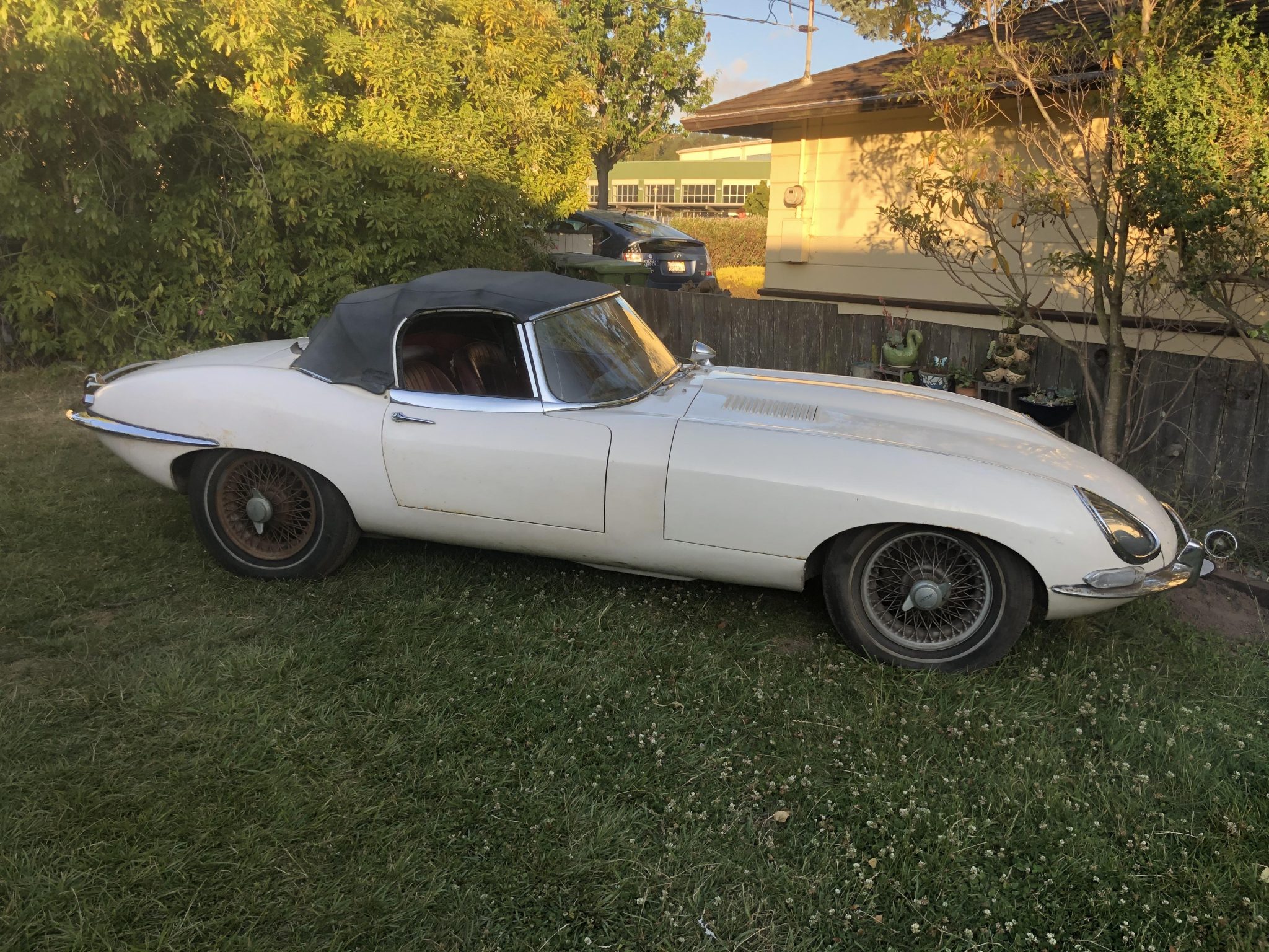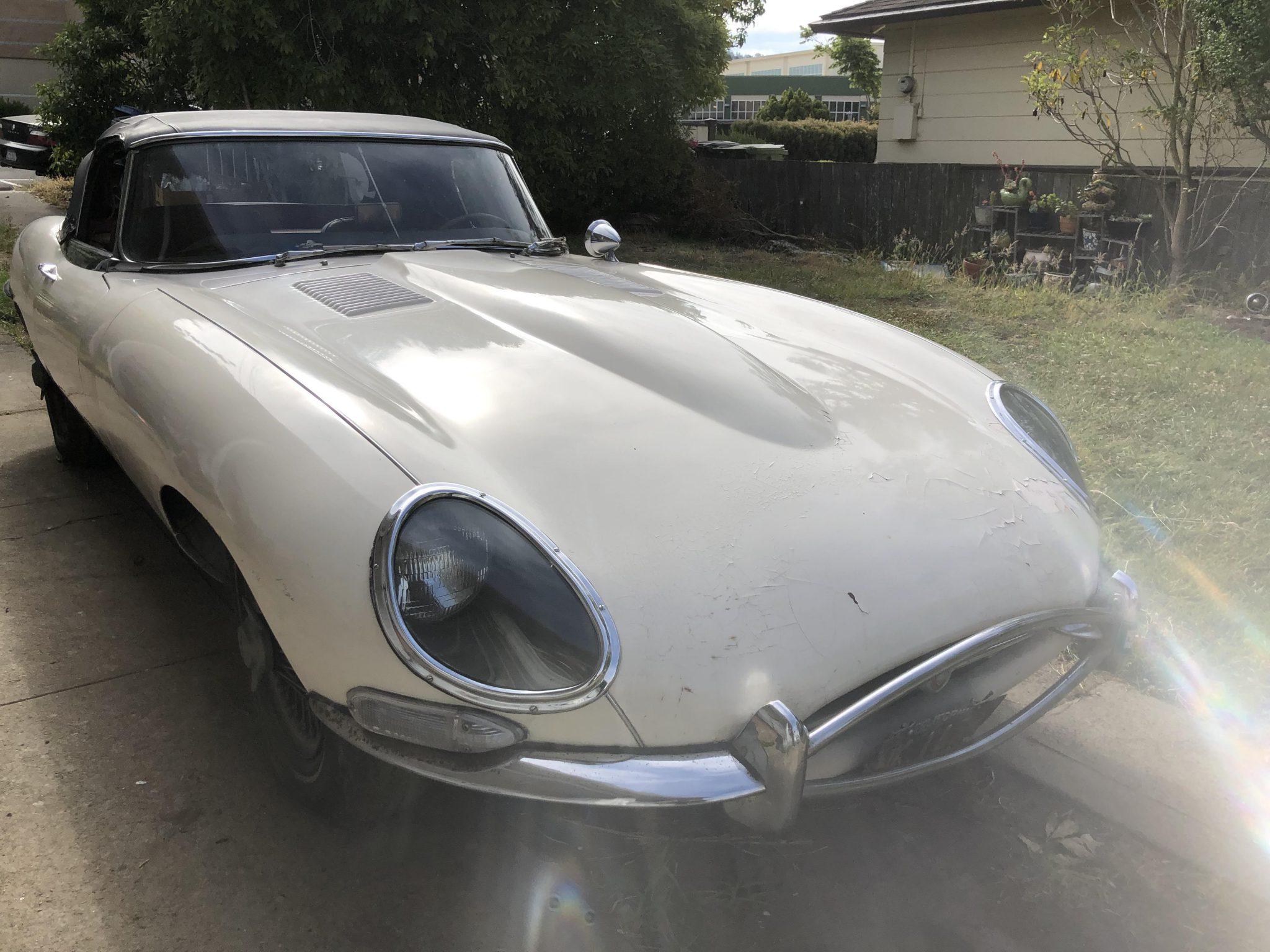 Rust-covered 15″ wire wheels with two-ear Jaguar knockoffs wear aged and cracked radial tires. A 1993 registration tag is affixed to the black California license plate at the rear of the car, and a matching plate is attached to the lower front fascia.