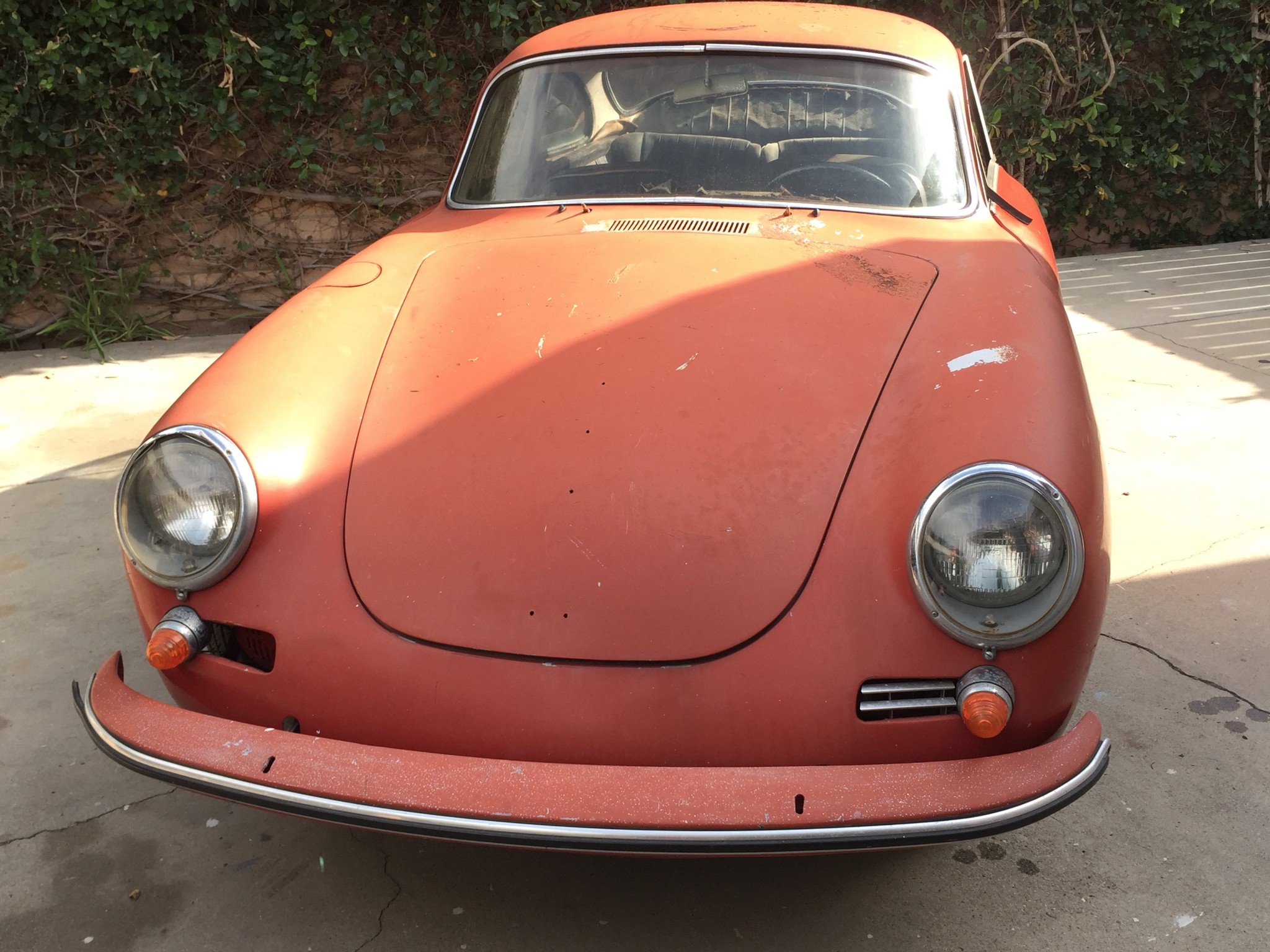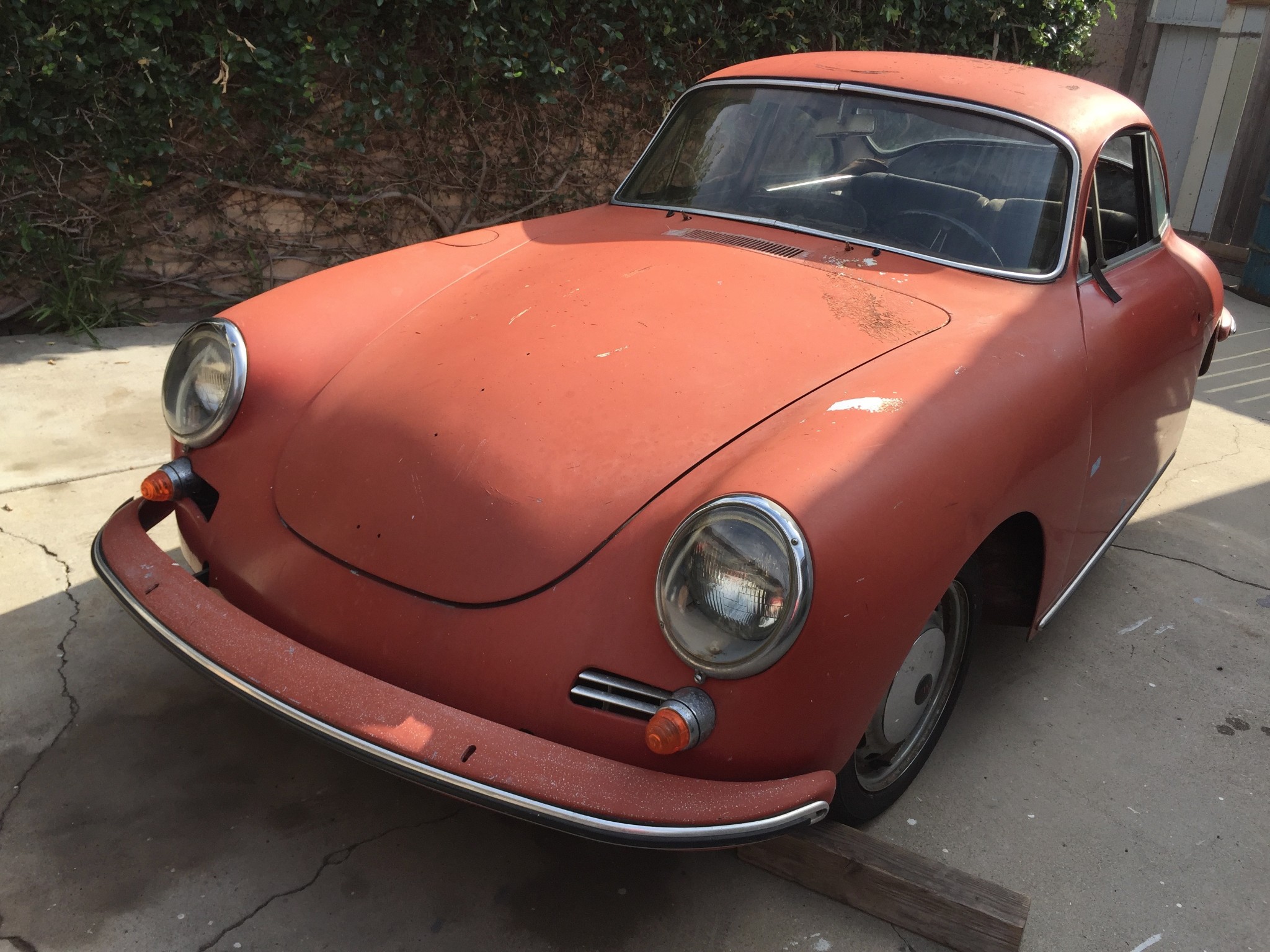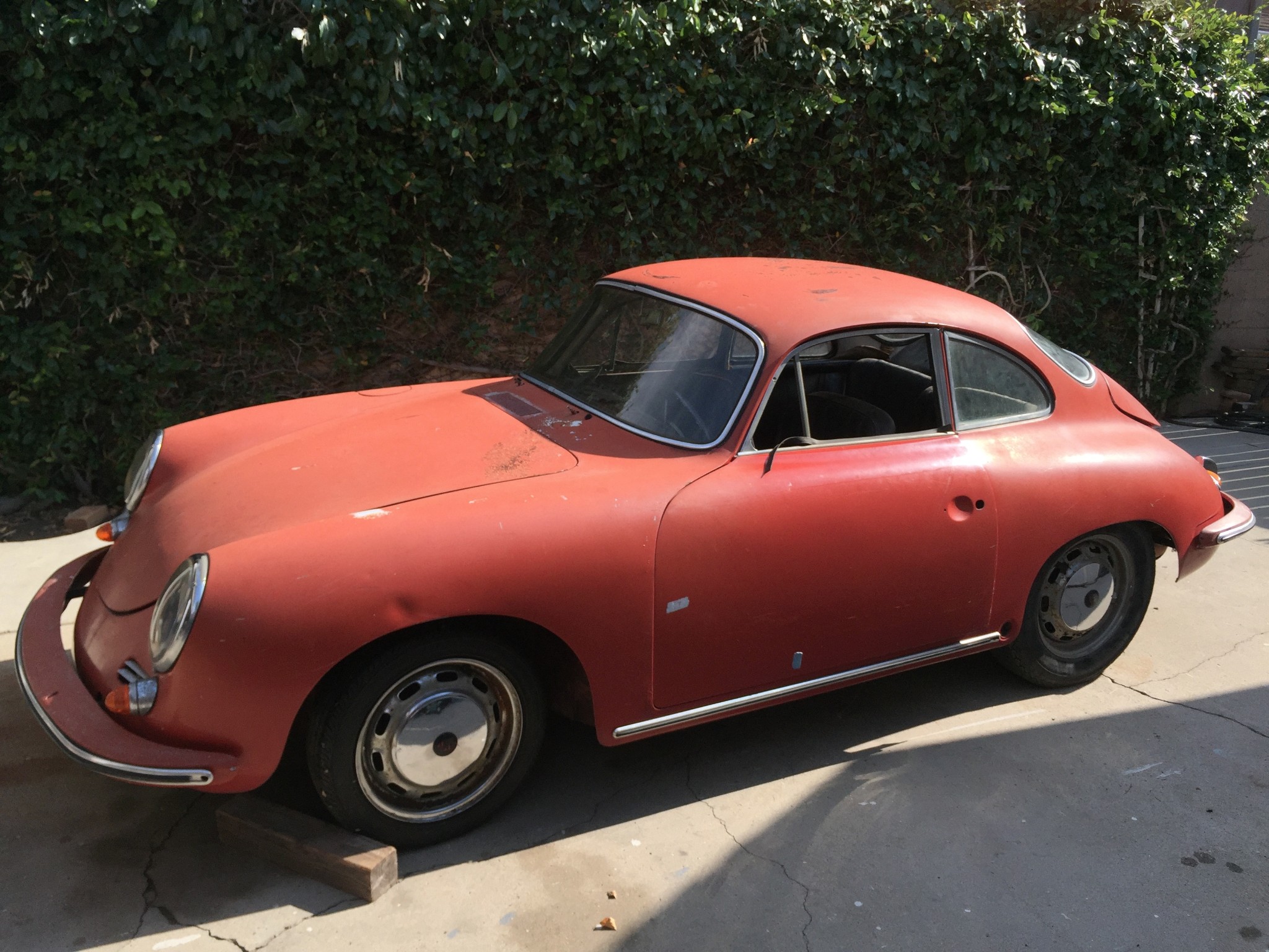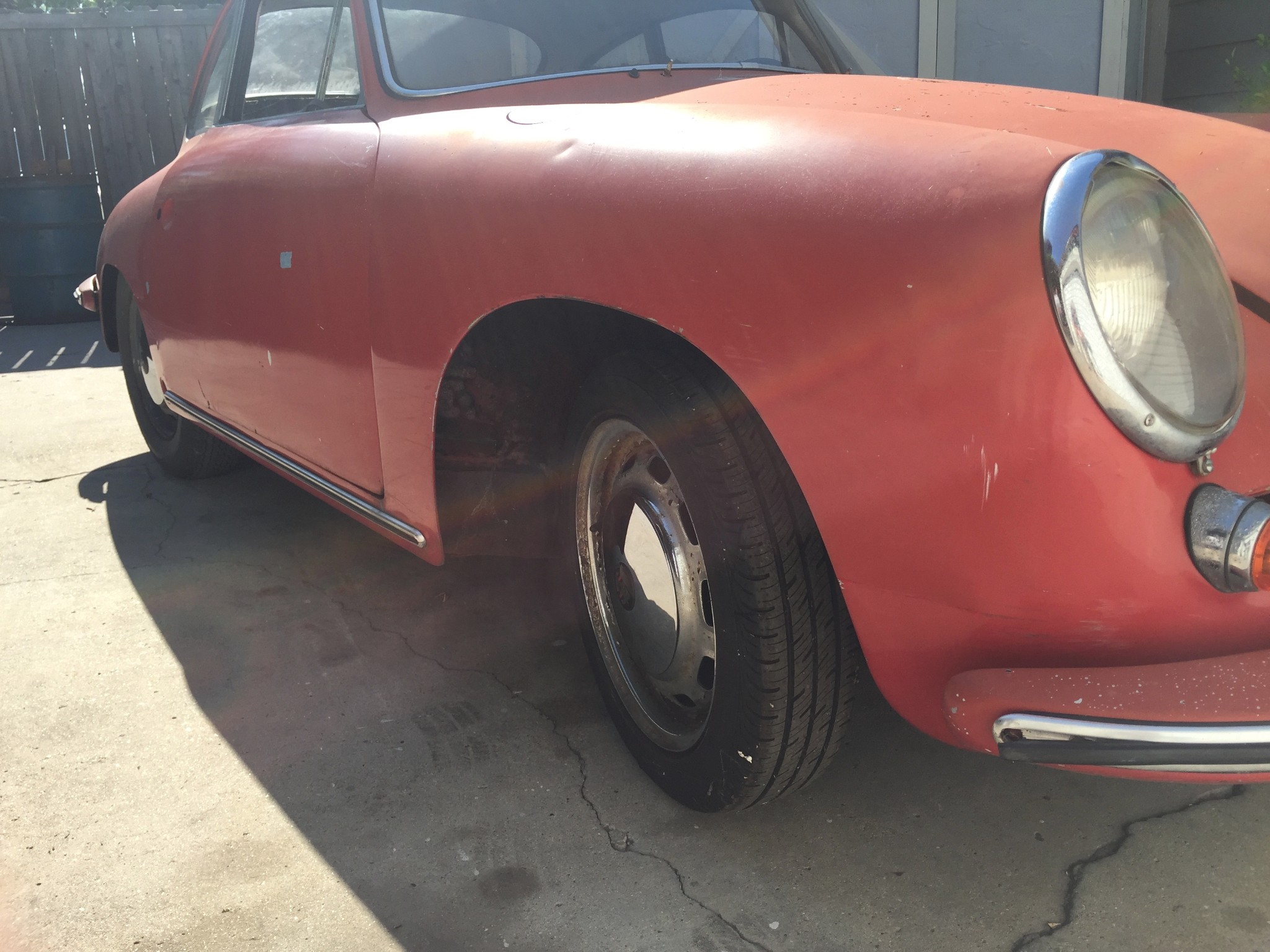 Optional equipment consisted of an antenna, chrome wheels, and a deluxe horn ring as confirmed by the Kardex. A collection of original parts that were removed during the paint and bodywork process include the hood trim with Porsche crest, badges, bumper strips and overriders, door handles, and more. Stock 15″ steel wheels are fitted with chrome hubcaps and show some corrosion and flaking paint.