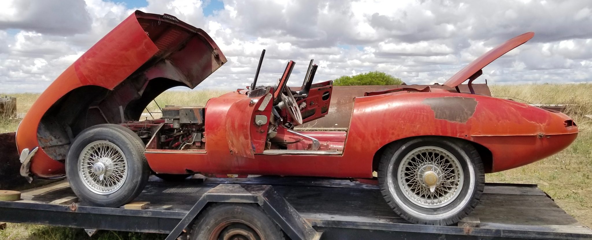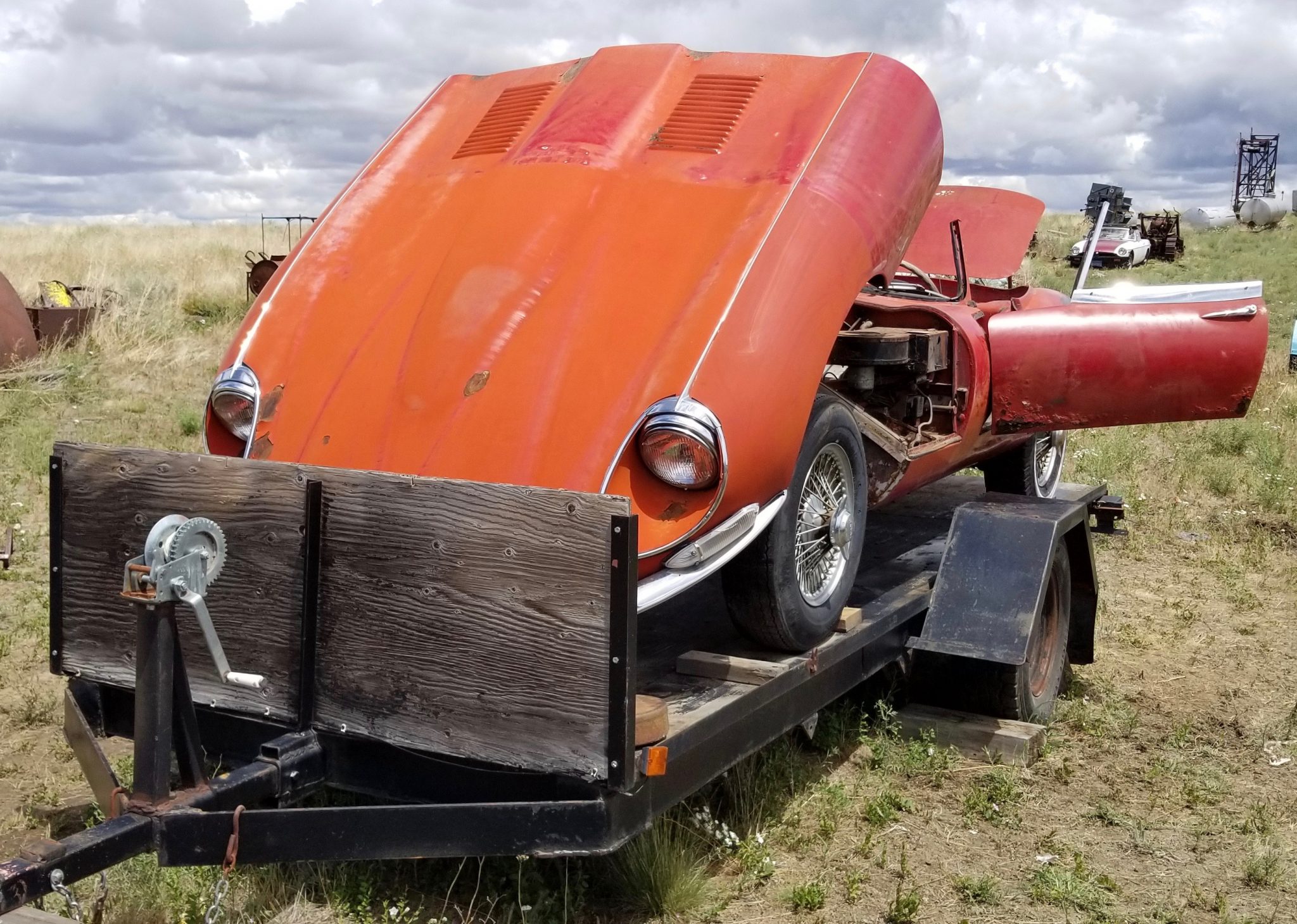 The wire wheels feature knock-off hubs and are wrapped in older mismatched tires. A matching spare is mounted in the rear storage area.