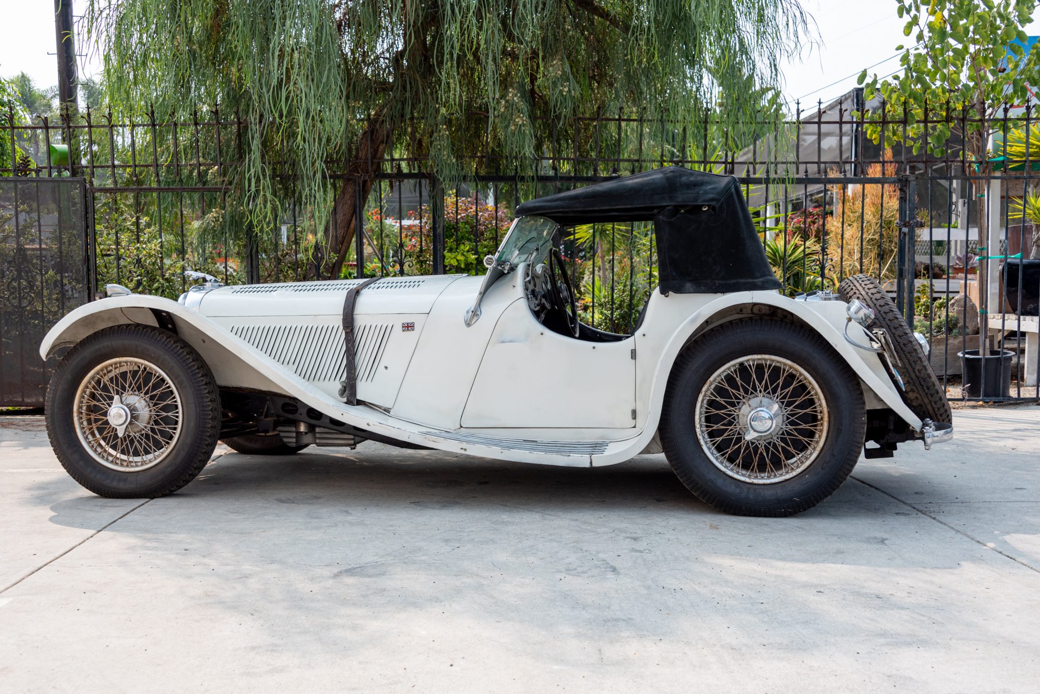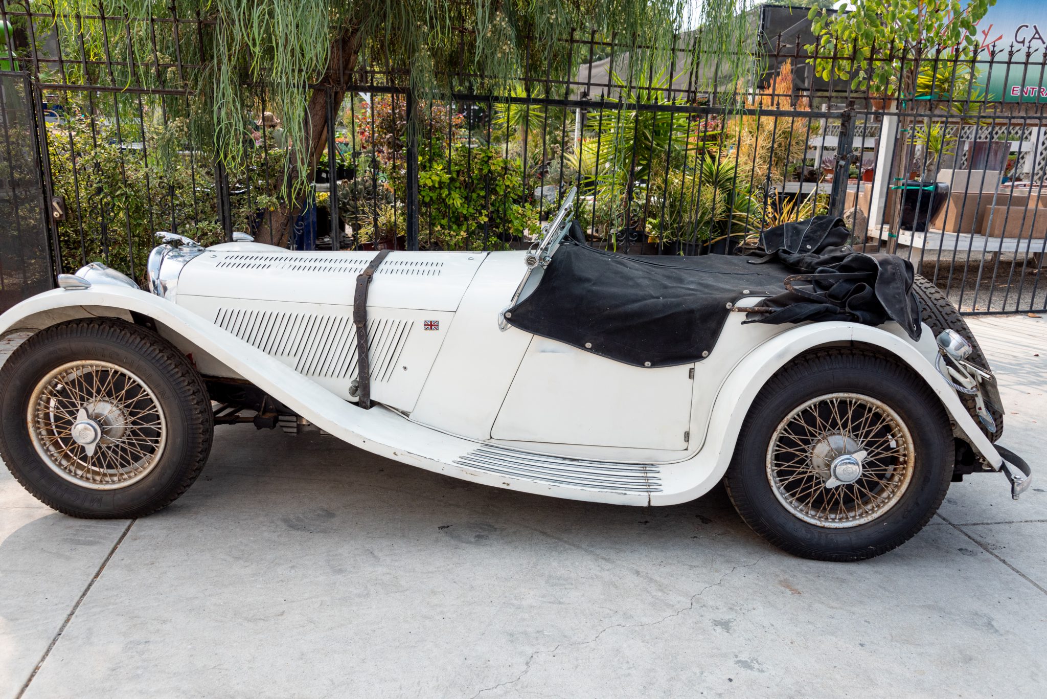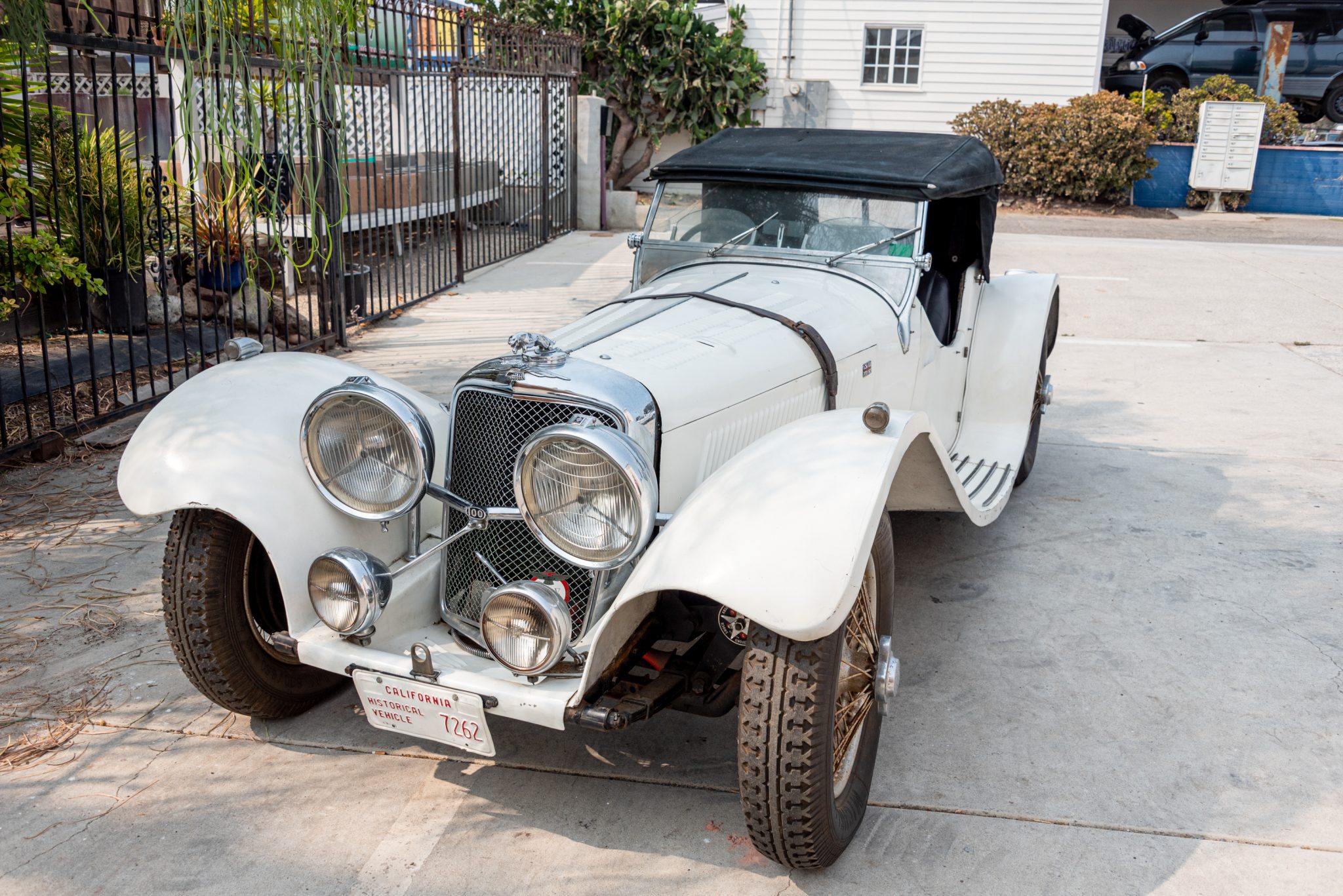 Factory 18″ wire wheels with knock-off spinners wear an older set of Michelin tires, and a matching spare is mounted on the rear bodywork. Hydraulic drum brakes from an XK120 were reportedly fitted, and the front suspension incorporates Andre-Hartford-type shock absorbers. The snap-on tonneau cover is shown fitted in the gallery.