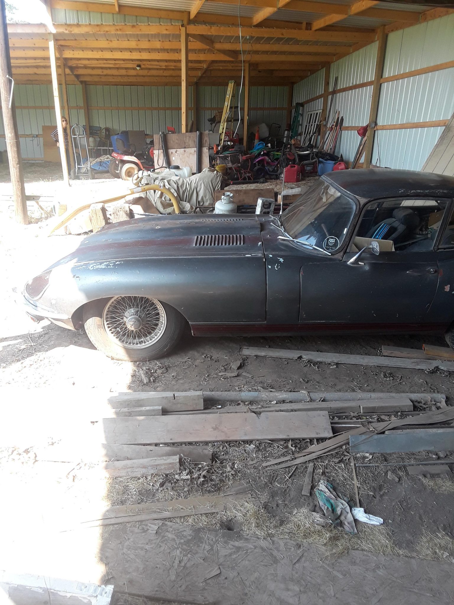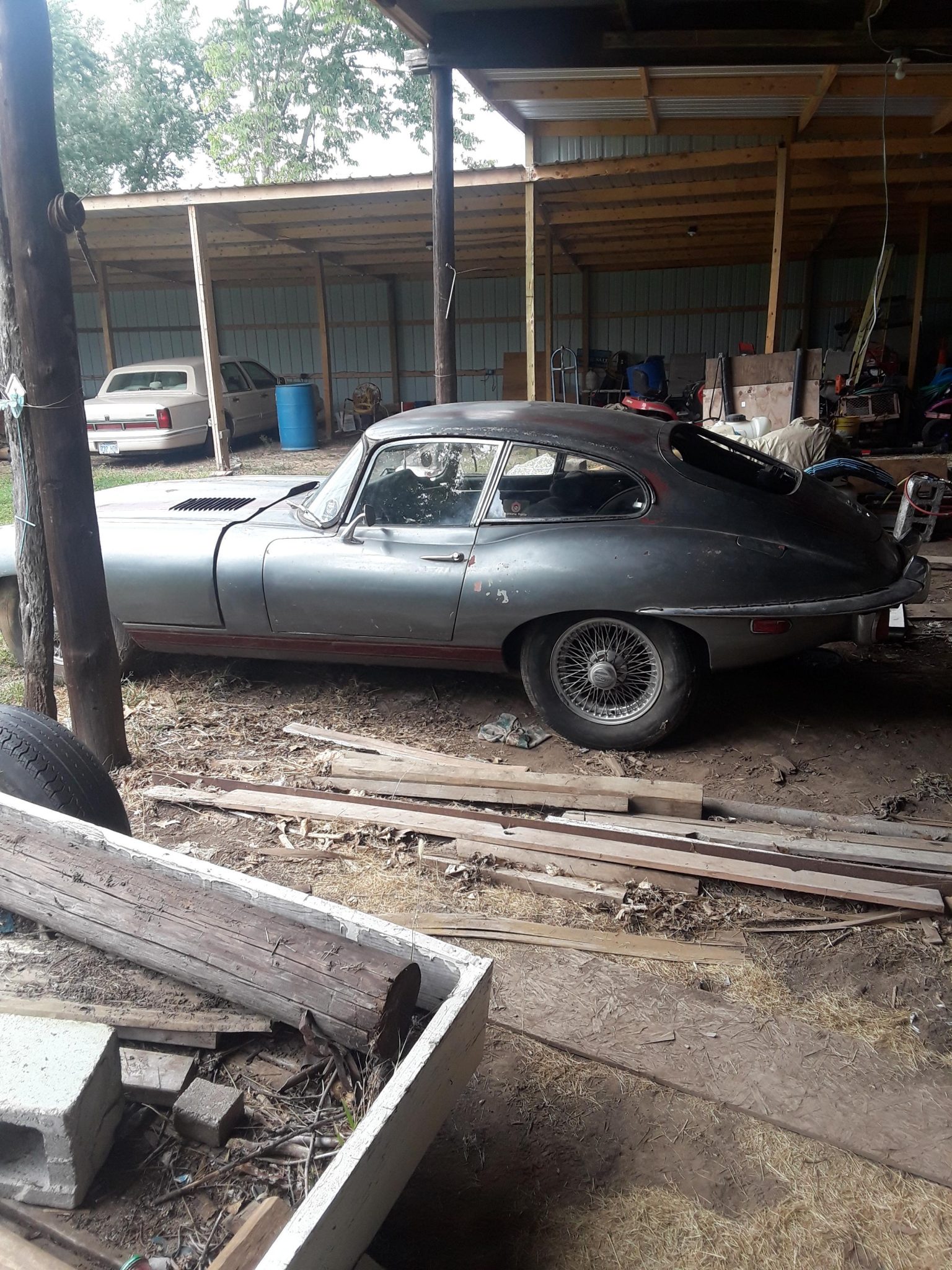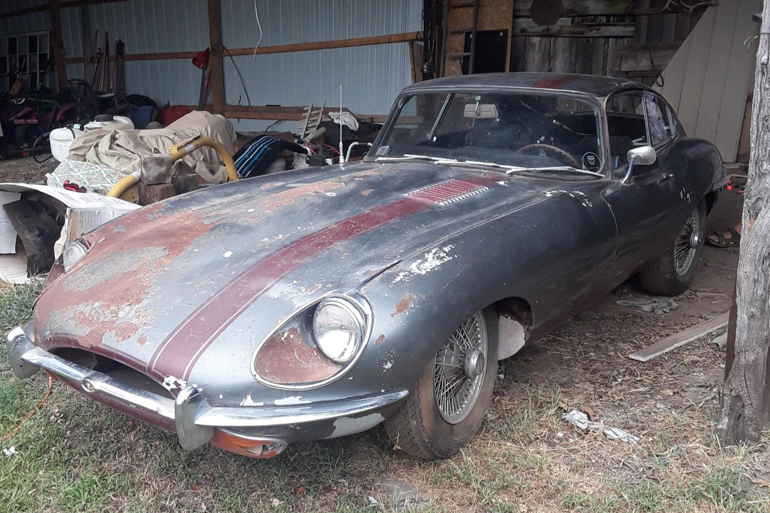 Chrome-finished 15” wire wheels secured with knock-off hubs wear mismatched tires. A spare is included in the sale.