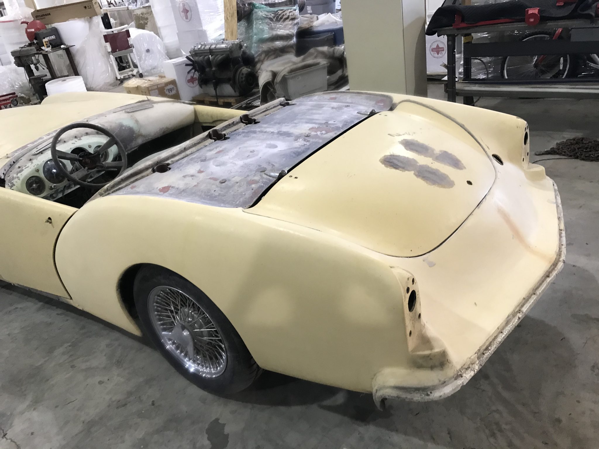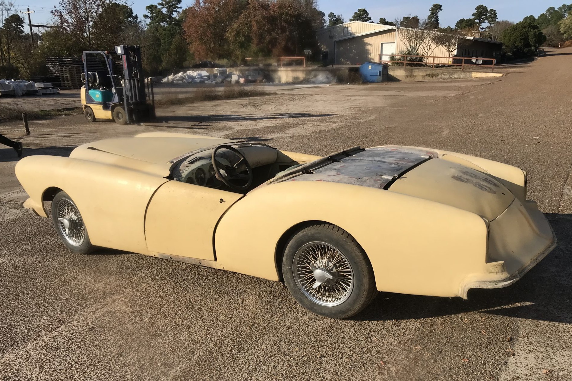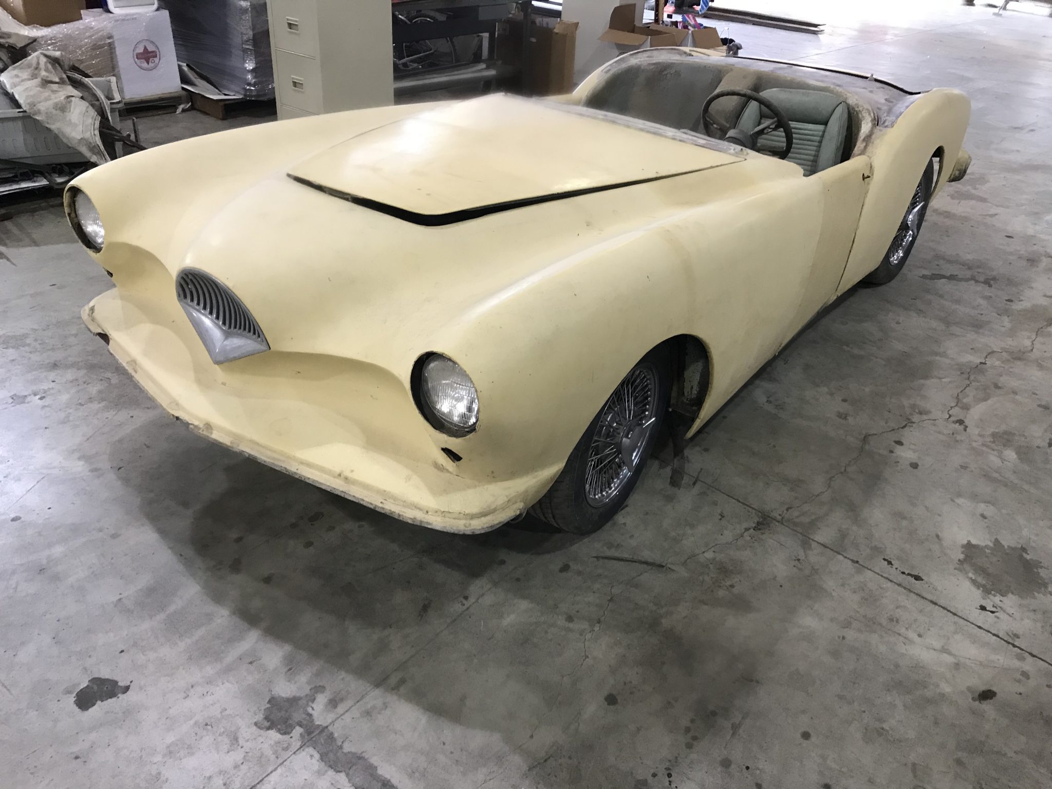 The 16” wire wheels feature knock-off hubs and are wrapped in older tires. The custom tube chassis features independent front suspension and four-wheel disc brakes.