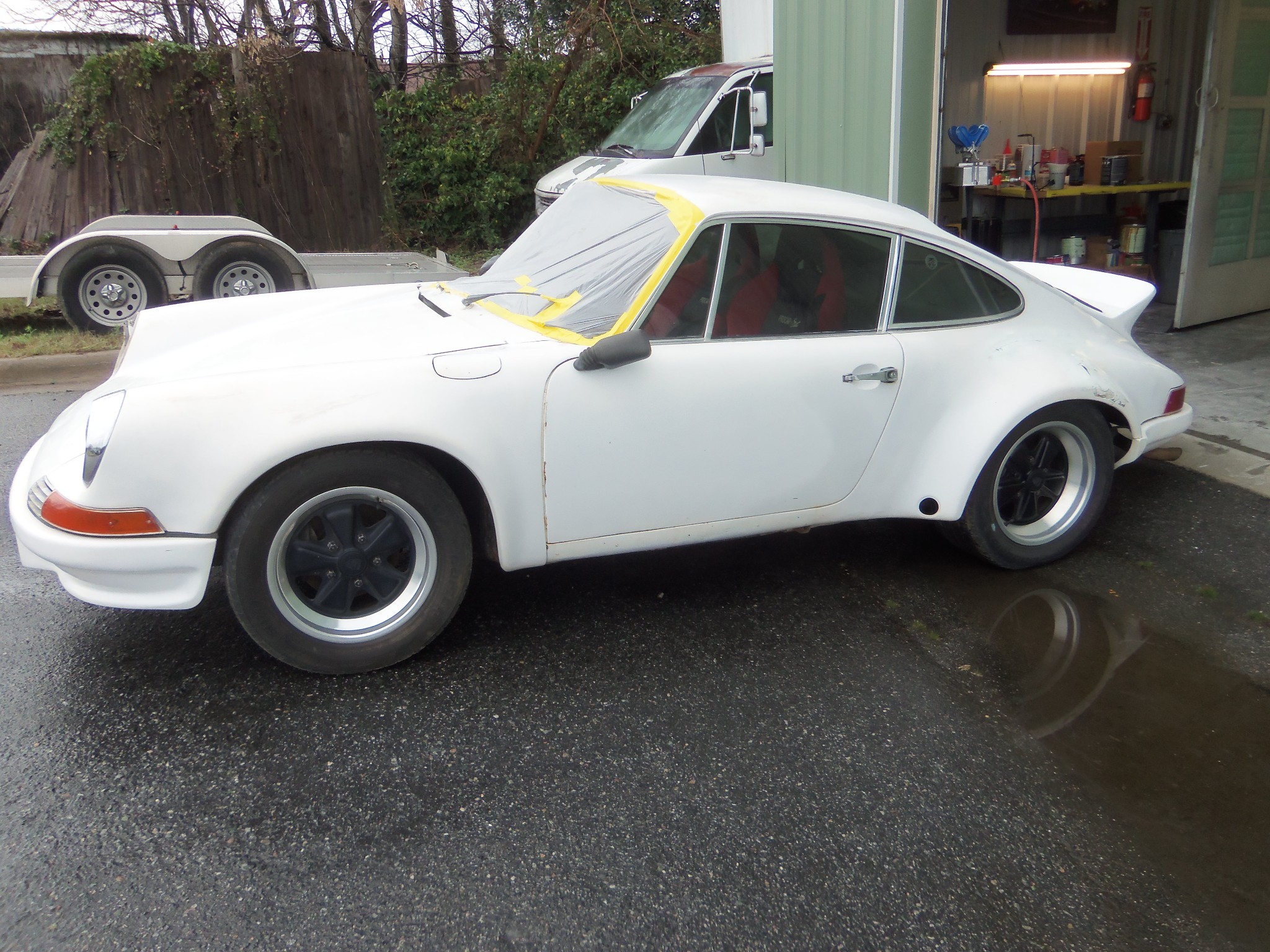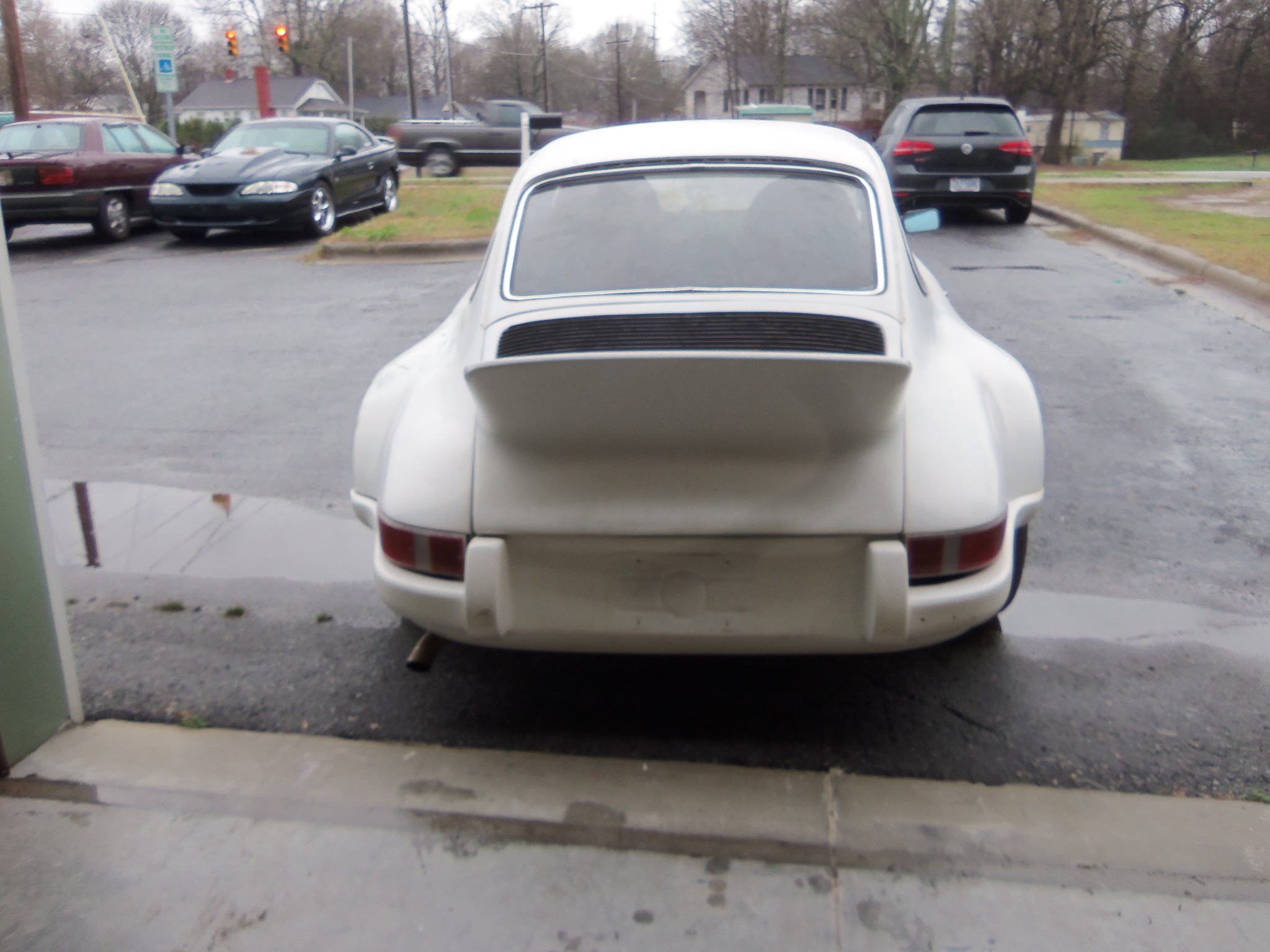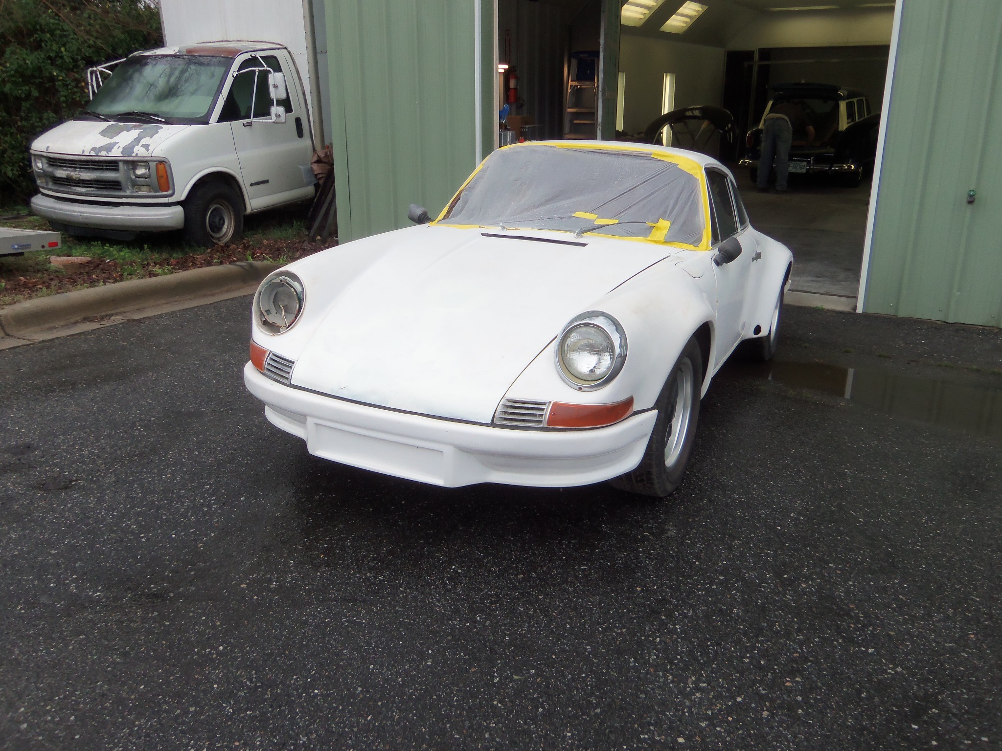 RSR-style fiberglass rear flares show damage and failing bodywork, but bumper covers and rear deck lid appear in relatively good condition.