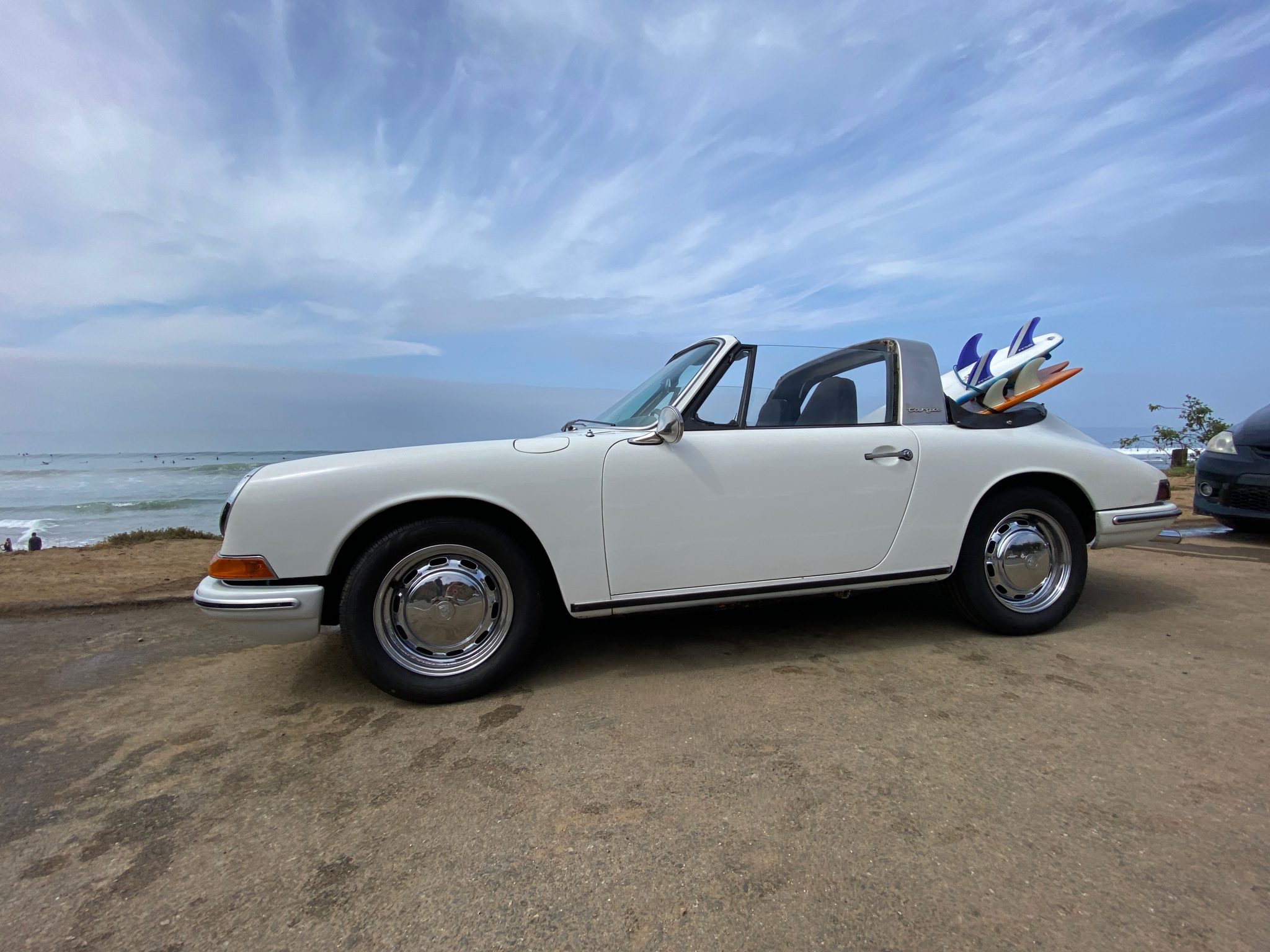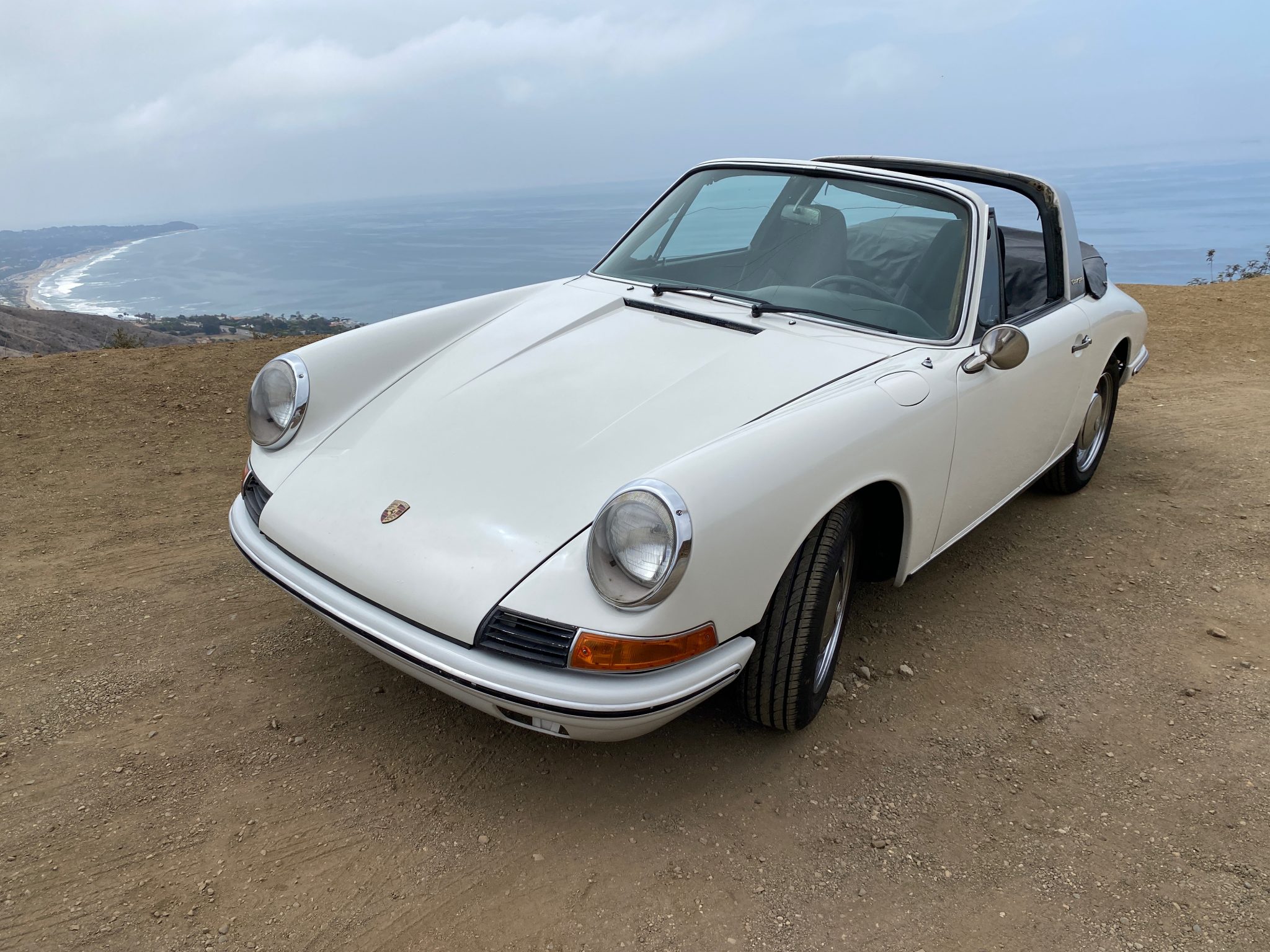 Chrome-finished ventilated 15″ steel wheels wear Porsche-crest hubcaps and exhibit pitting. They were mounted with 185/65 Arroyo Grand Sport 2 tires in early 2021 according to the seller, and the brake master cylinder and lines also have been replaced.