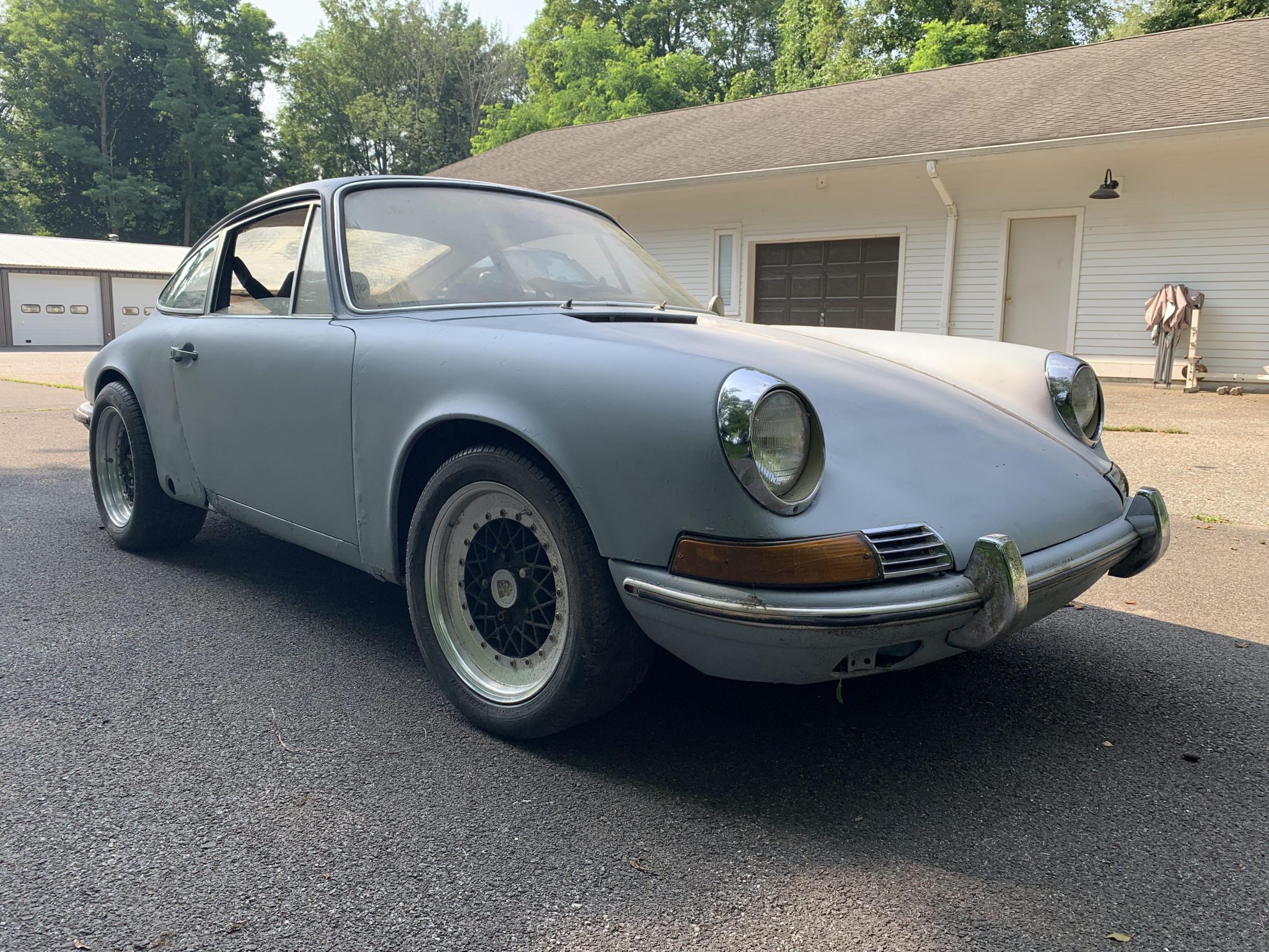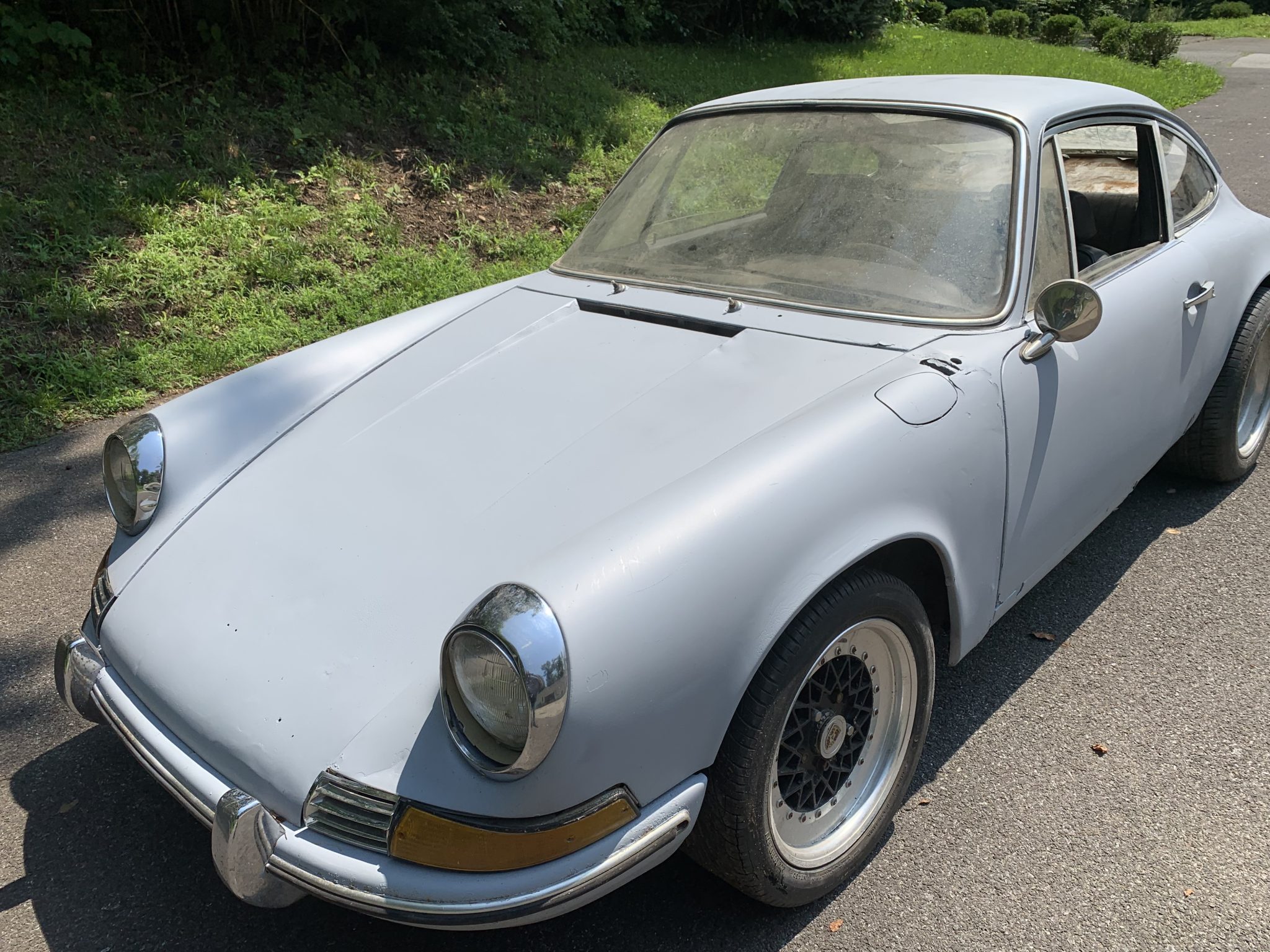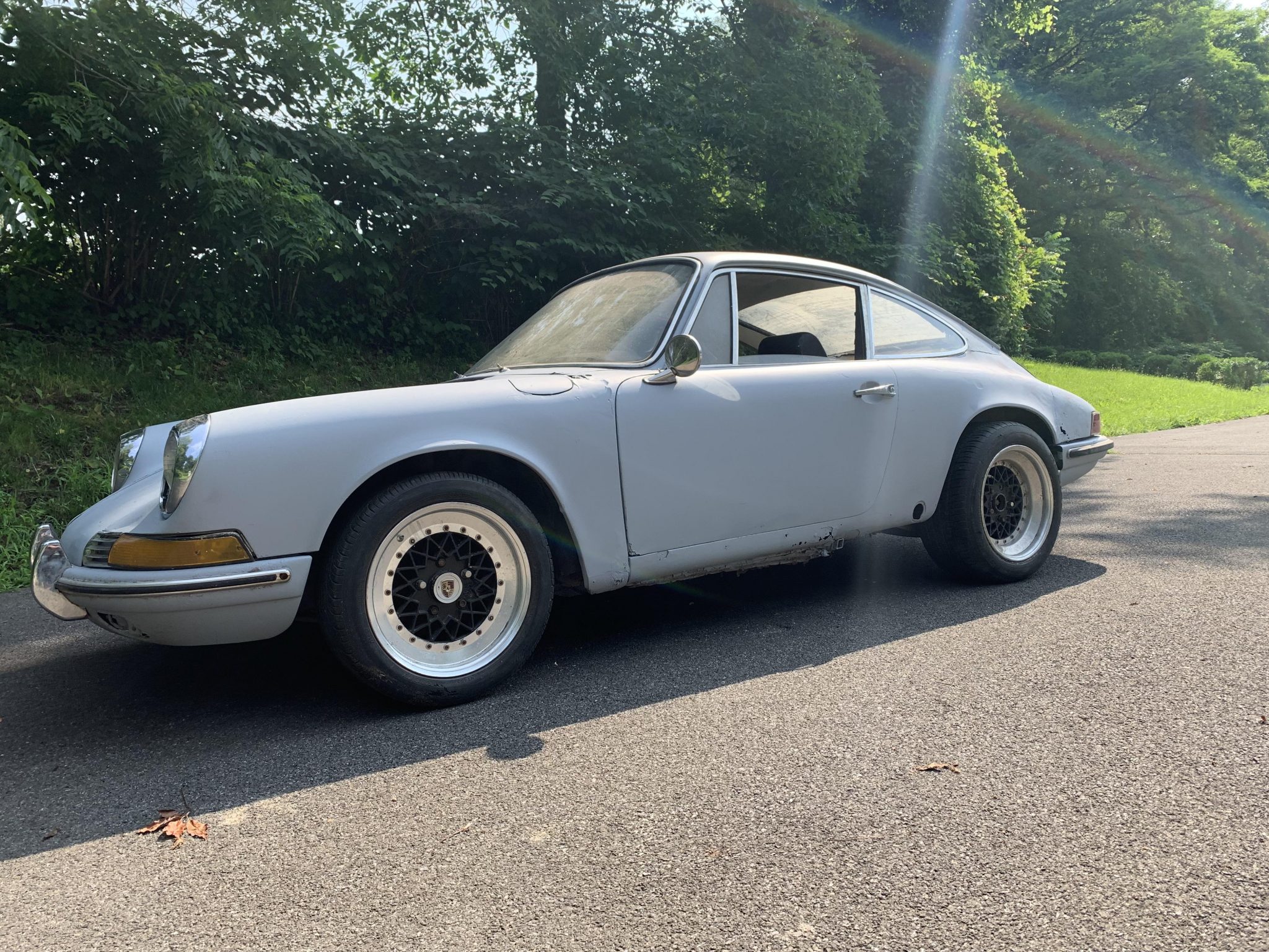 Black mesh-style wheels with polished lips are mounted at each corner. The suspension, steering, and brakes will require service before the car is driven.
