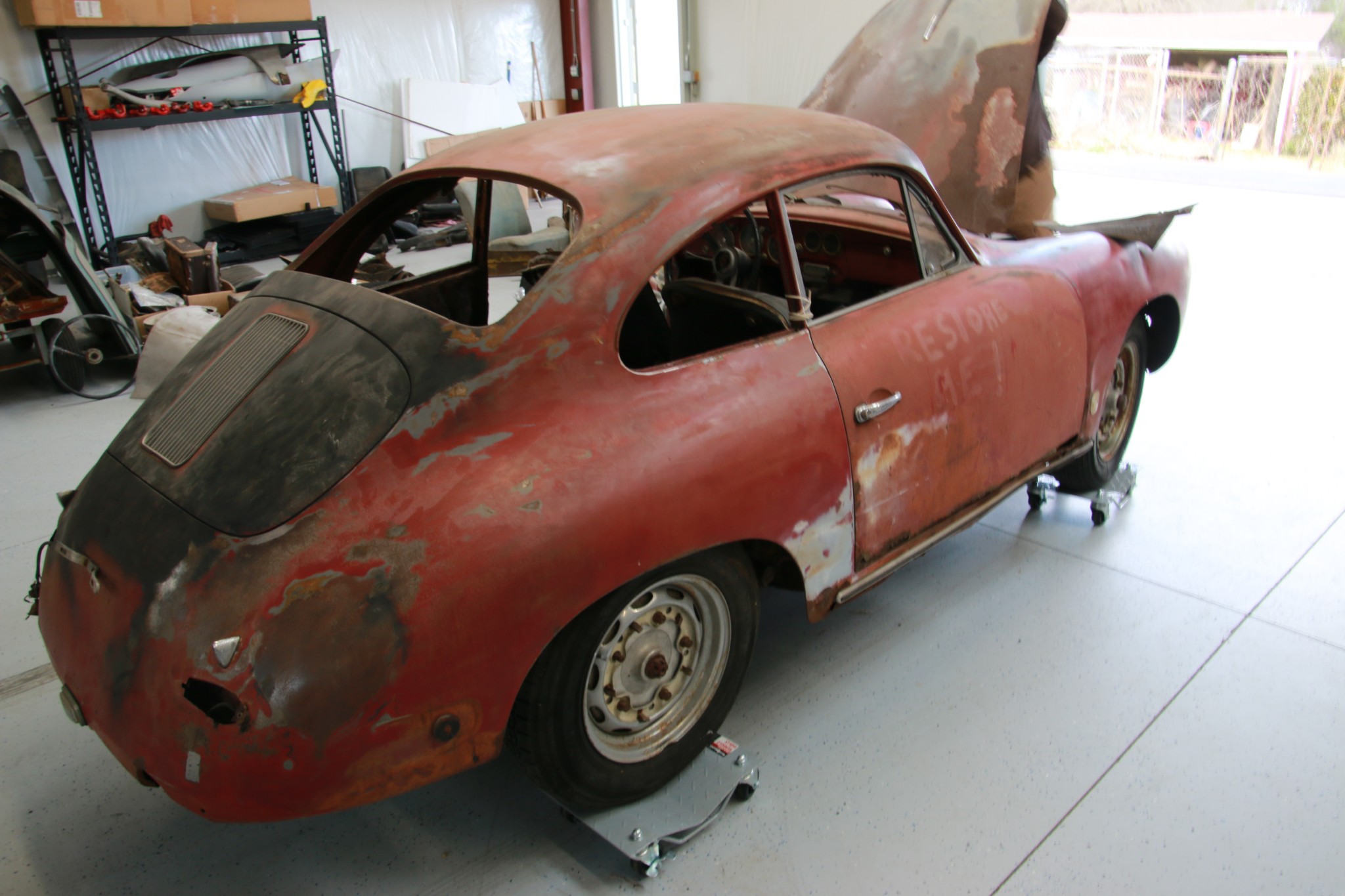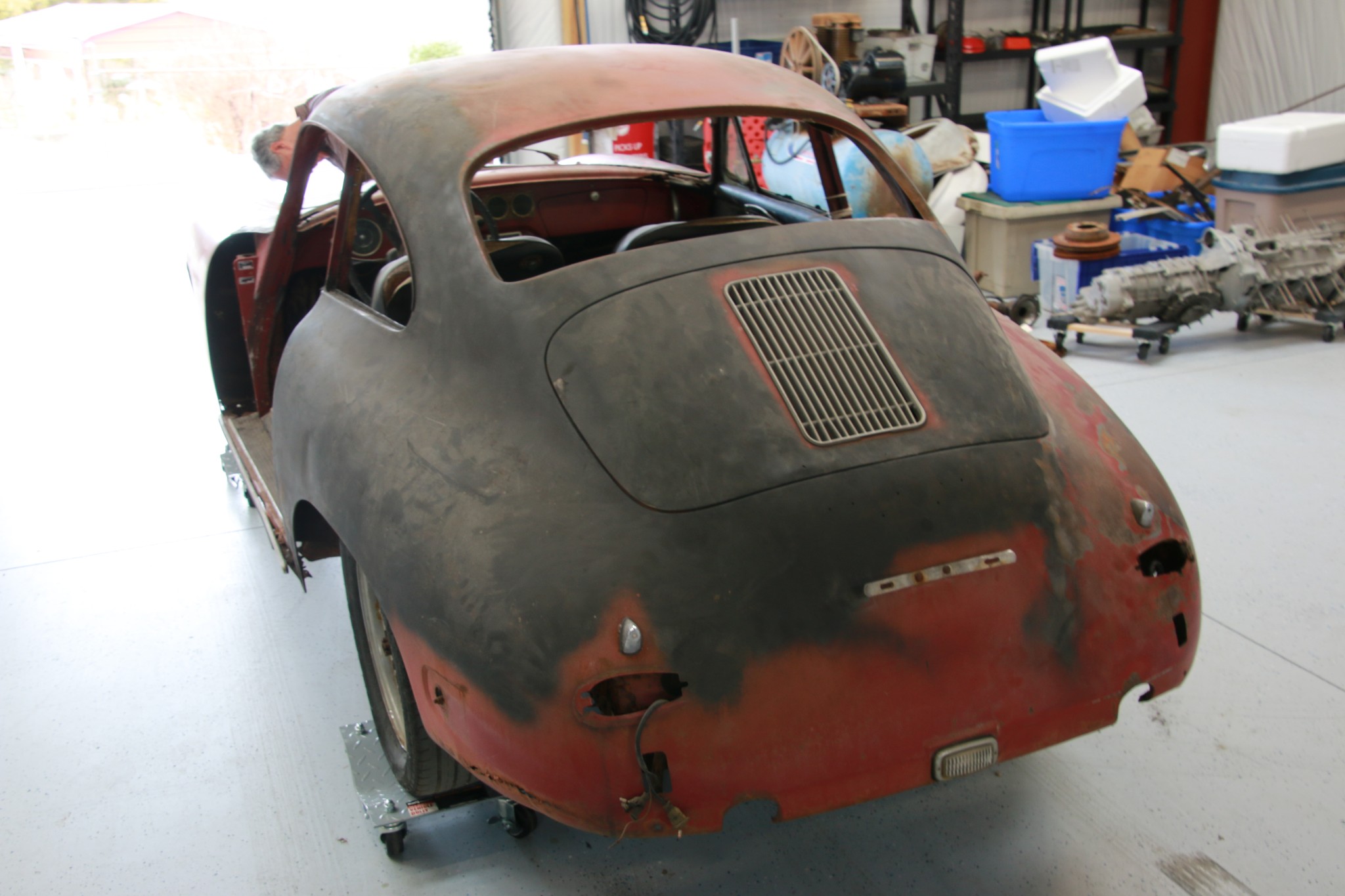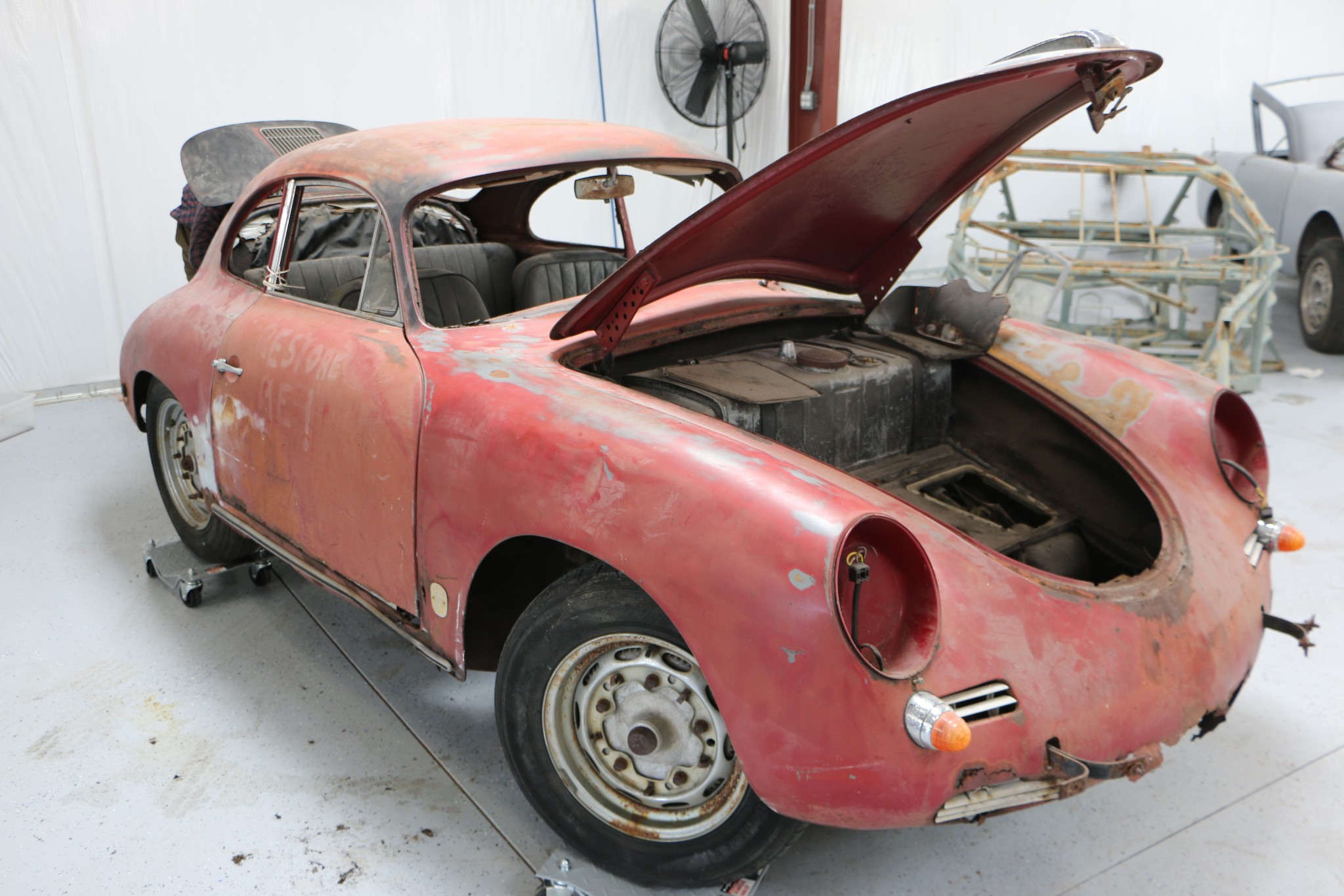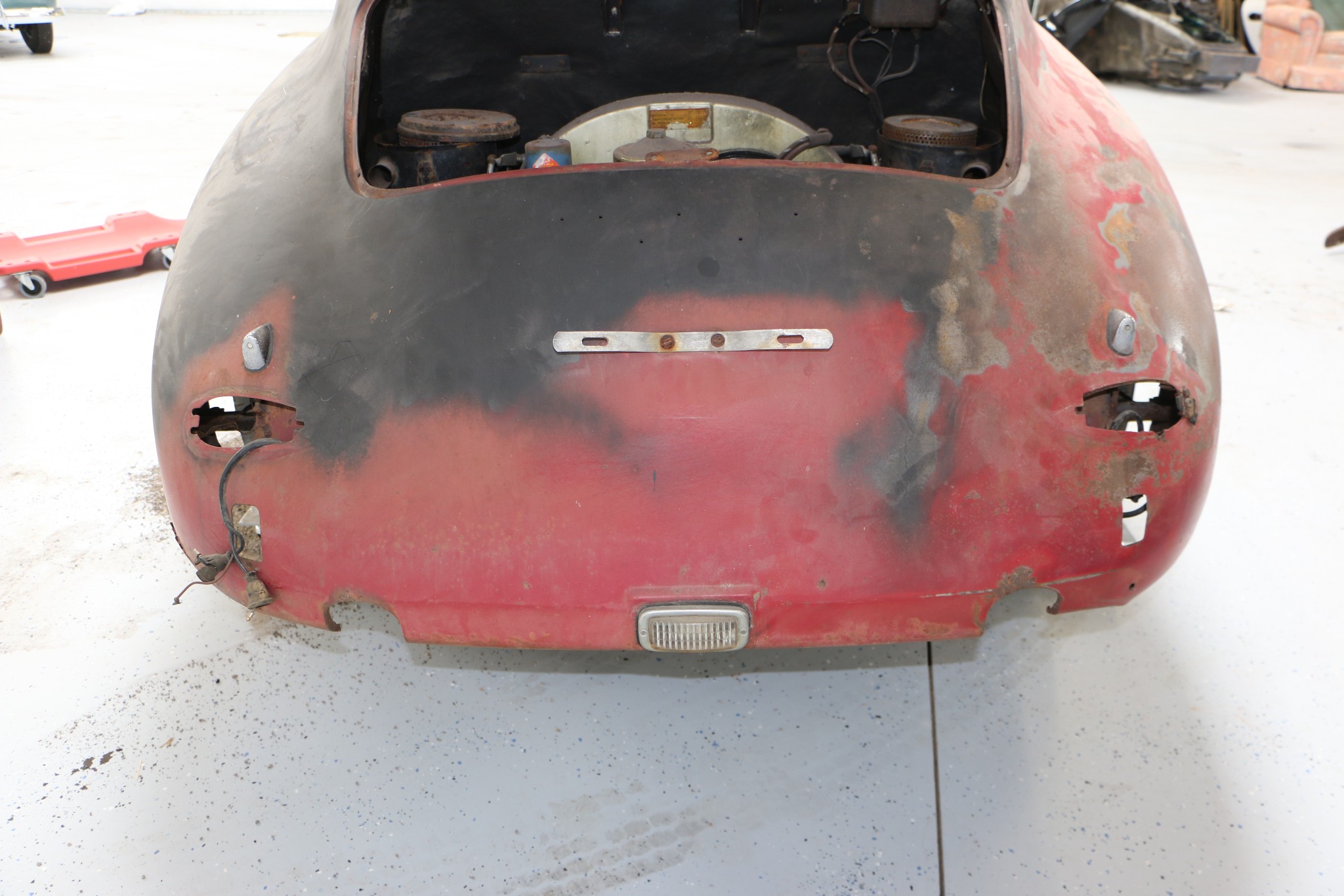 The nose cone shows substantial rot as do the rockers. The original lightweight aluminum trim remains in place both inboard of the turn signals and in the lower openings. The headlights have been removed, but have been retained.