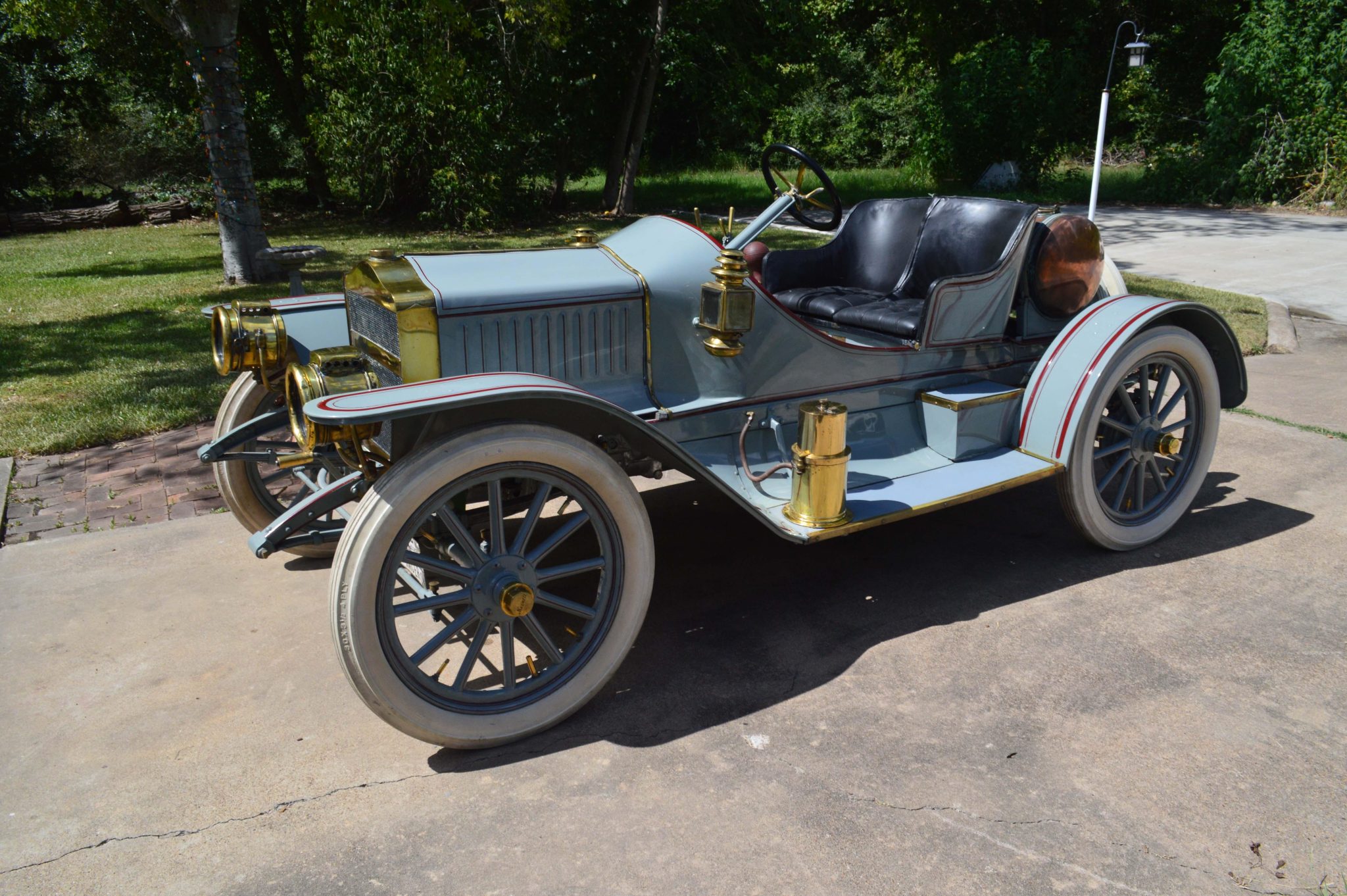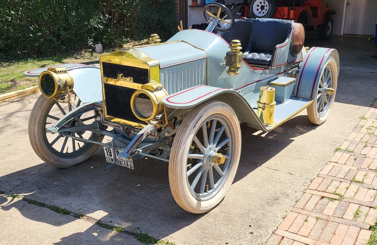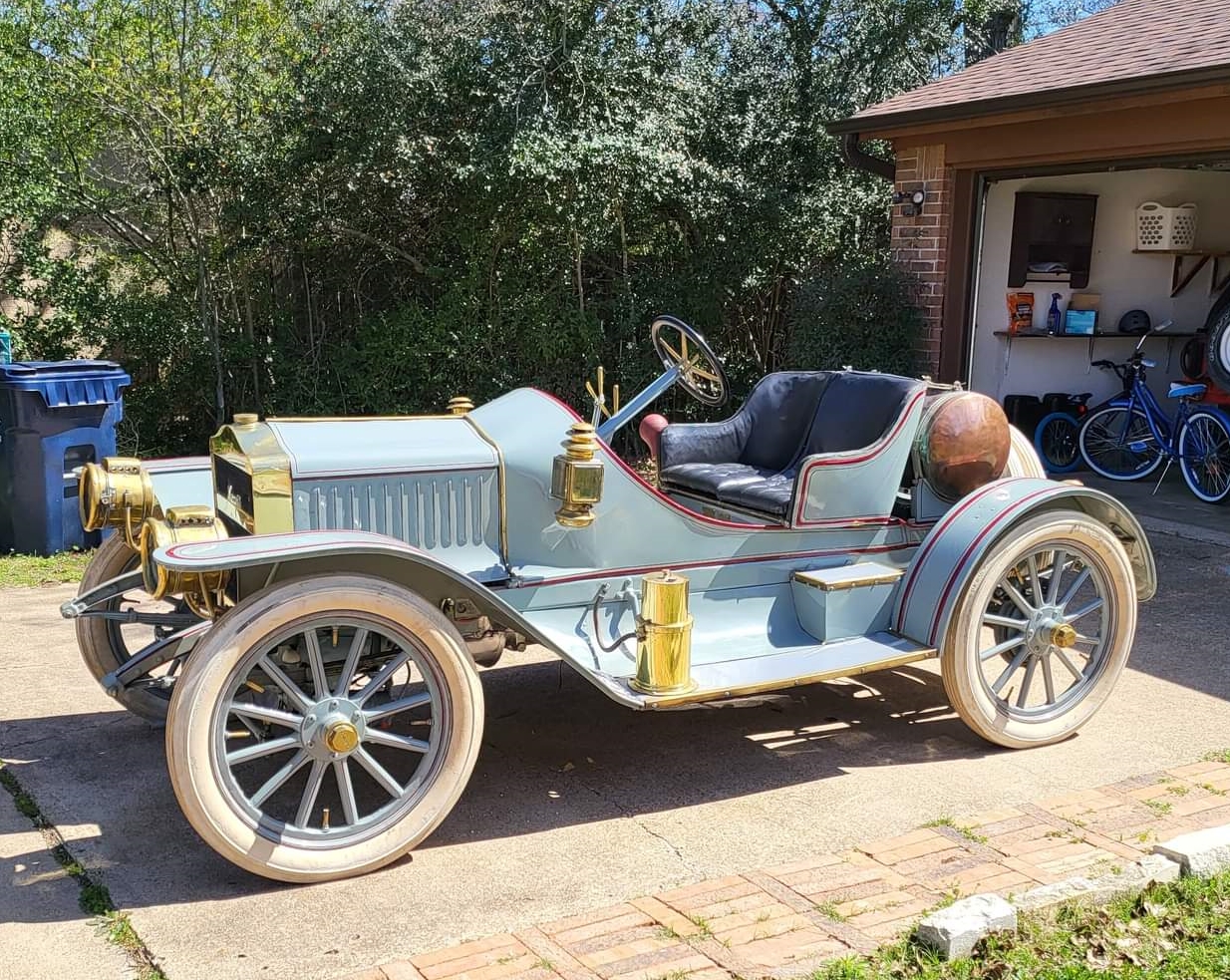 The Model Q-4 was offered in 1910 and 1911, and this example was overhauled by the seller’s father in the late 1950s, with work including fitting a partially reconstructed Semi-Racer body that is finished in gray with red pinstriping. Features include kerosene-powered rear and cowl lanterns, a copper fuel tank, running boards, a carbide generator, a horn, and a brass radiator surround.