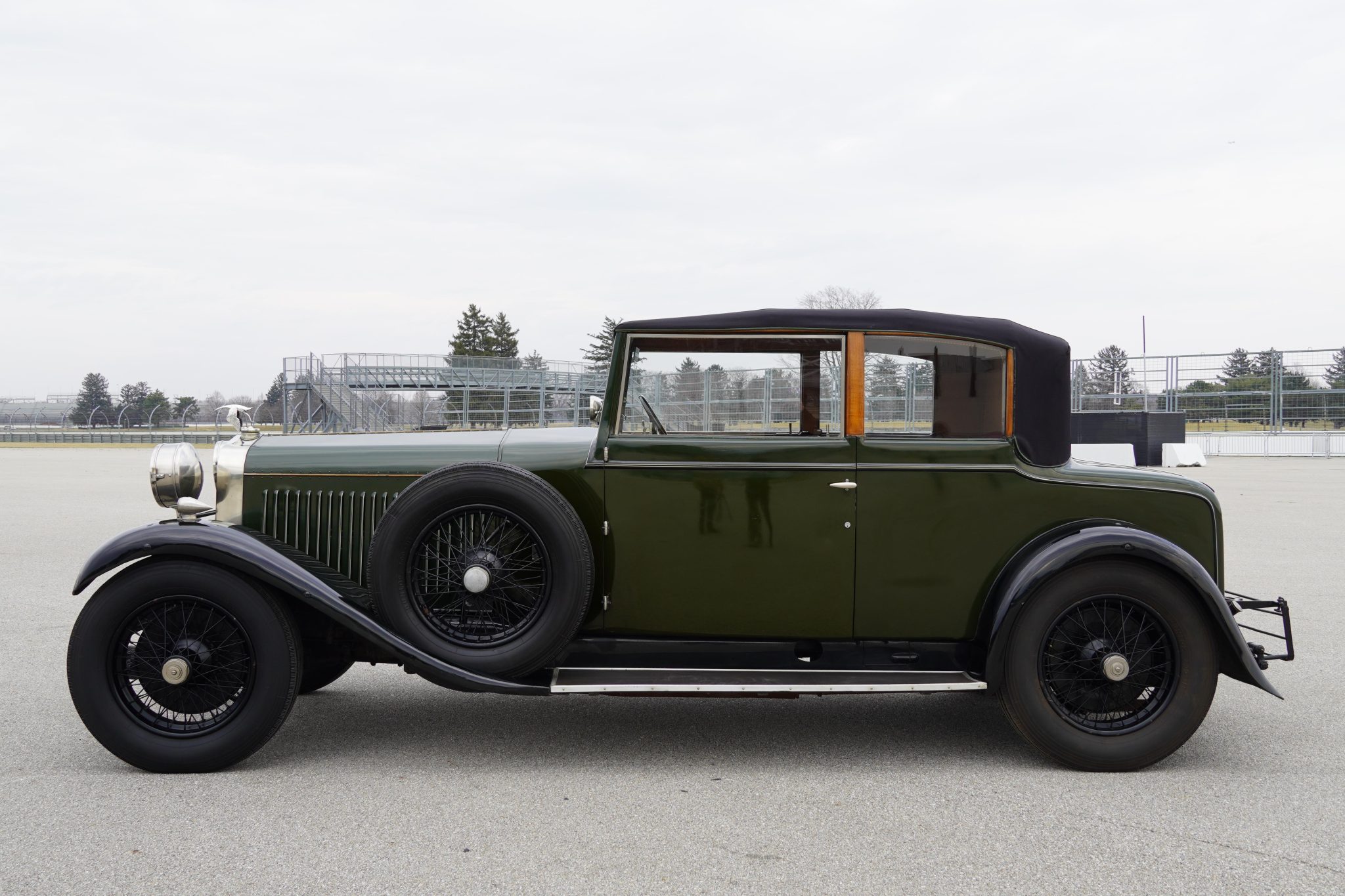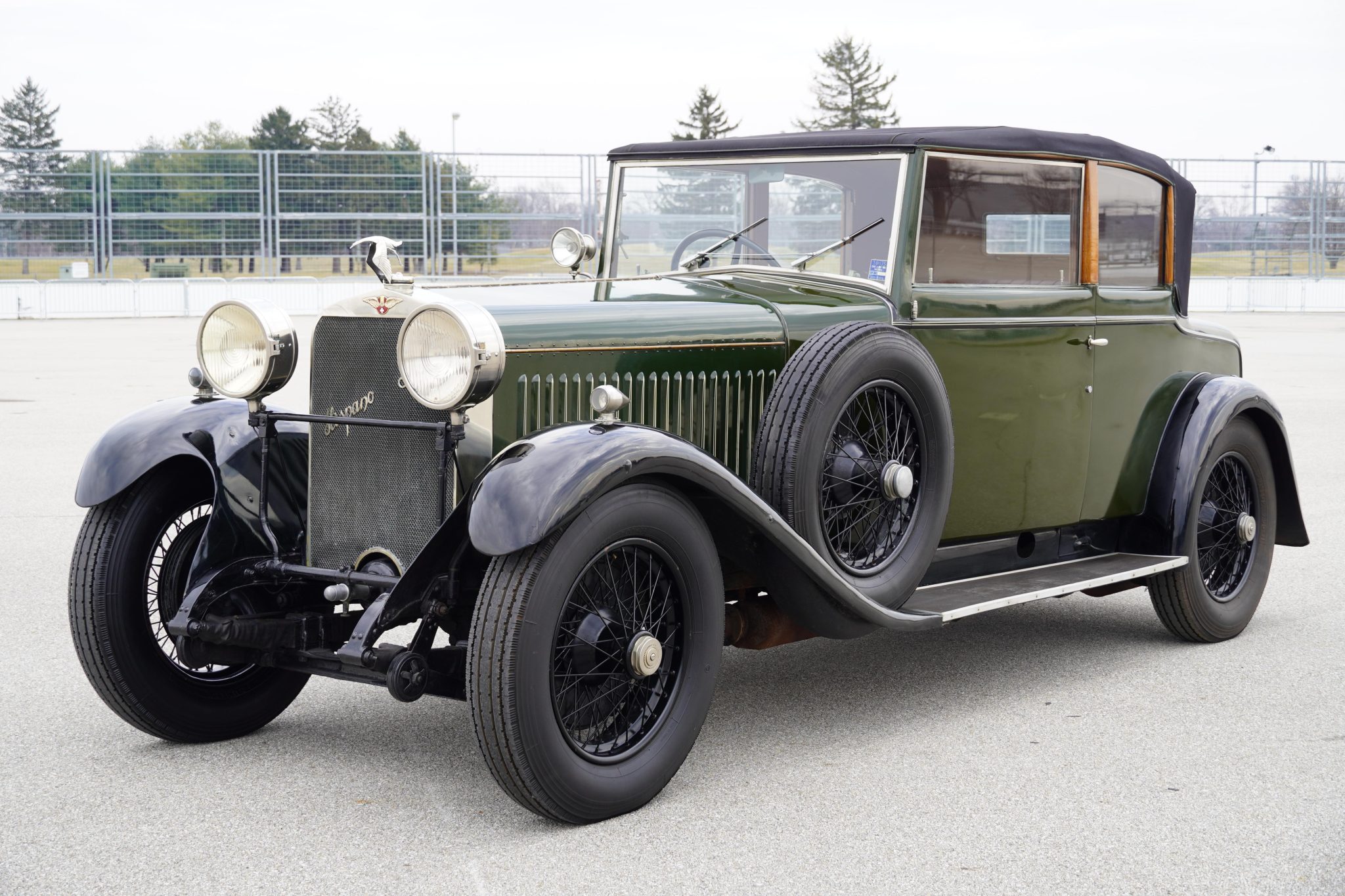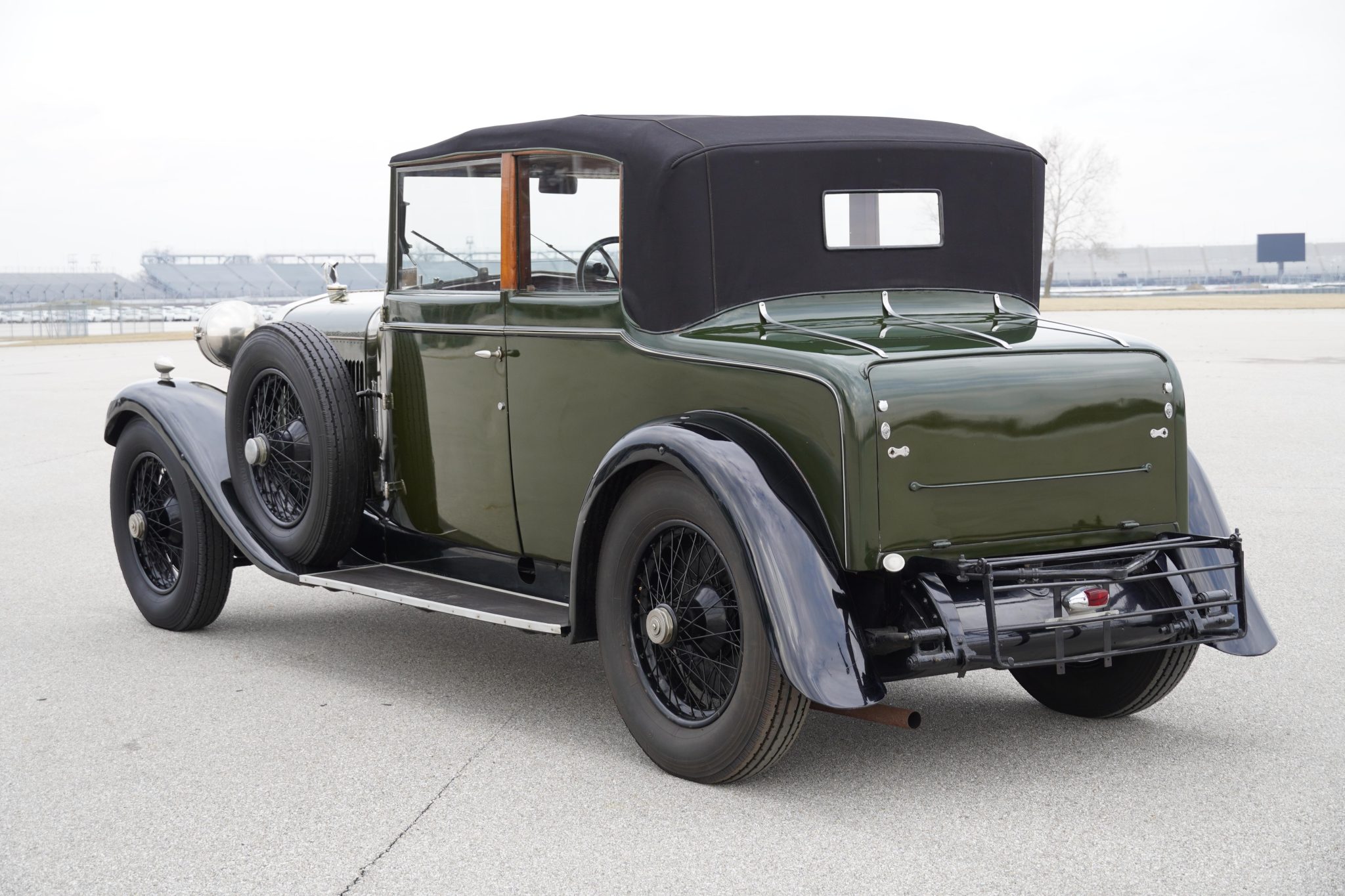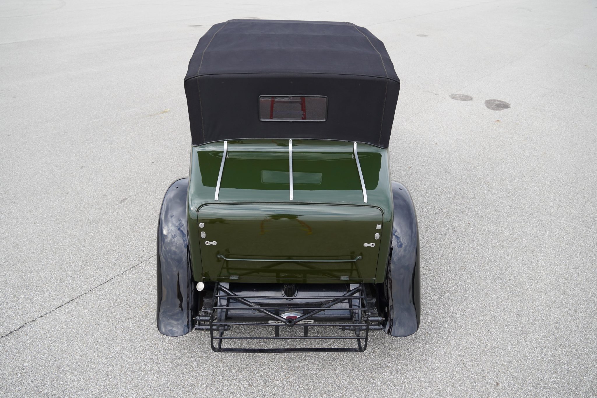 Previously finished in white with dark fenders, this example was painted in its current dark green with black fenders during its refurbishment in England. Features include a fold-down luggage rack, a central brake light, a bustle trunk, running boards, a Klaxon horn, cowl lamps, a stork hood ornament, and a polished radiator surround. The black convertible top features a glass rear window, and the wood top frame incorporates folding B-pillars. A New York State 1962-1963 inspection sticker is affixed to the windshield. Imperfections in the finish can be seen up close in the gallery below.