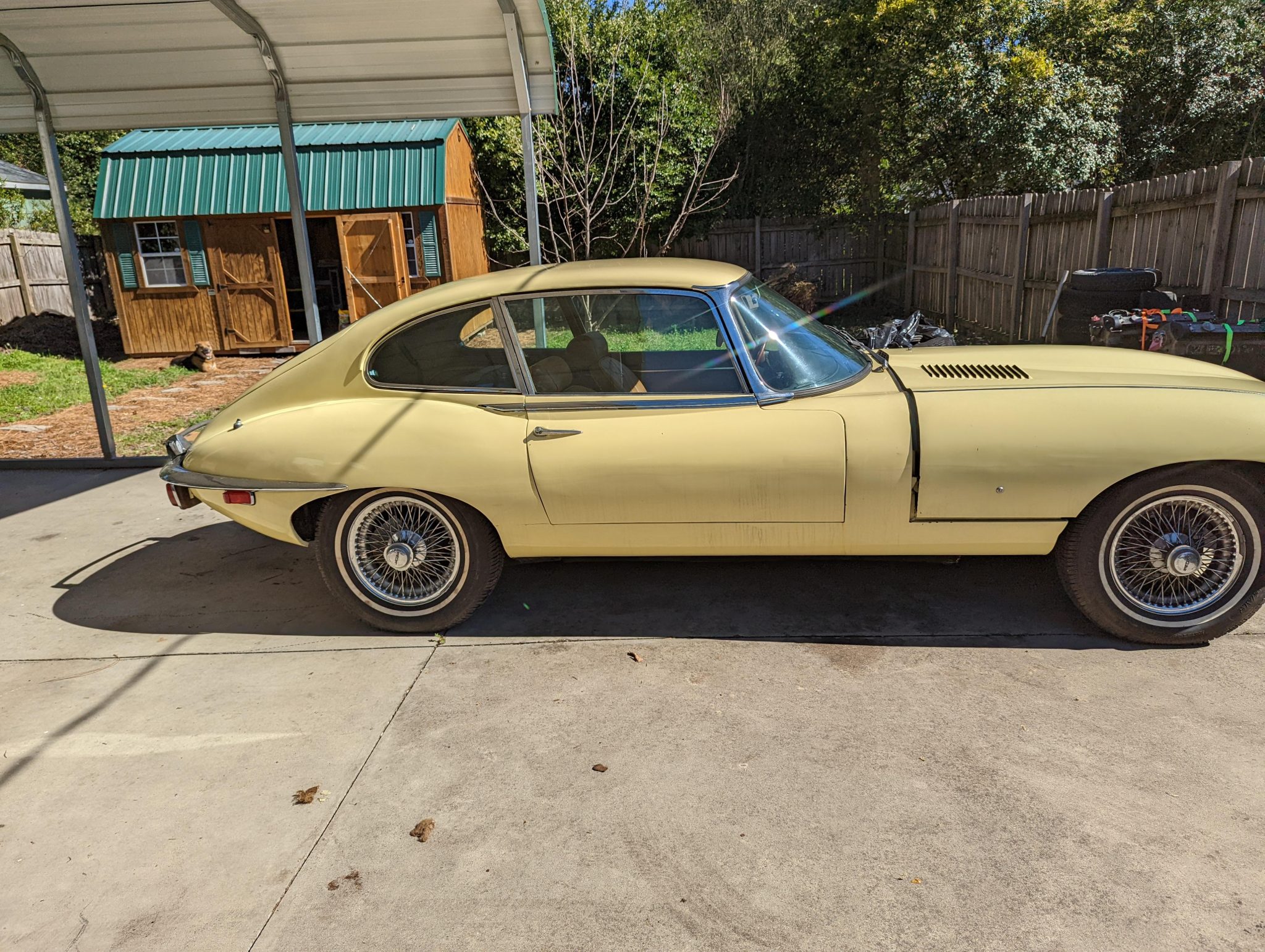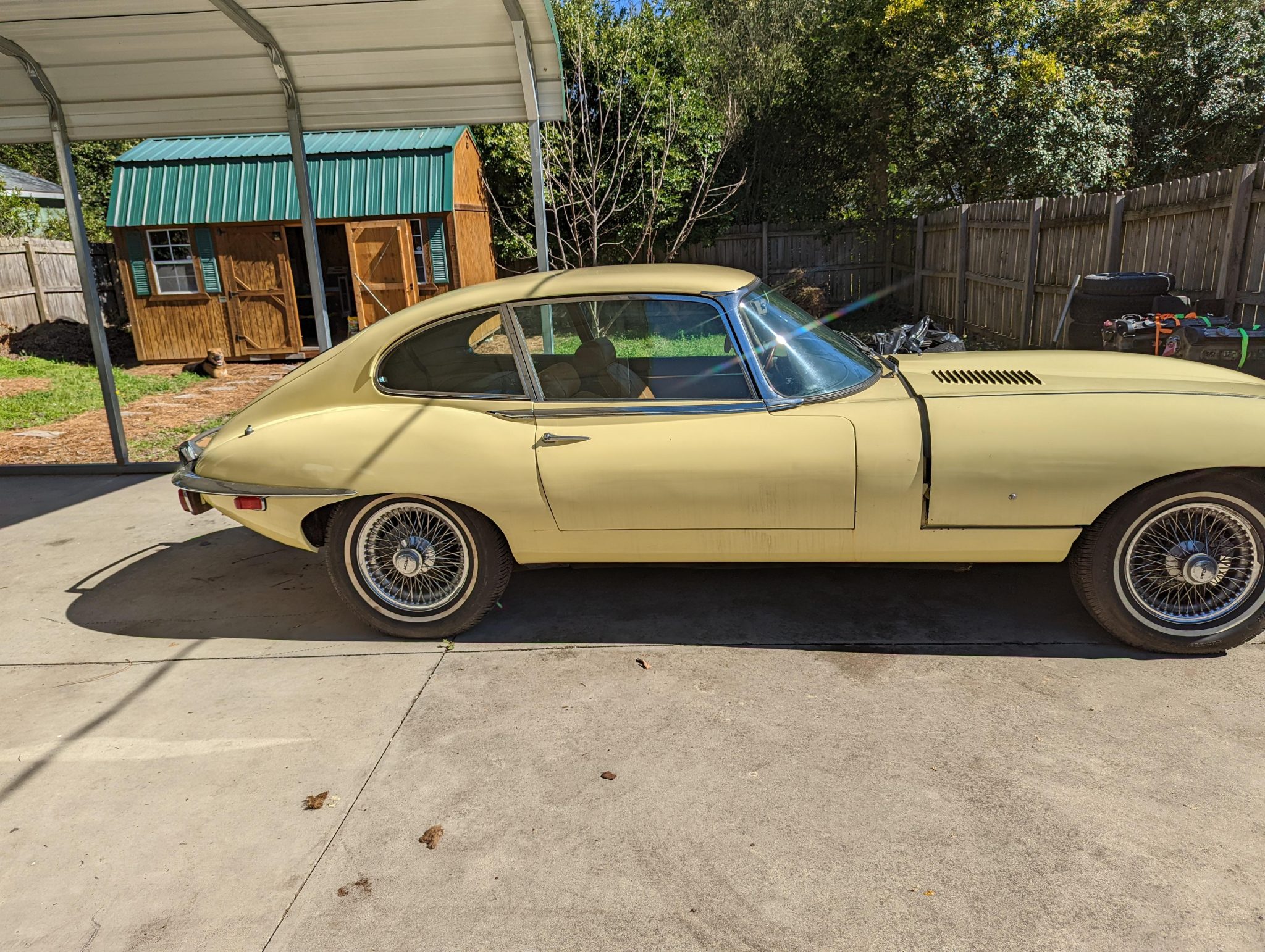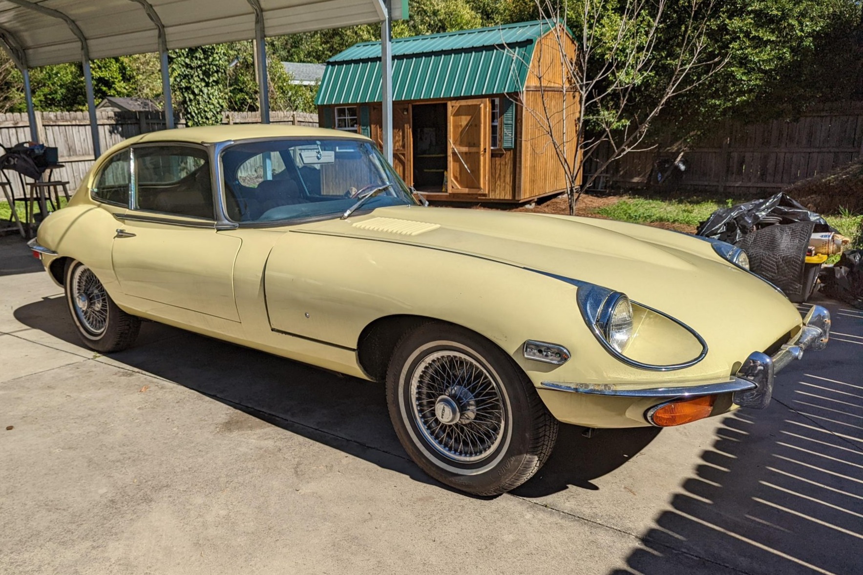 Polished 15” wire wheels feature knock-off spinners and are mounted with older Silver Bear whitewall tires. Stopping power is provided by four-wheel discs with inboard-mounted rears. Three spare wire wheels and one tire are included in the sale.