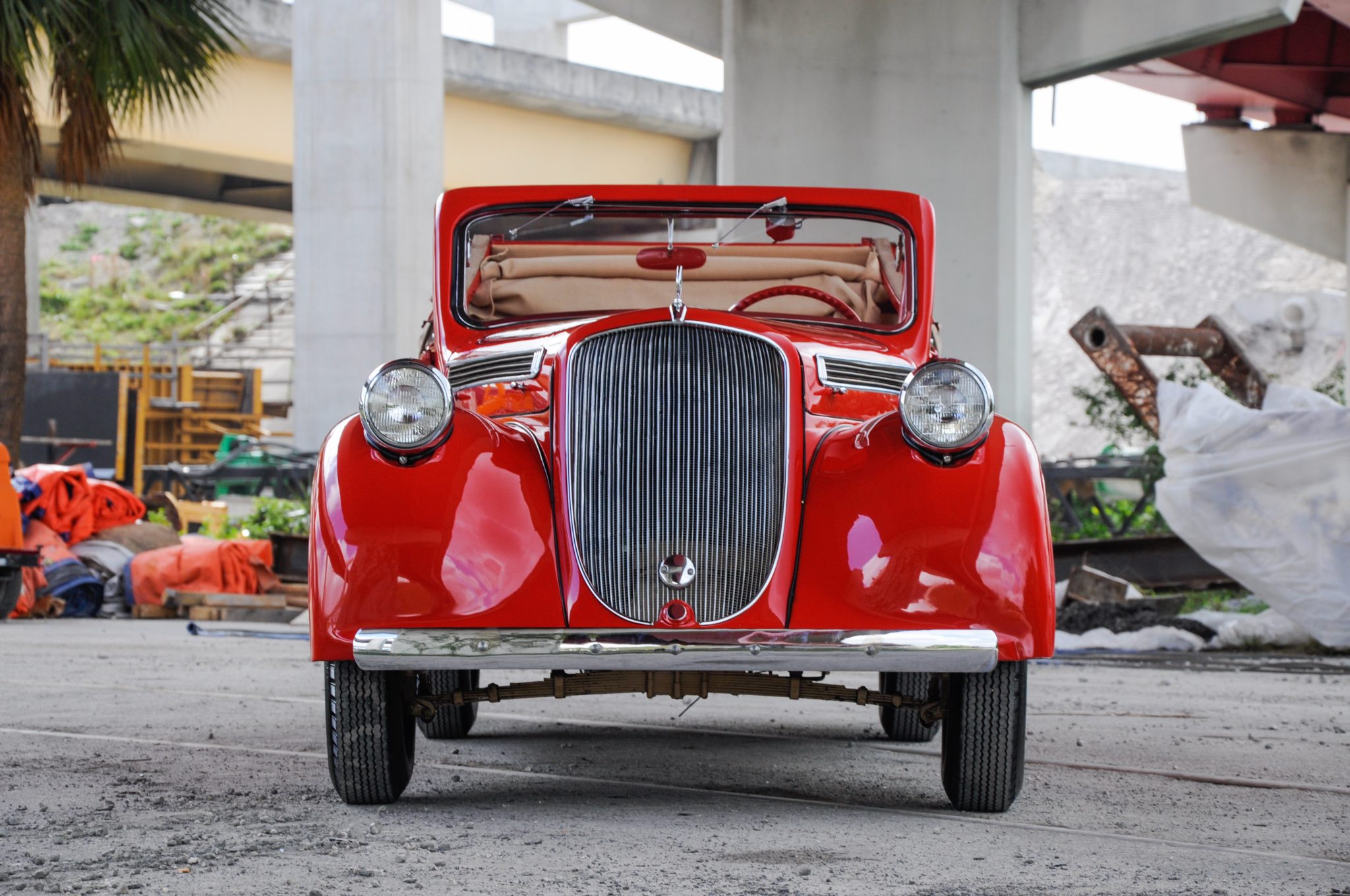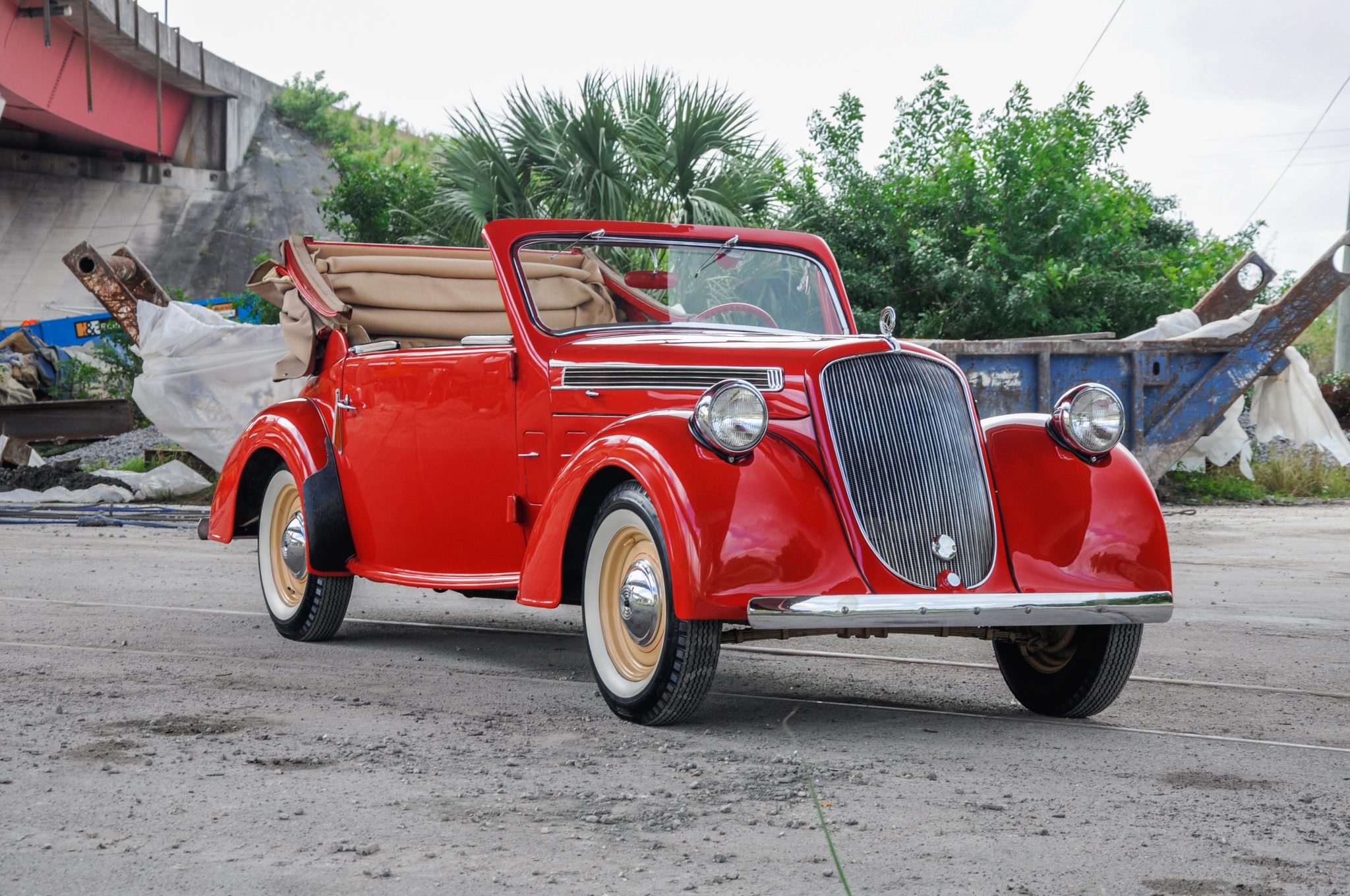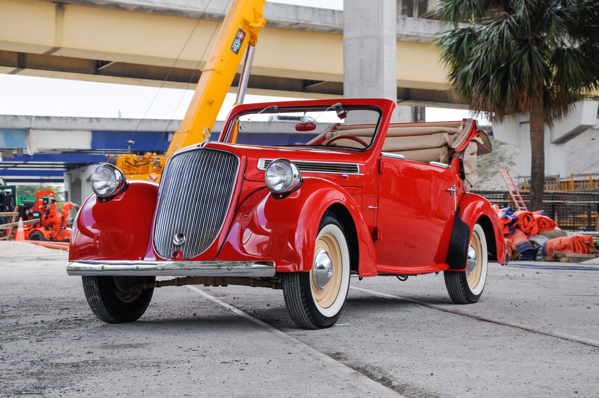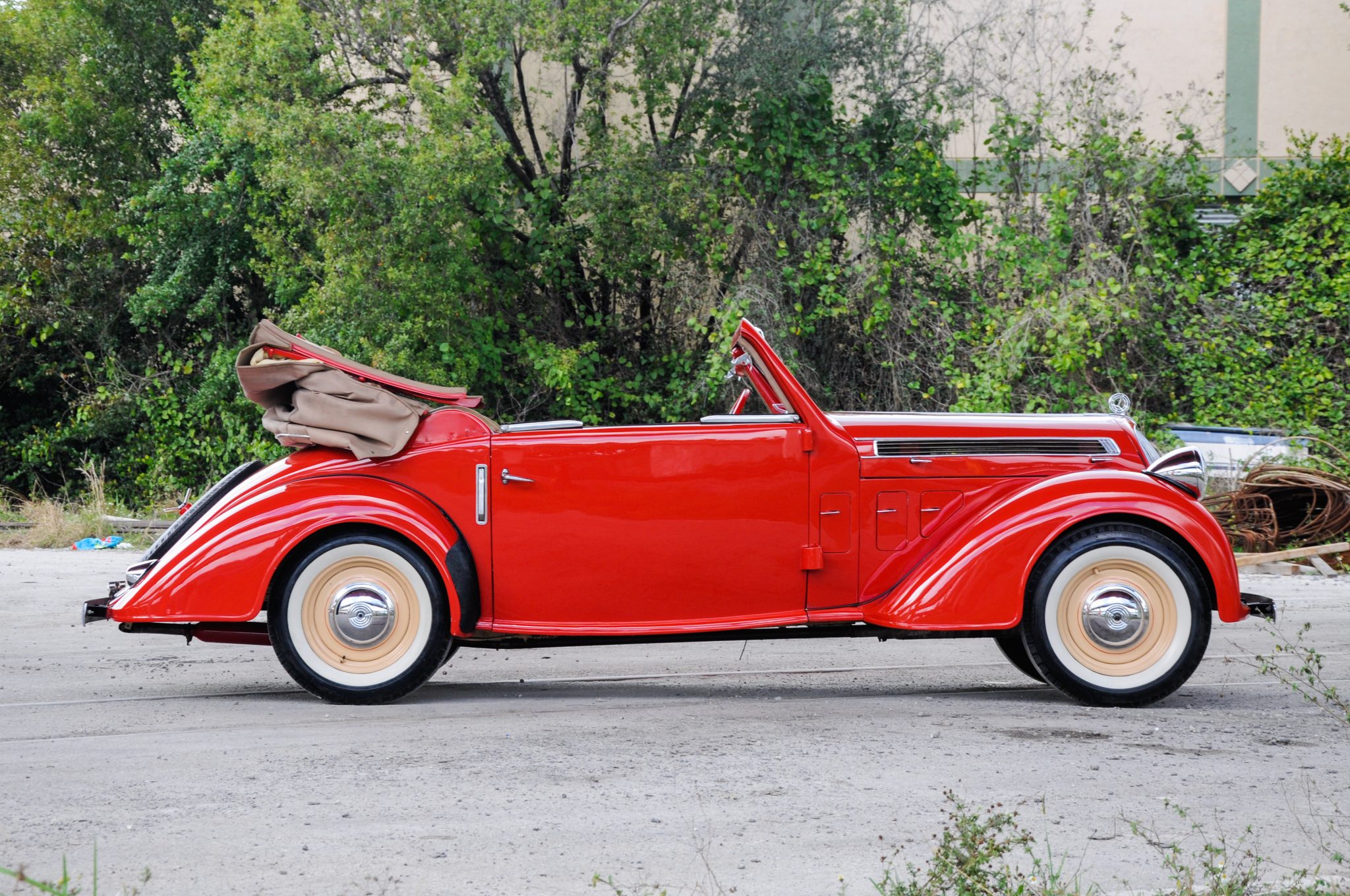 The 220 model featured a 2,840mm-wheelbase chassis and was available with both open and closed bodywork, including three different two-door cabriolet variants. This example’s two-window cabriolet body wears an older repaint in red, and various imperfections in the finish and trim are shown in the photo and video galleries below. Styling includes a centrally hinged hood with horizontal vent accents, triple vent flaps rearward of each front fender, trafficators, black rear stone guards, a tan convertible top, and roll-up windows with flip-up side seals. The windows do not currently roll up.