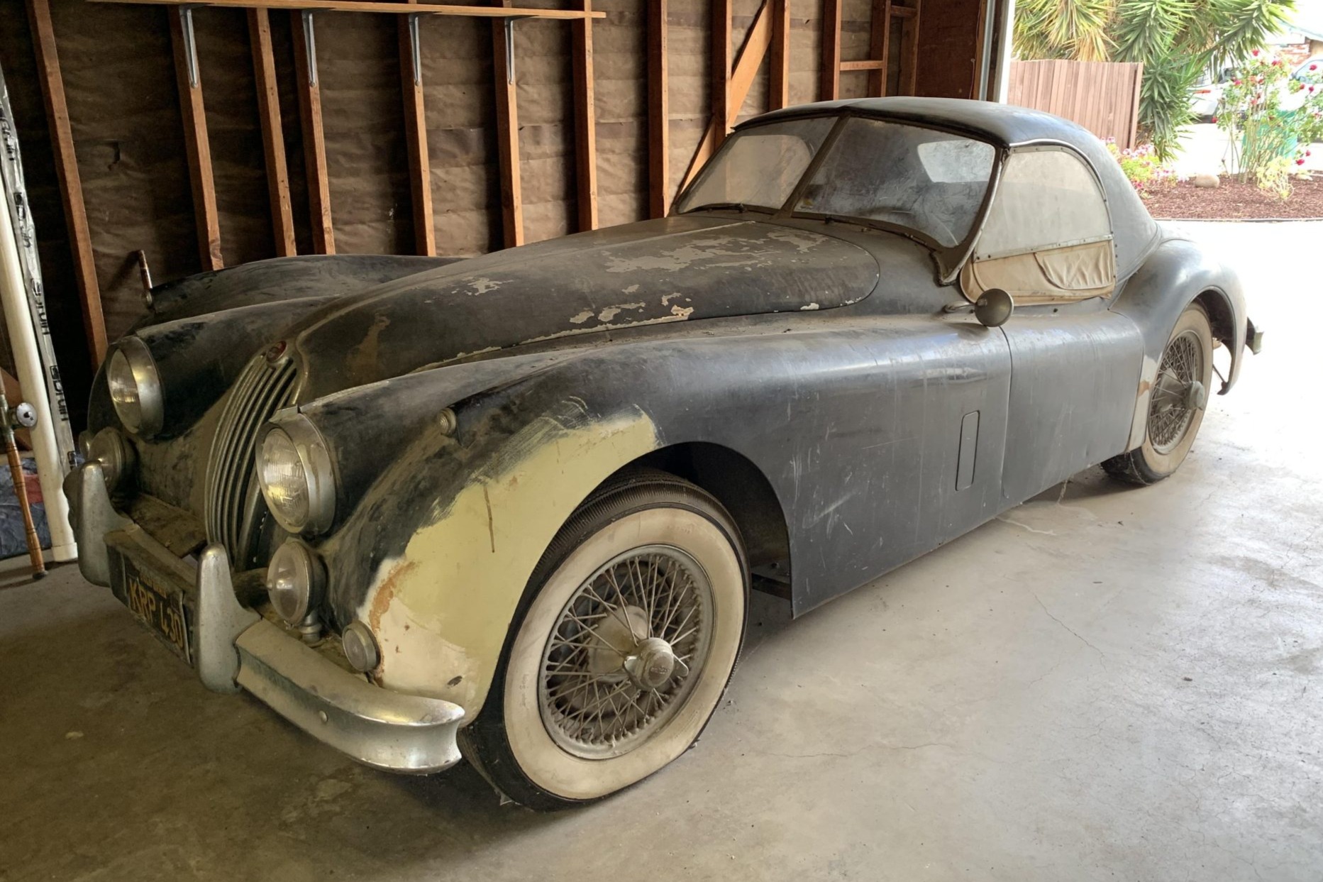 The wire wheels are secured by two-eared knock-off spinners and mounted with older whitewall tires with a mismatched rear passenger-side tire. The seller notes that the brakes are seized.