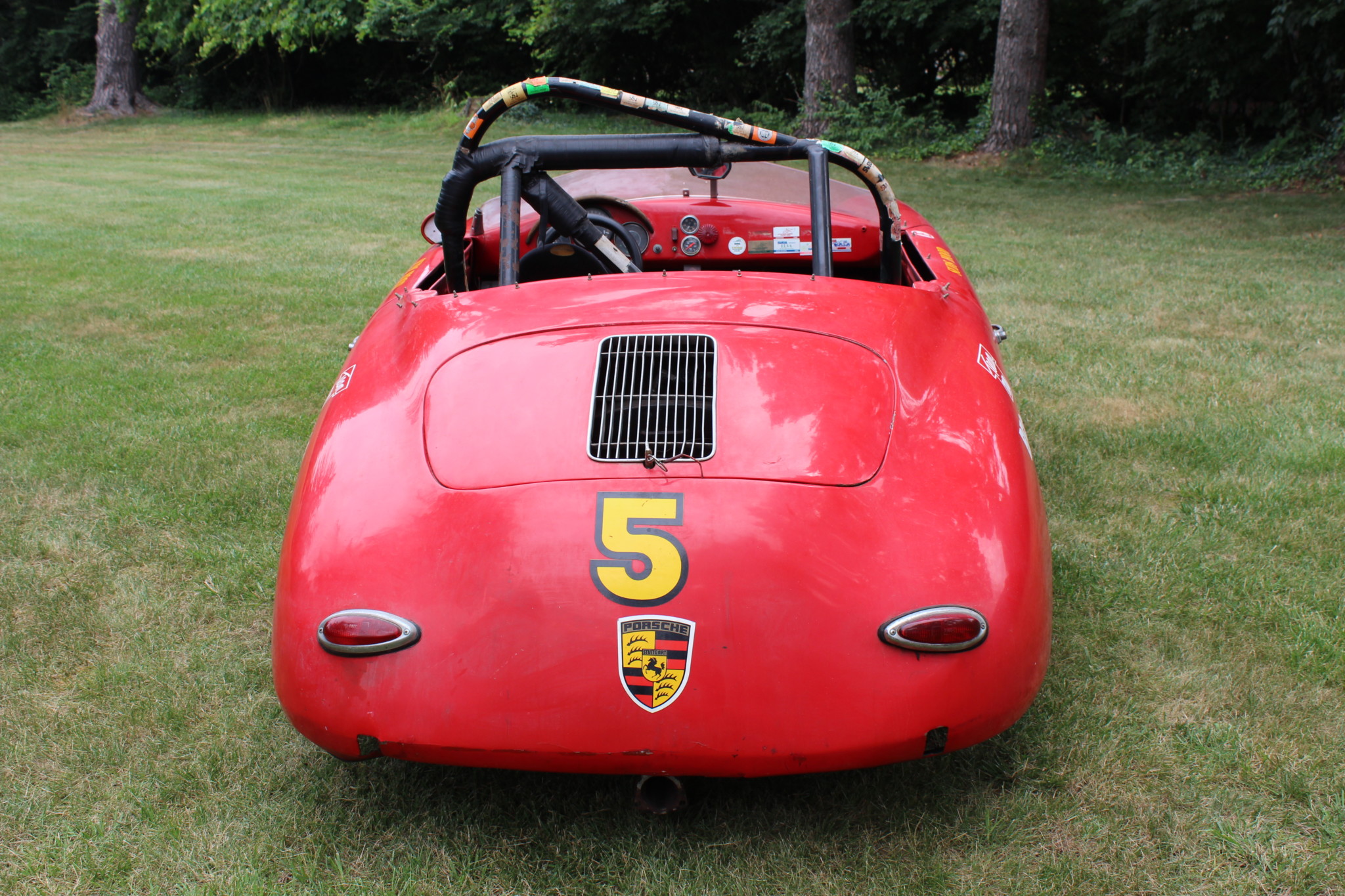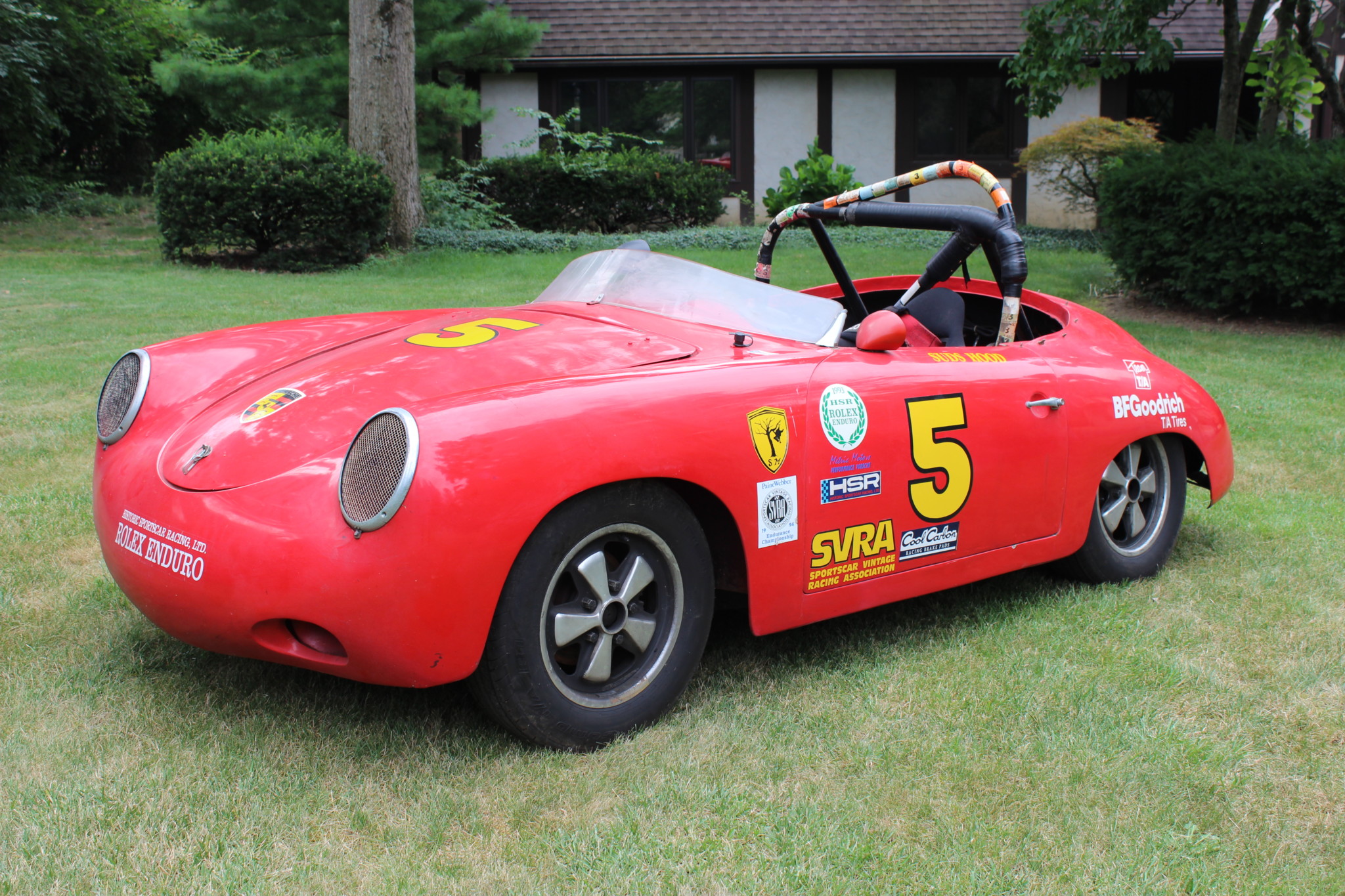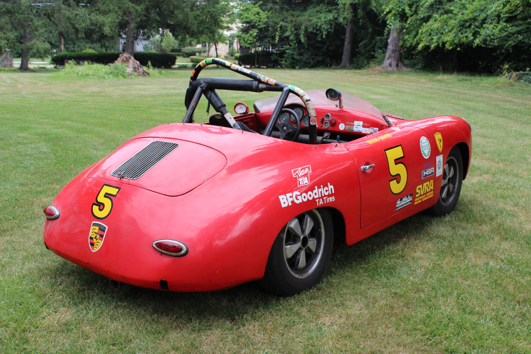 Disc brakes have been added at all four corners, and 5-lug 15″ Fuchs wheels wear 185/70 BFGoodrich Comp T/A R1 tires. A spare wheel is included in the sale along with steel and fiberglass front hoods. Stampings on the Fuchs wheels are provided in the gallery below.