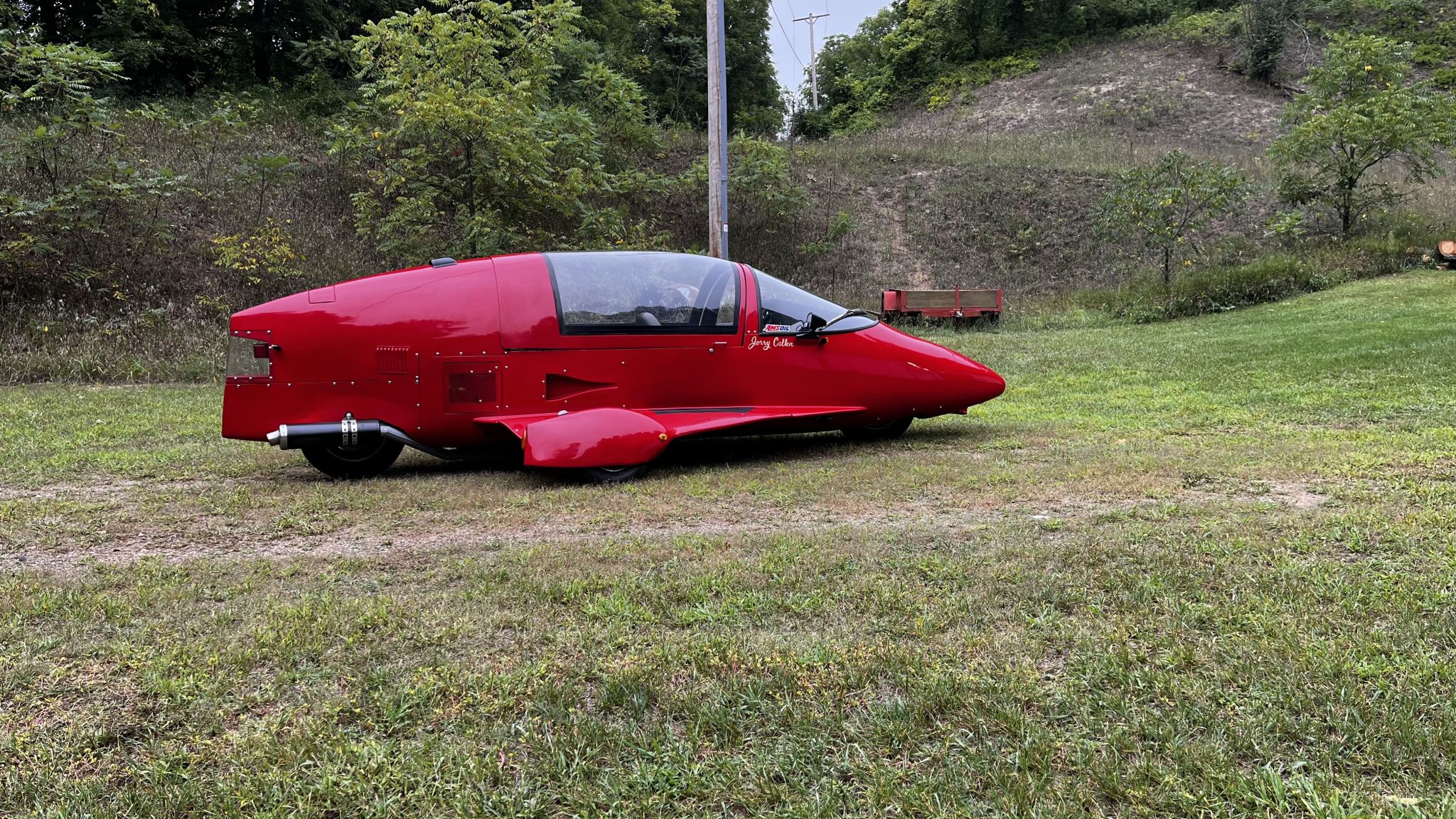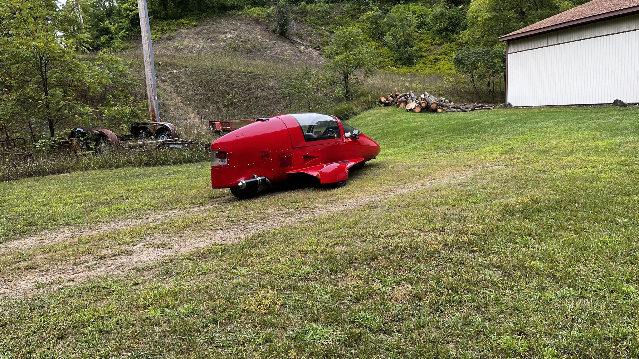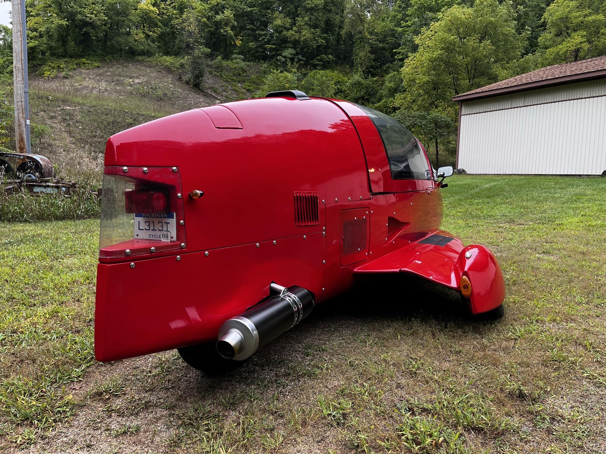 The 13″ front wheel is mounted with an older Michelin XW4 tire, while a Kumho tire is mounted on the 15″ rear wheel. Fiberglass-skirted outriggers are equipped with 8″ trailer-style wheels. Braking is handled by hydraulic discs at both ends. The suspension system includes front and rear air shocks with an onboard air compressor.