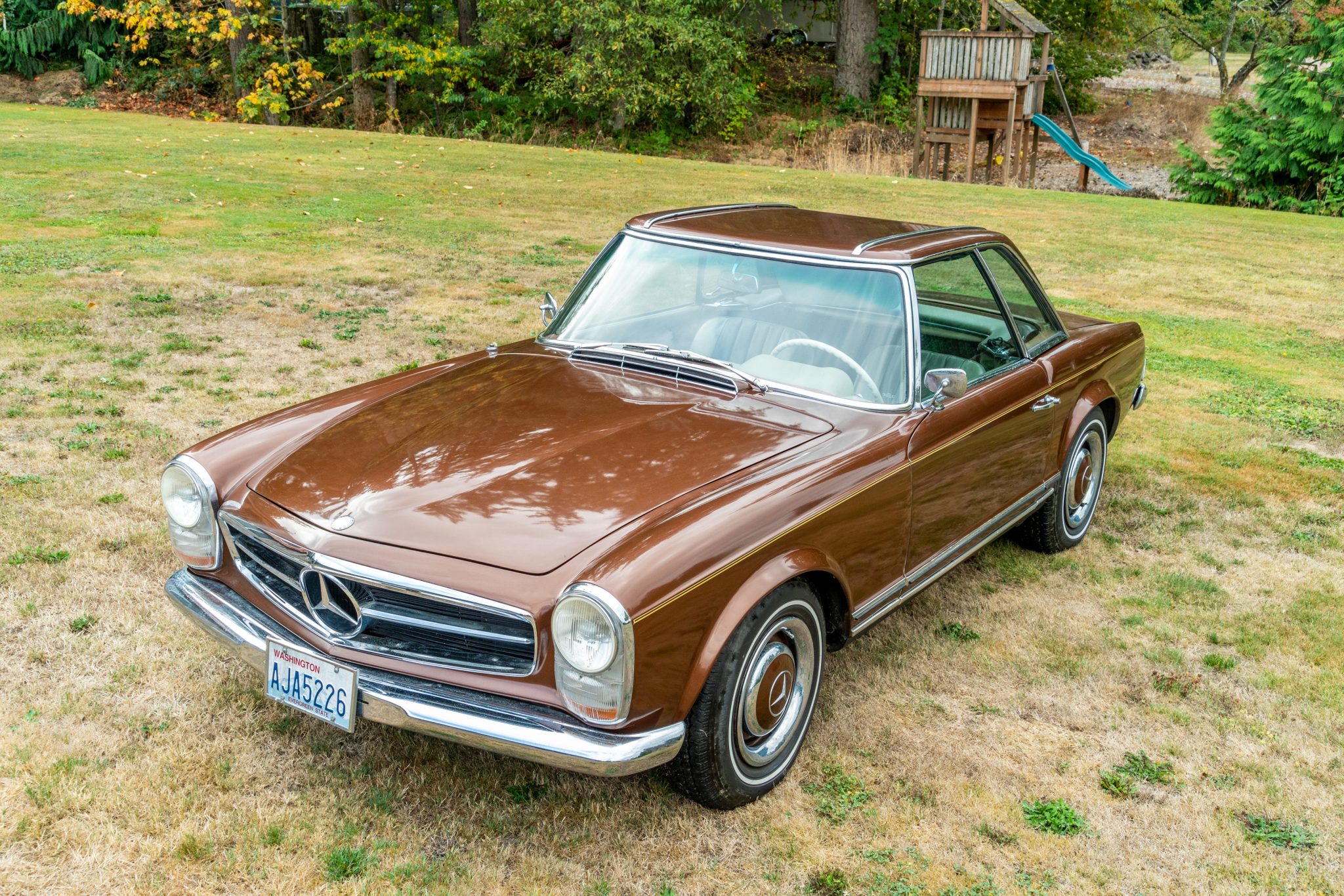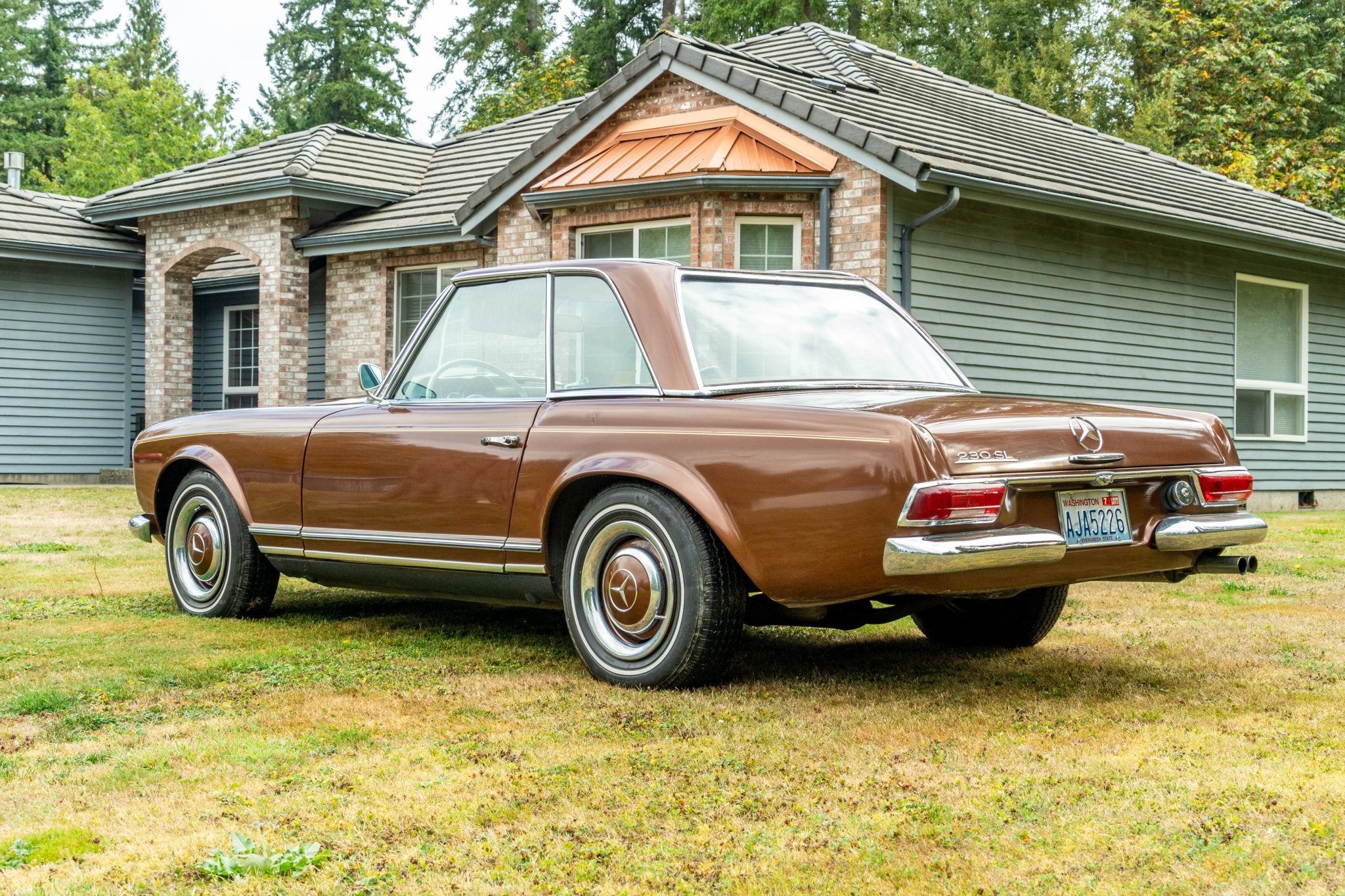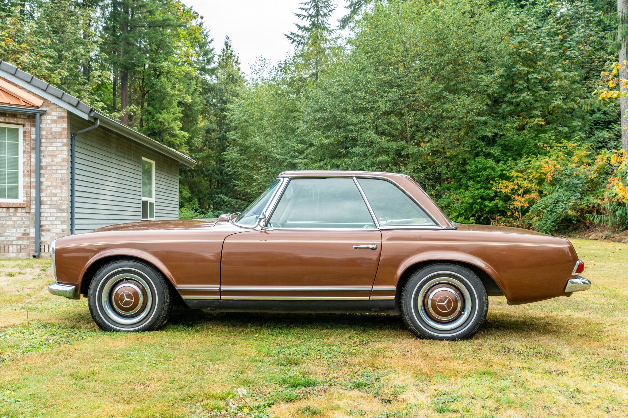 Body-color 14” steel wheels wear painted covers and are wrapped in 185-series Michelin X whitewall tires. A covered spare is stowed in the trunk.
