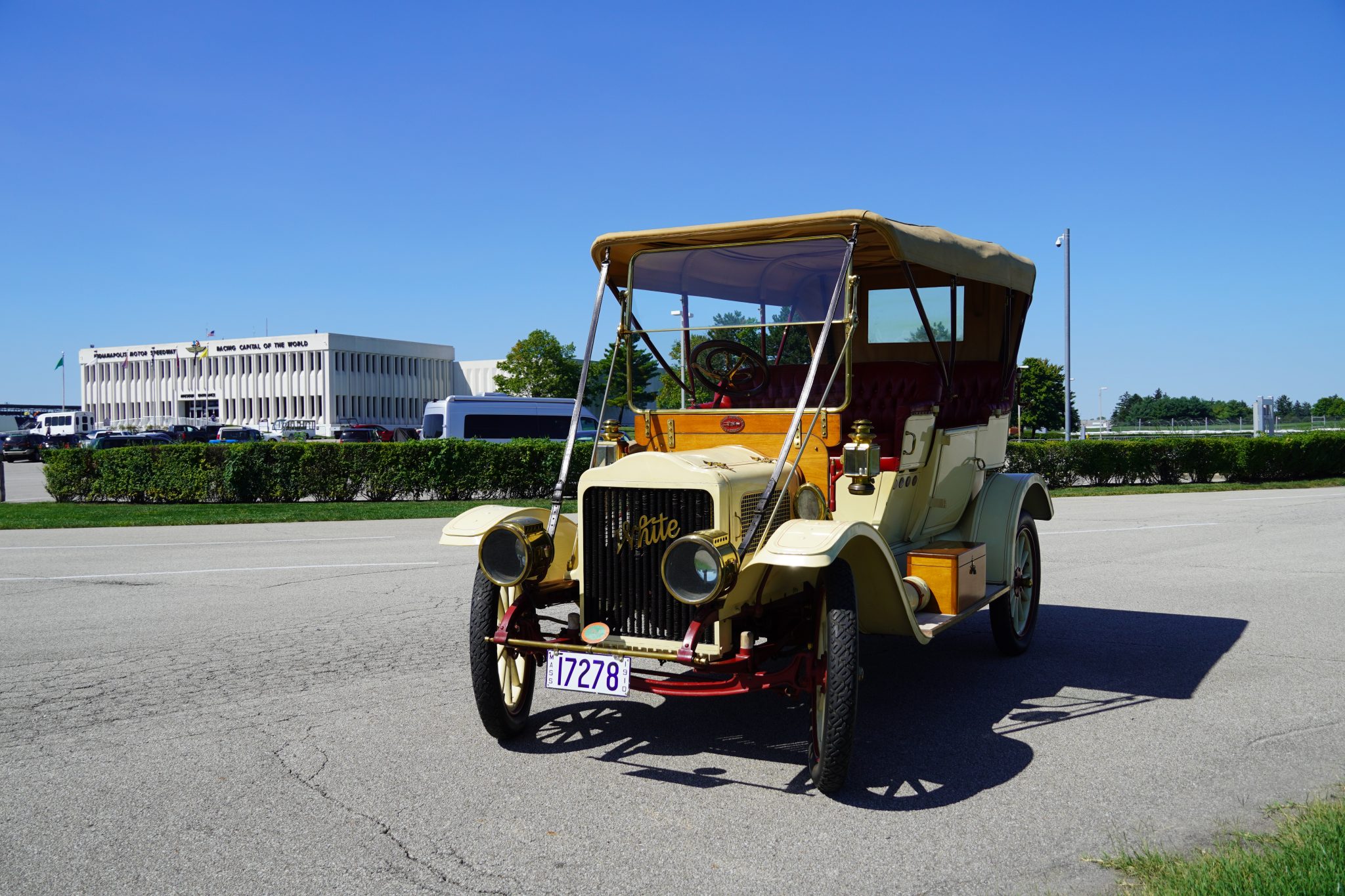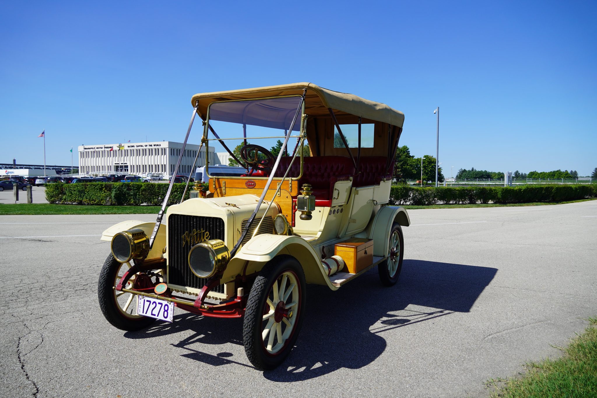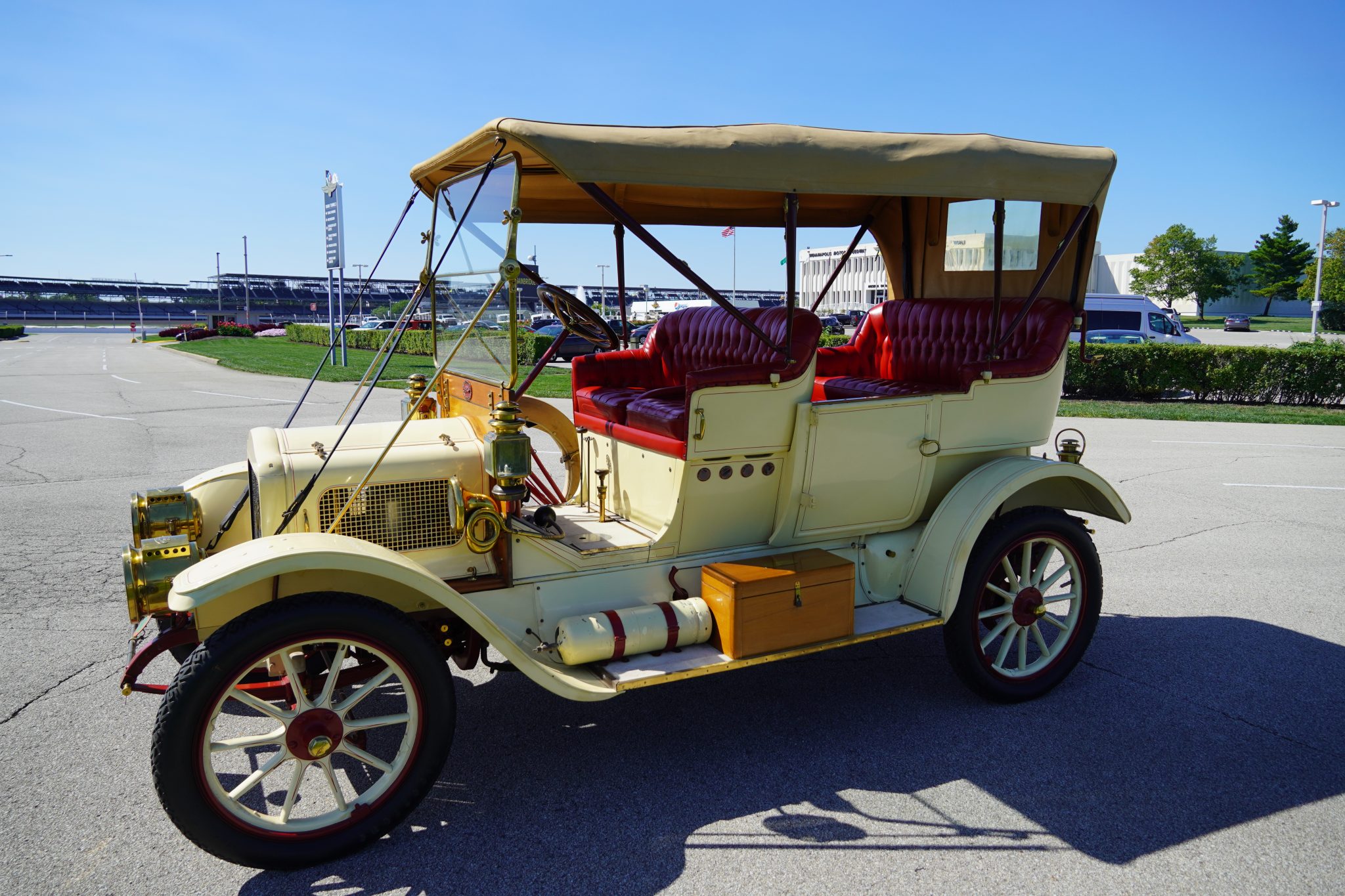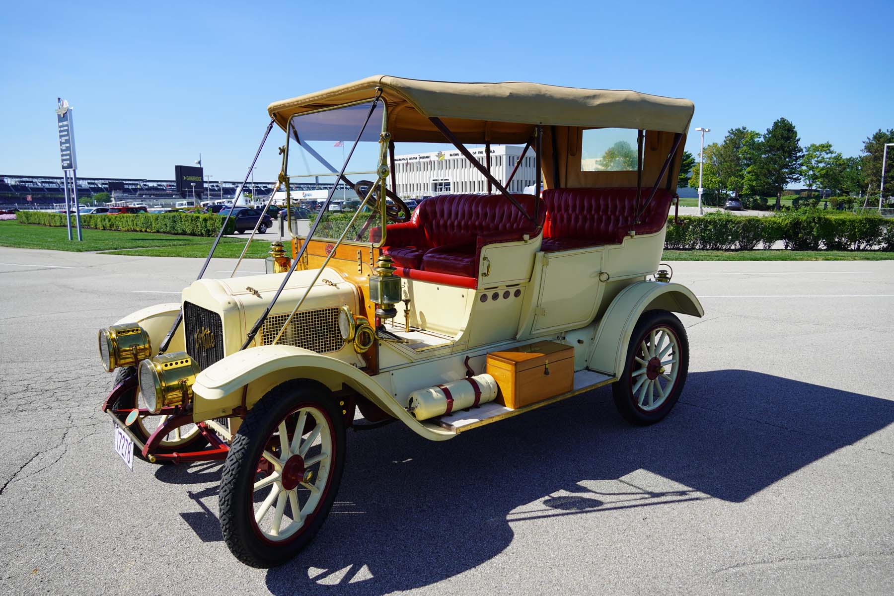 The white-painted wood-spoke 24″ wheels feature red-painted hubs, rims, and spoke pinstriping, and they are mounted with 32×4″ Firestone bias-ply tires. Chipping paint is visible on the wheels. A spare tire is mounted under a canvas cover on the right running board. The Model O-O rode on a 110″ wheelbase and features semi-elliptical leaf springs at all four corners. Stopping power is provided by rear mechanical drums.
