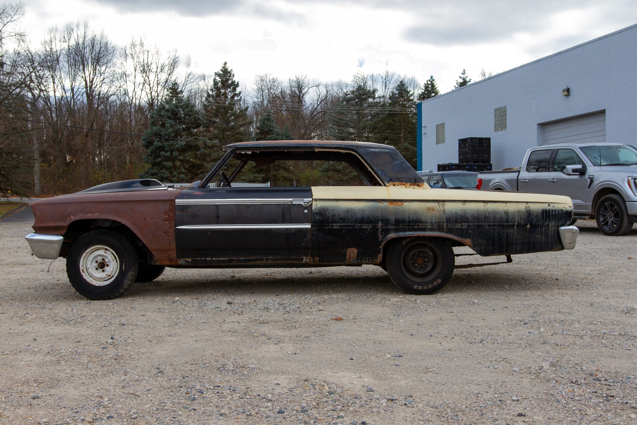 Mismatched five-lug steel wheels are mounted with a mix of dry-rotted tires. Brake, suspension, and steering components are pictured in the gallery, and the brake master cylinder is missing.