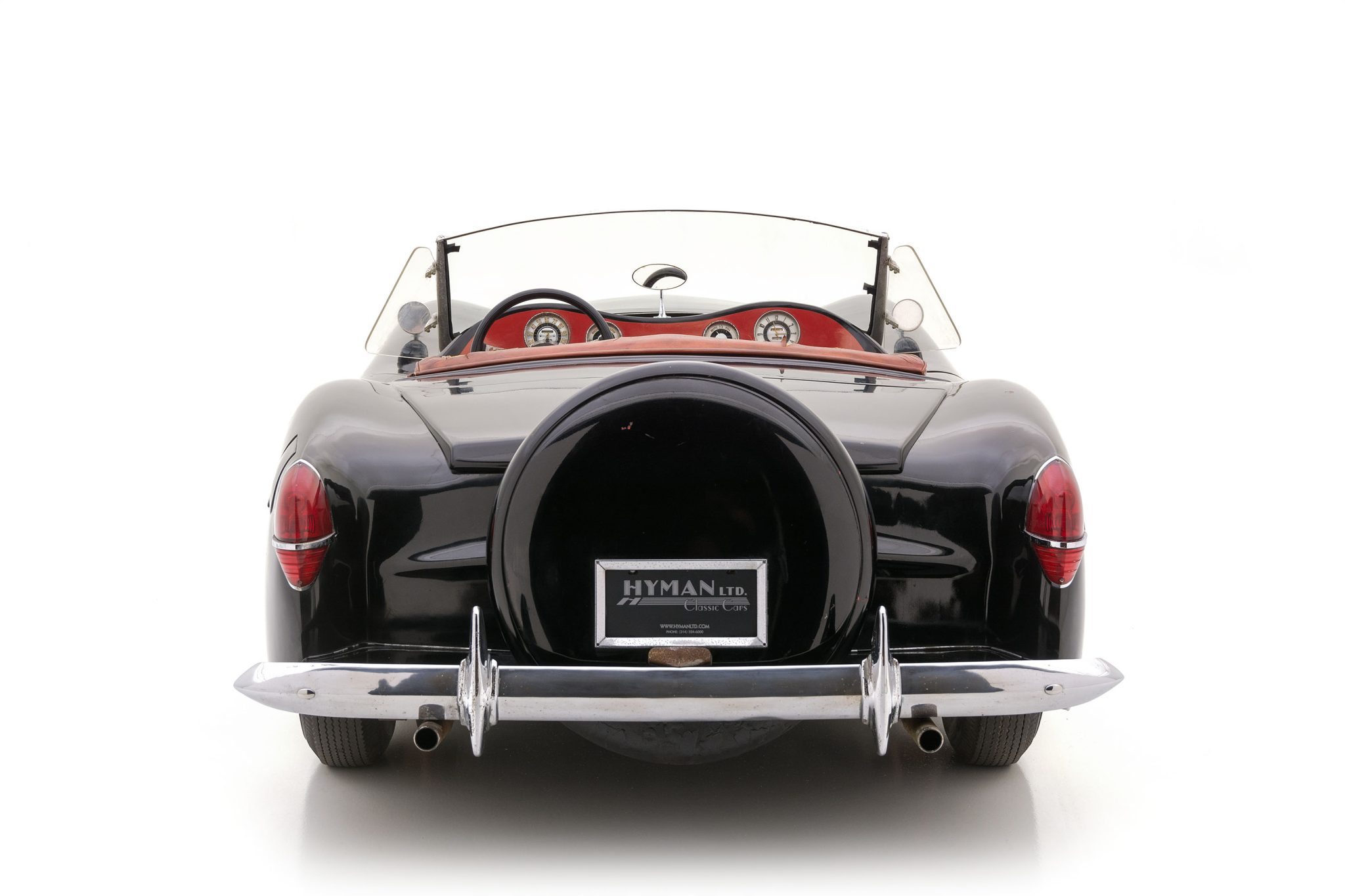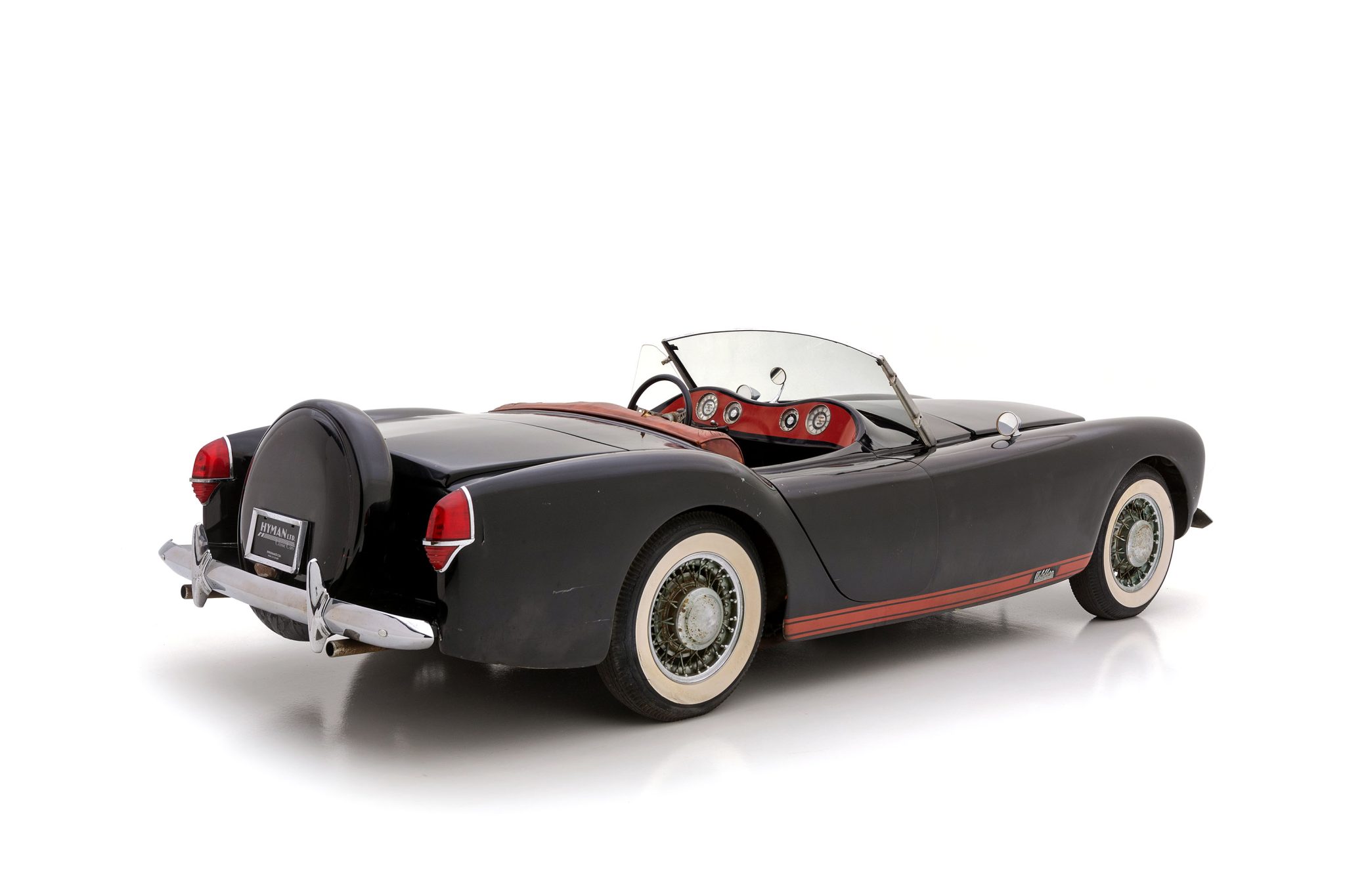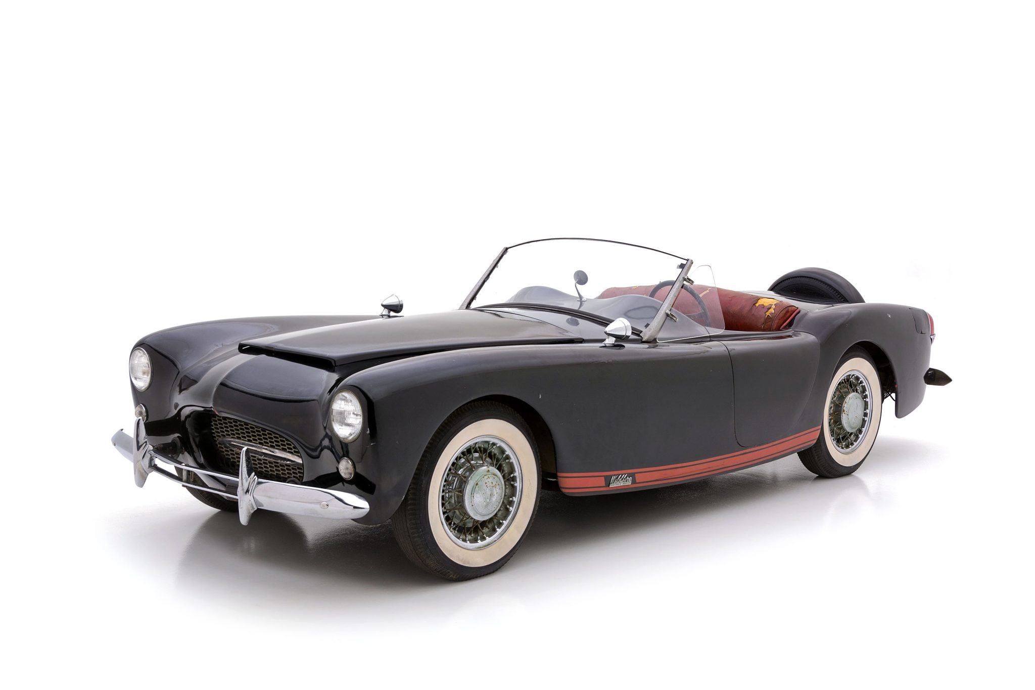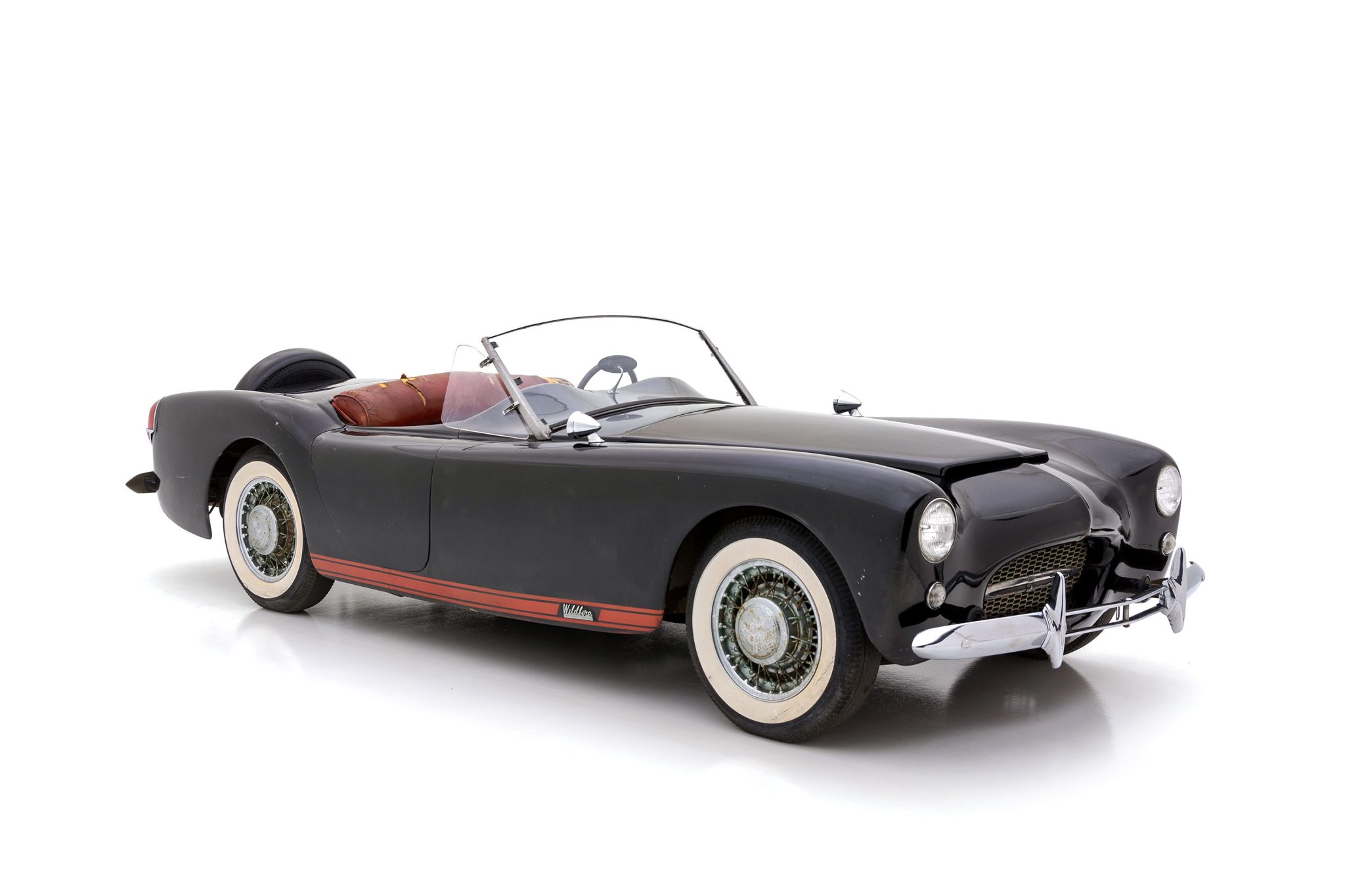 The 15″ wire wheels show evidence of corrosion, and they are fitted with chrome hubcaps and older Firestone bias-ply whitewall tires that show cracking on their sidewalls. A spare wheel is mounted in a Continental kit. Stopping power is provided by four-wheel drum brakes, which are said to lock intermittently. The suspension and brakes will require service prior to regular use.