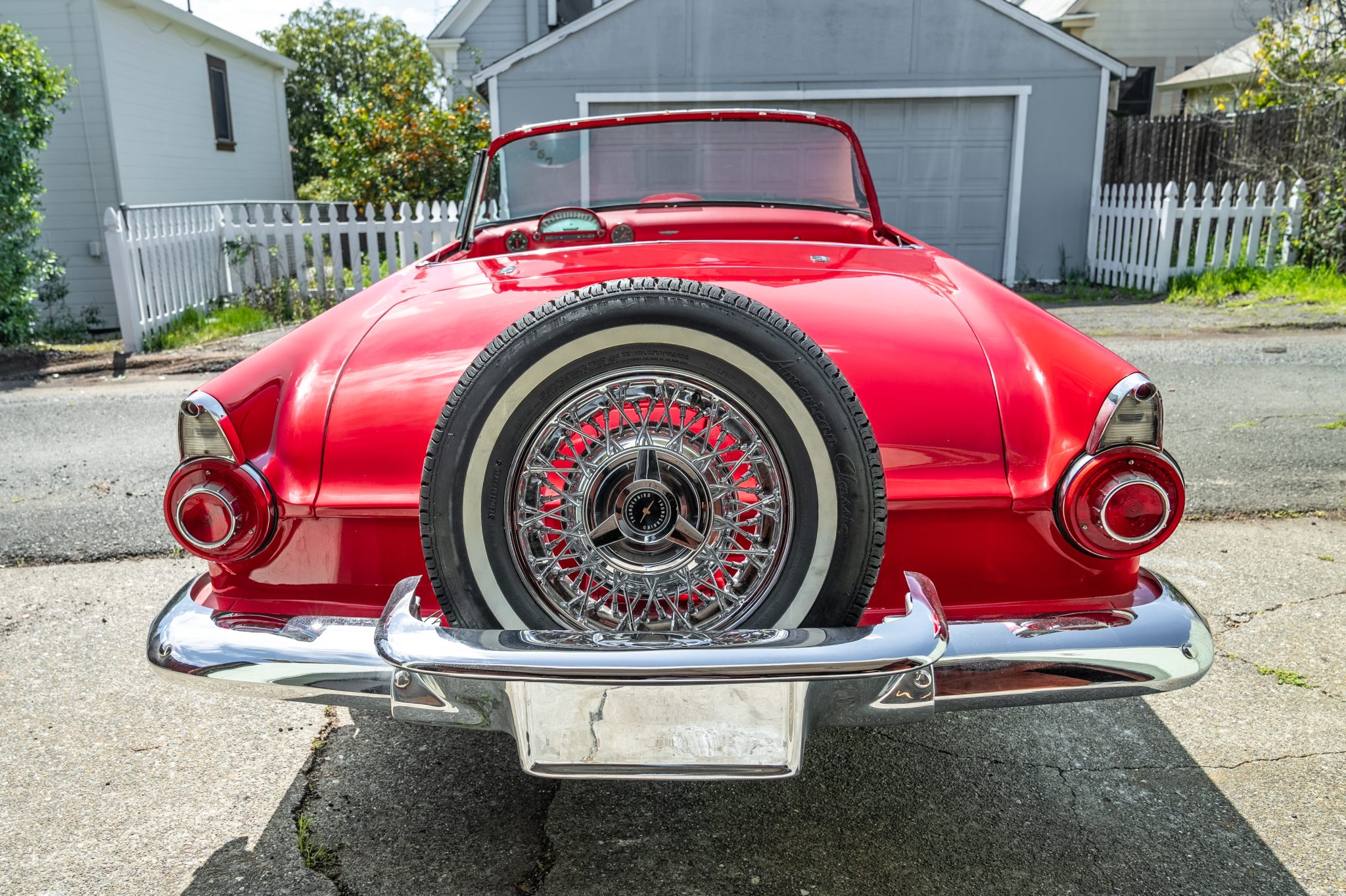 Chrome-finished 15″ wire wheels were installed under current ownership and wear 205/75 Coker American Classic tires. A full-size spare wheel and tire are mounted to the rear bumper. Various suspension and braking components are said to have been replaced following the seller’s acquisition of the vehicle.