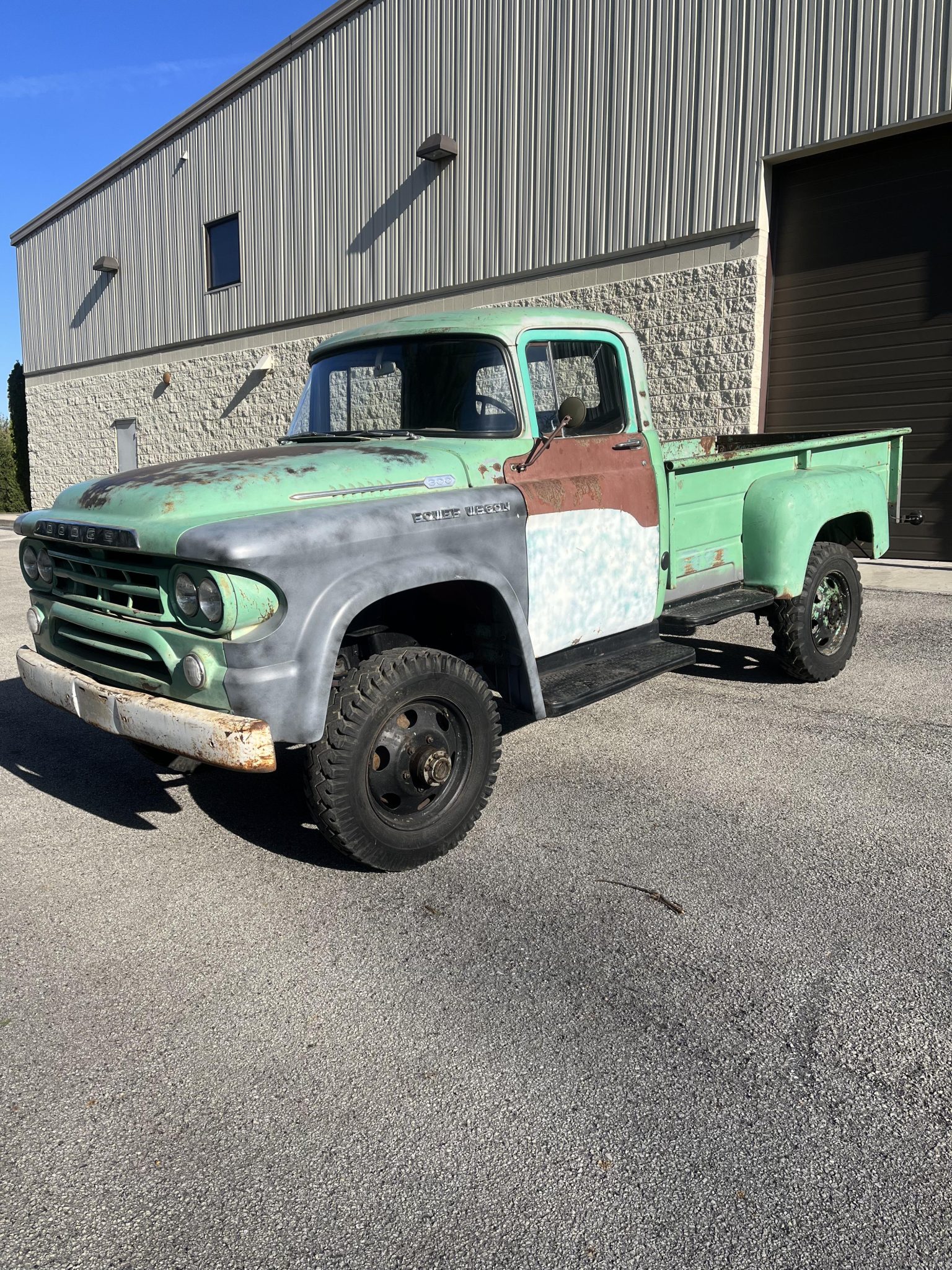 Six-lug 19.5″ steel wheels wear aged, mismatched tires, and the front wheels are mounted over manually locking hubs. A spare wheel and tire are stowed in the bed, and braking is handled by four-wheel drums.