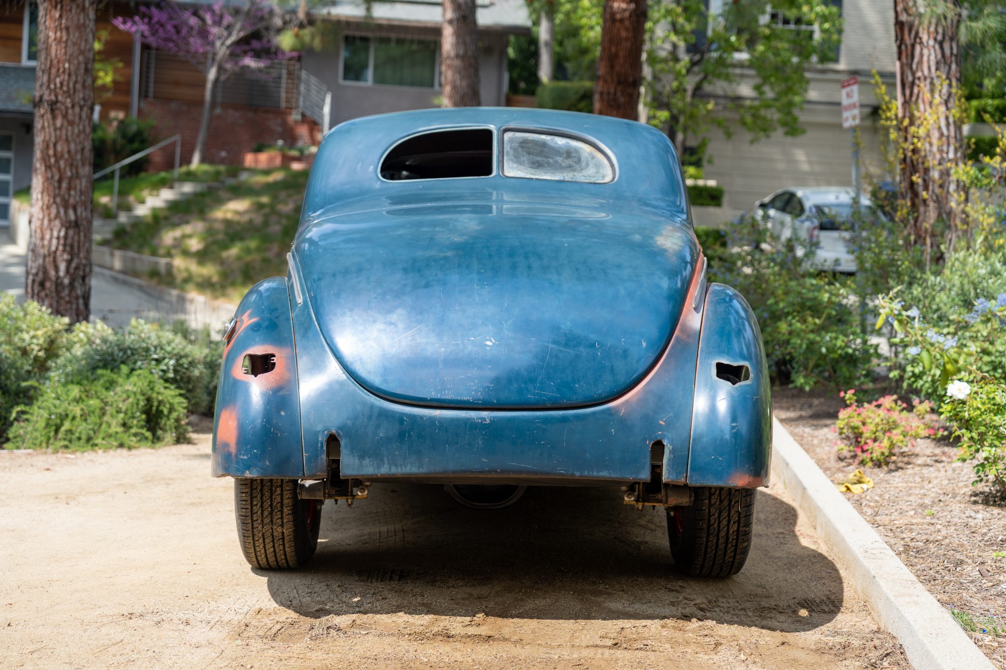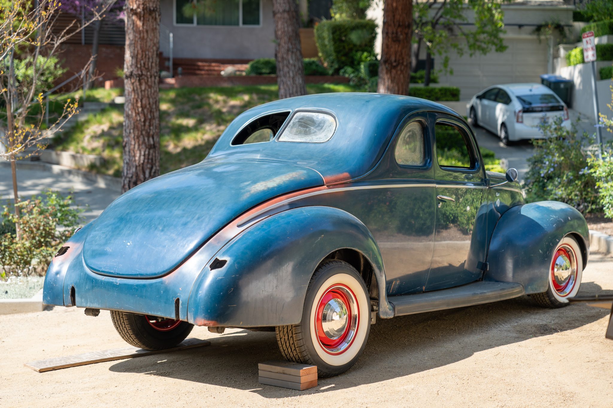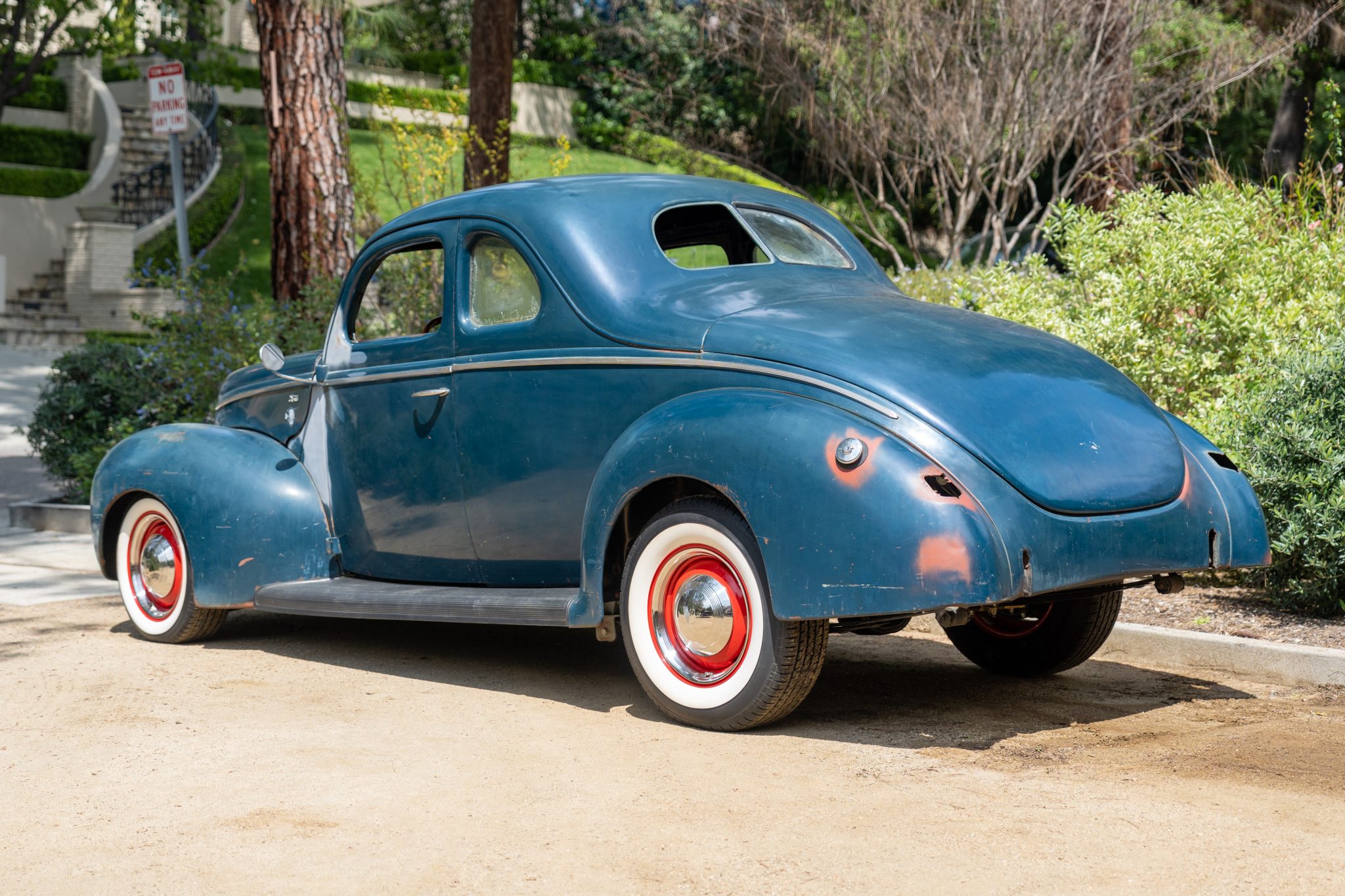 Red-finished Wheelsmith wheels wear chrome trim rings and center caps and are mounted with Toyo Extensa A/S whitewall tires. A TCI dropped I-beam front axle, a transverse leaf spring, a wishbone splitter, a Vega-style steering box, and Borgeson steering joints are said to have been installed in the late 1990s along with replacement brake lines, shock absorbers, body mounts, and sway bars. Braking is handled by front discs and rear drums, and a Wilwood proportioning valve is installed inline along the left framerail. The wheels and tires were installed in 2016.