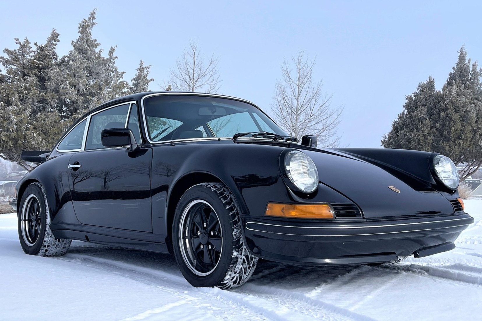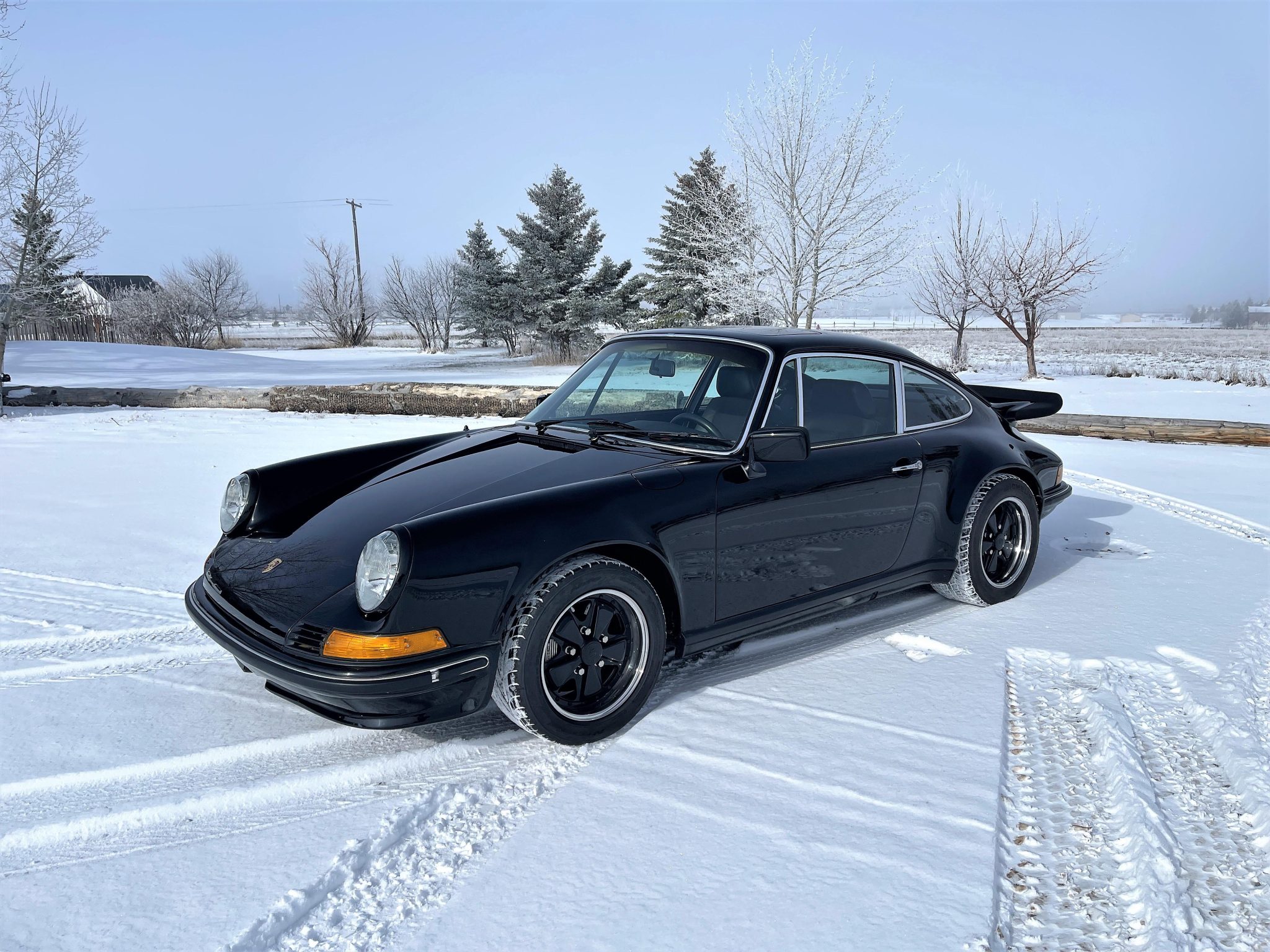 Black 15″ Fuchs wheels feature polished lips and are mounted with 205/50 Nitto front and 255/45 Michelin rear tires, which are said to have been installed under current ownership. Stopping power is provided by 930-sourced calipers over cross-drilled rotors at all four corners, and the brake primary cylinder was replaced by the seller. The car features a front strut tower brace and has been fitted with adjustable coilovers and anti-roll bars. Oxidation is present on the wheel lips.