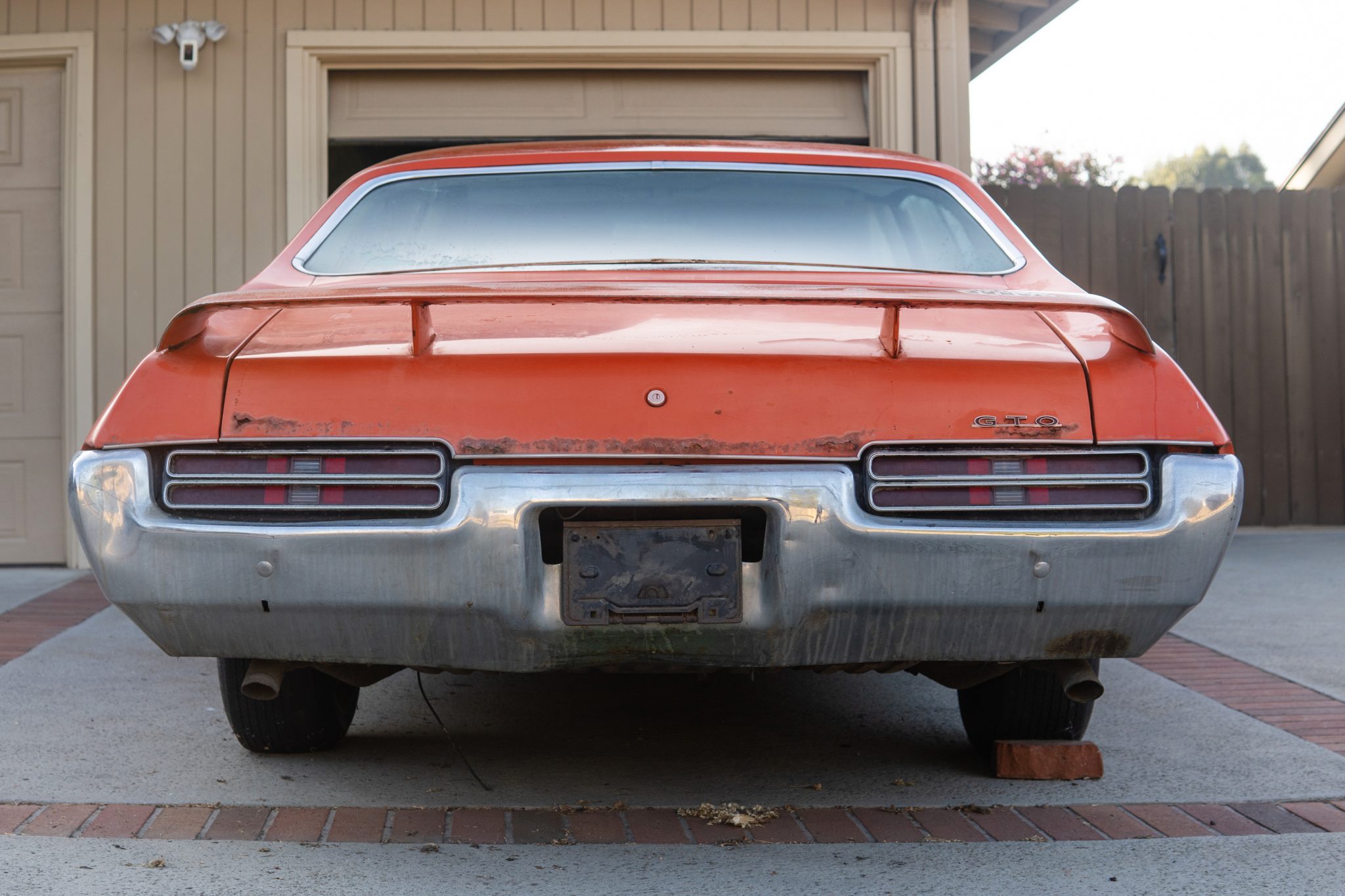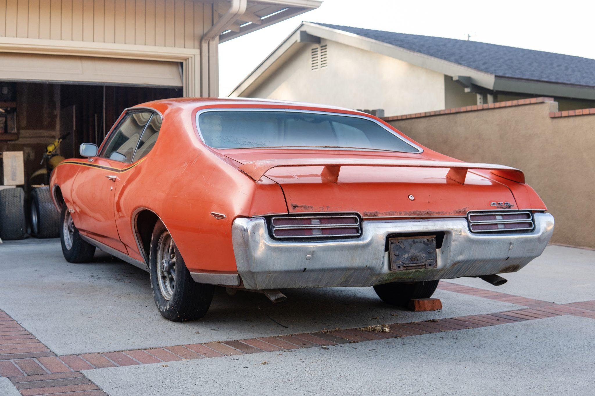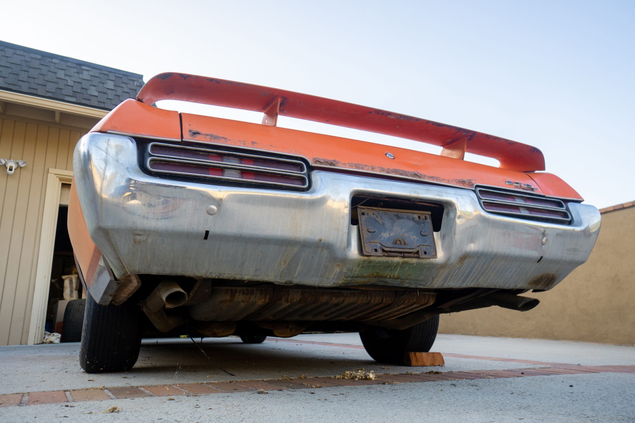 The 14″ Rally II wheels are mounted with mismatched tires. The front wheels are missing center caps, and all four hubs have missing lug nuts. The car features power steering, and braking is handled by power-assisted front discs and rear drums.