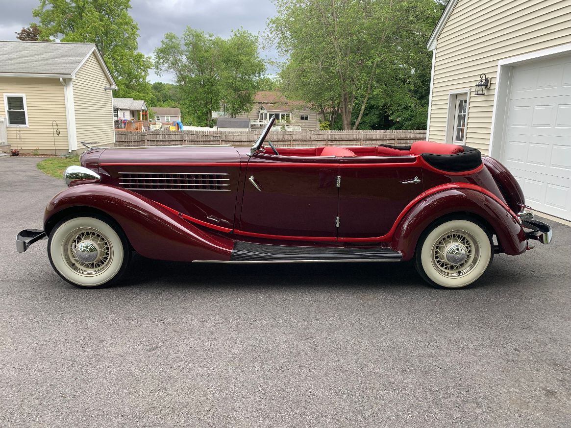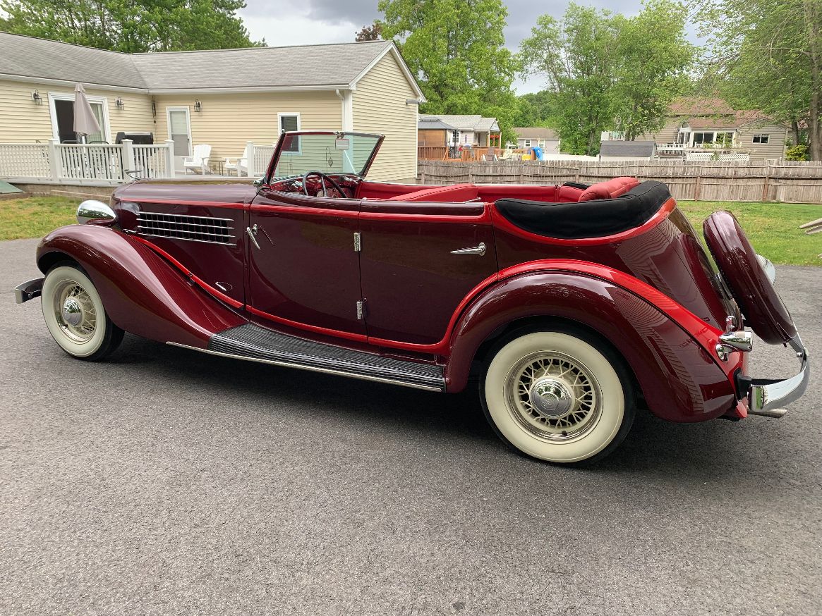 The cream-painted wire wheels wear chrome hubcaps and are mounted with bias-ply whitewall tires. A matching spare wheel is fitted under a body-color cover out back. The solid-axle suspension incorporates semi-elliptical leaf springs as well as front lever-arm and rear hydraulic shock absorbers. Stopping power is provided by hydraulic drum brakes at each corner.