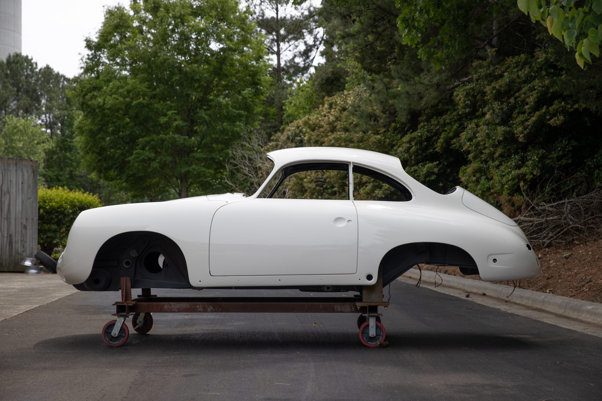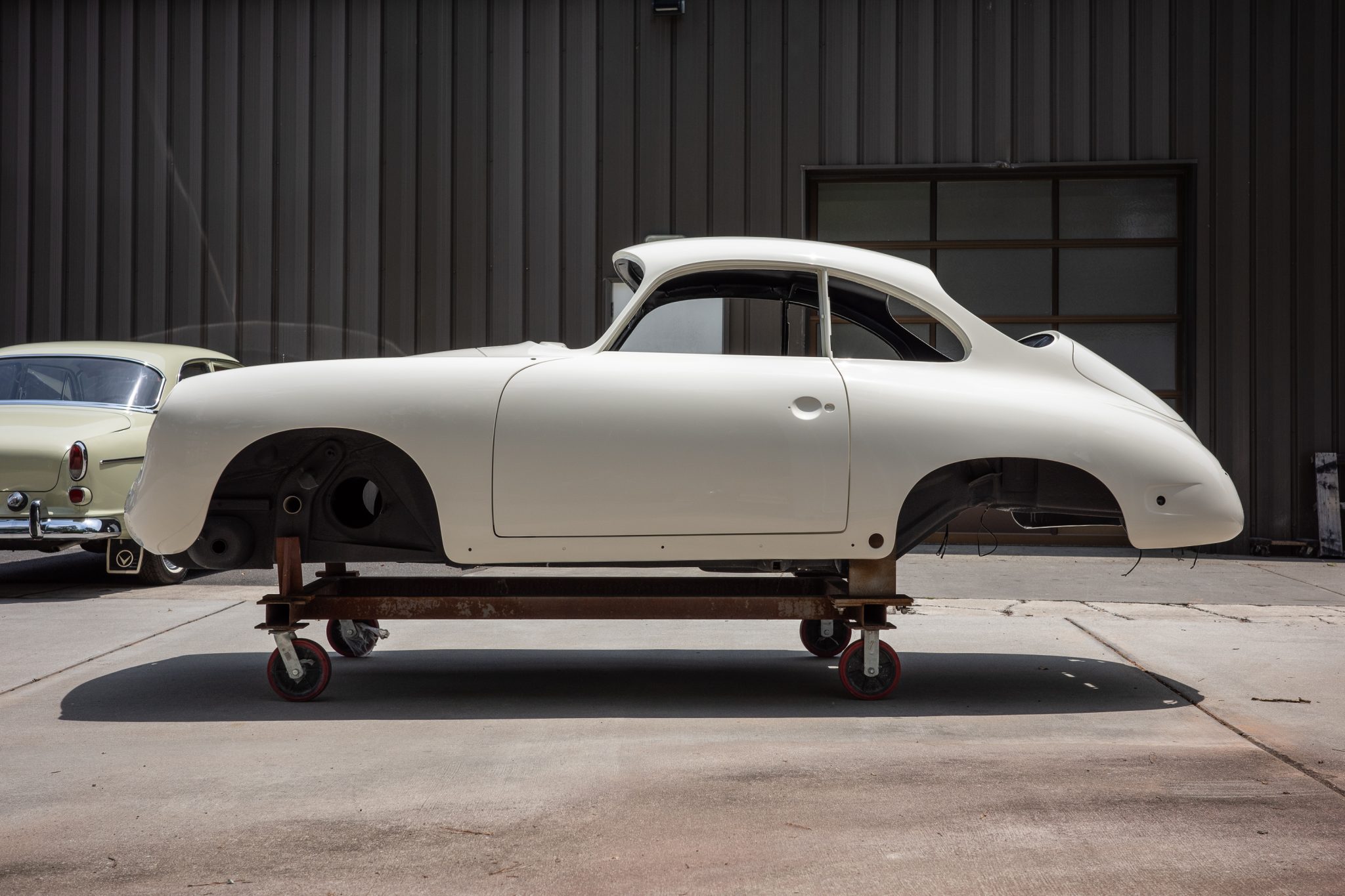 The body has been mounted to a steel dolly that rolls on polyurethane casters. Removed suspension components can be seen in the gallery, and the selling dealer states that three steel wheels are included in the sale.