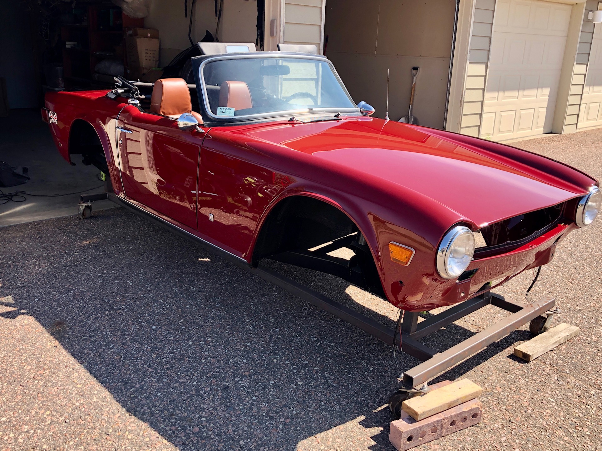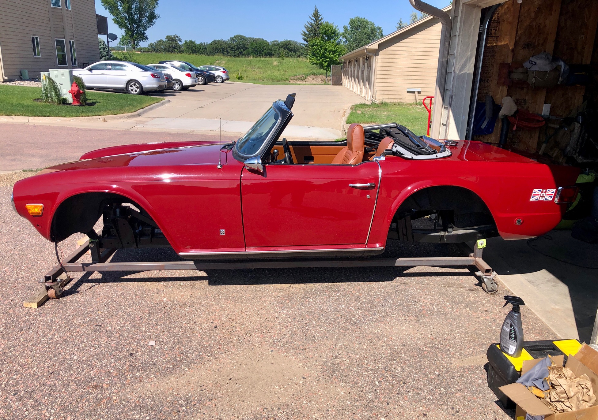 The body is affixed to a metal dolly that rolls on casters. The removed suspension components were refinished in gloss black and can be seen in the gallery below along with a set of steel wheels, chrome-finished trim rings, front disc brakes, rear drum brakes, and KYB dampers.