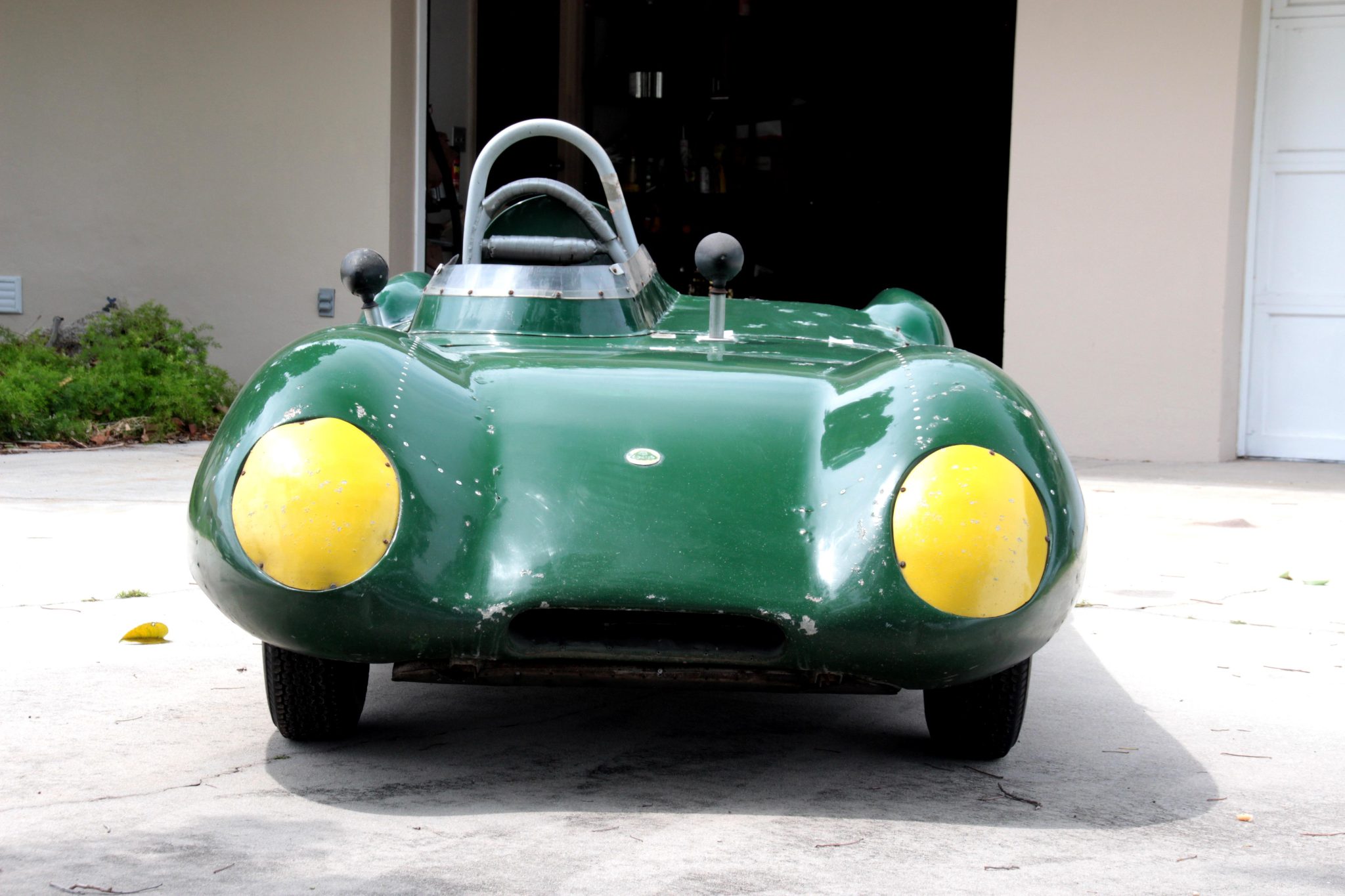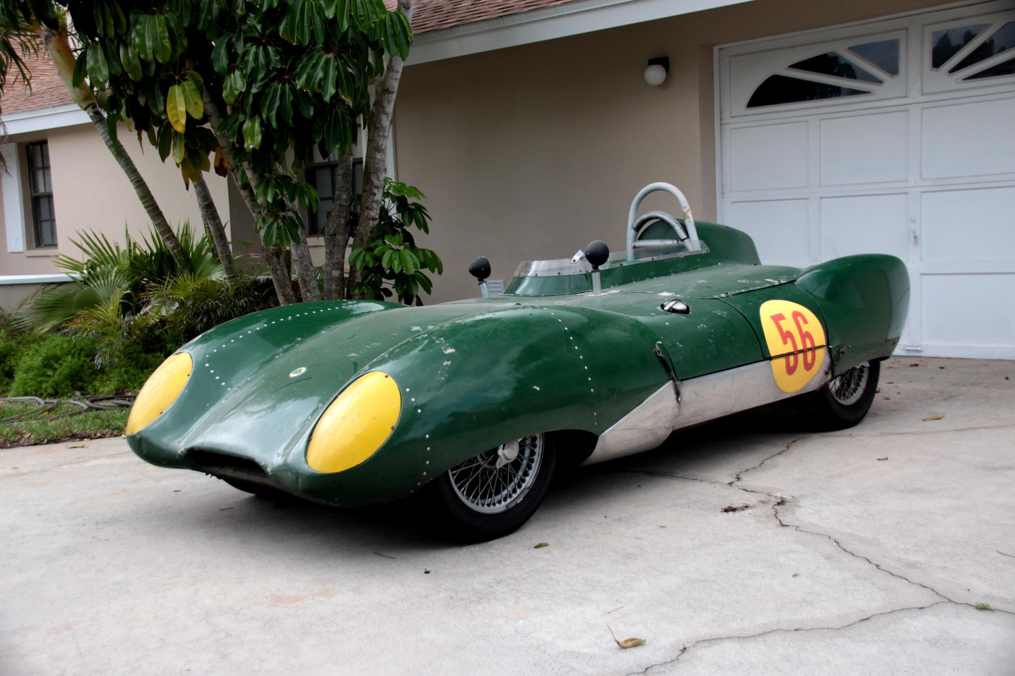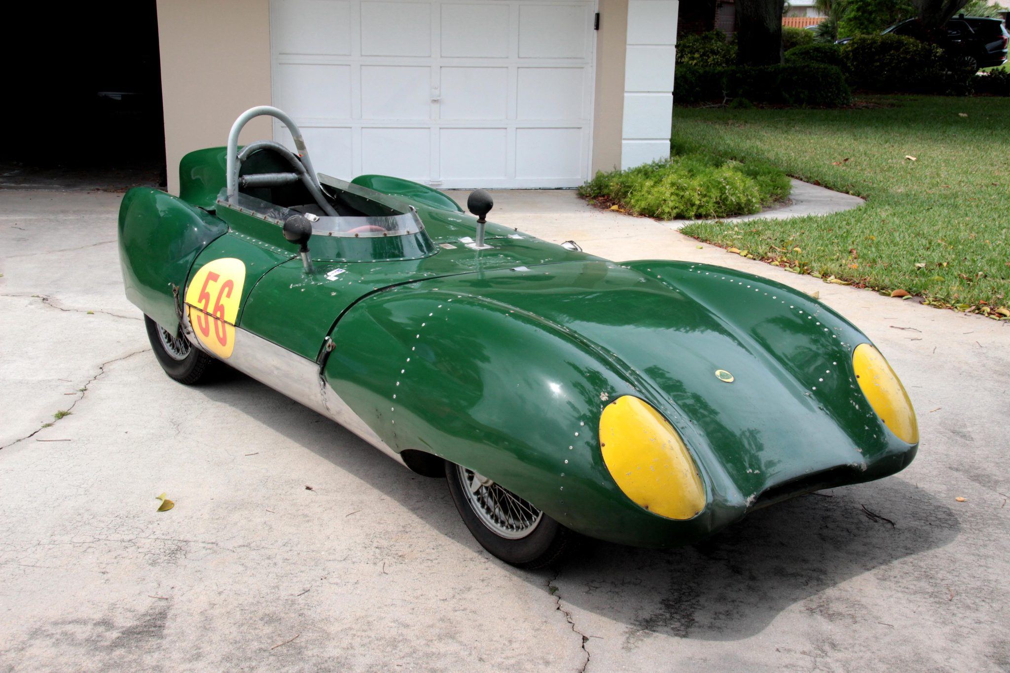 Staggered-offset 15″ wire-spoke wheels are secured via two-eared knock-off spinners and are mounted with older Dunlop Racing tires. The car is equipped with de Dion rear suspension and Spax coilovers at each corner. The brake system consists of four-wheel discs with inboard-mounted rear rotors, and the seller recommends inspecting the brake components as well as replacing the master cylinder and caliper seals prior to use.