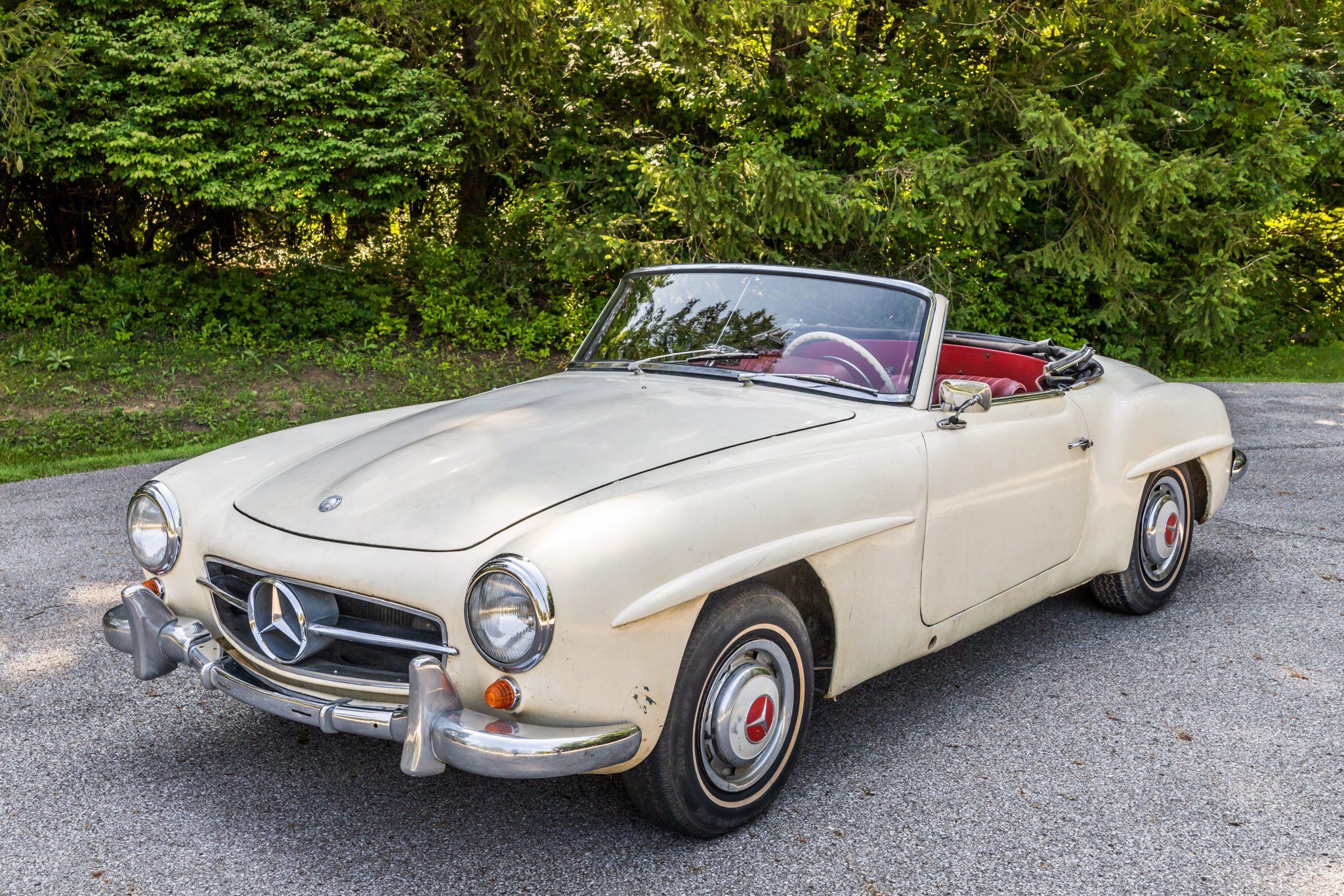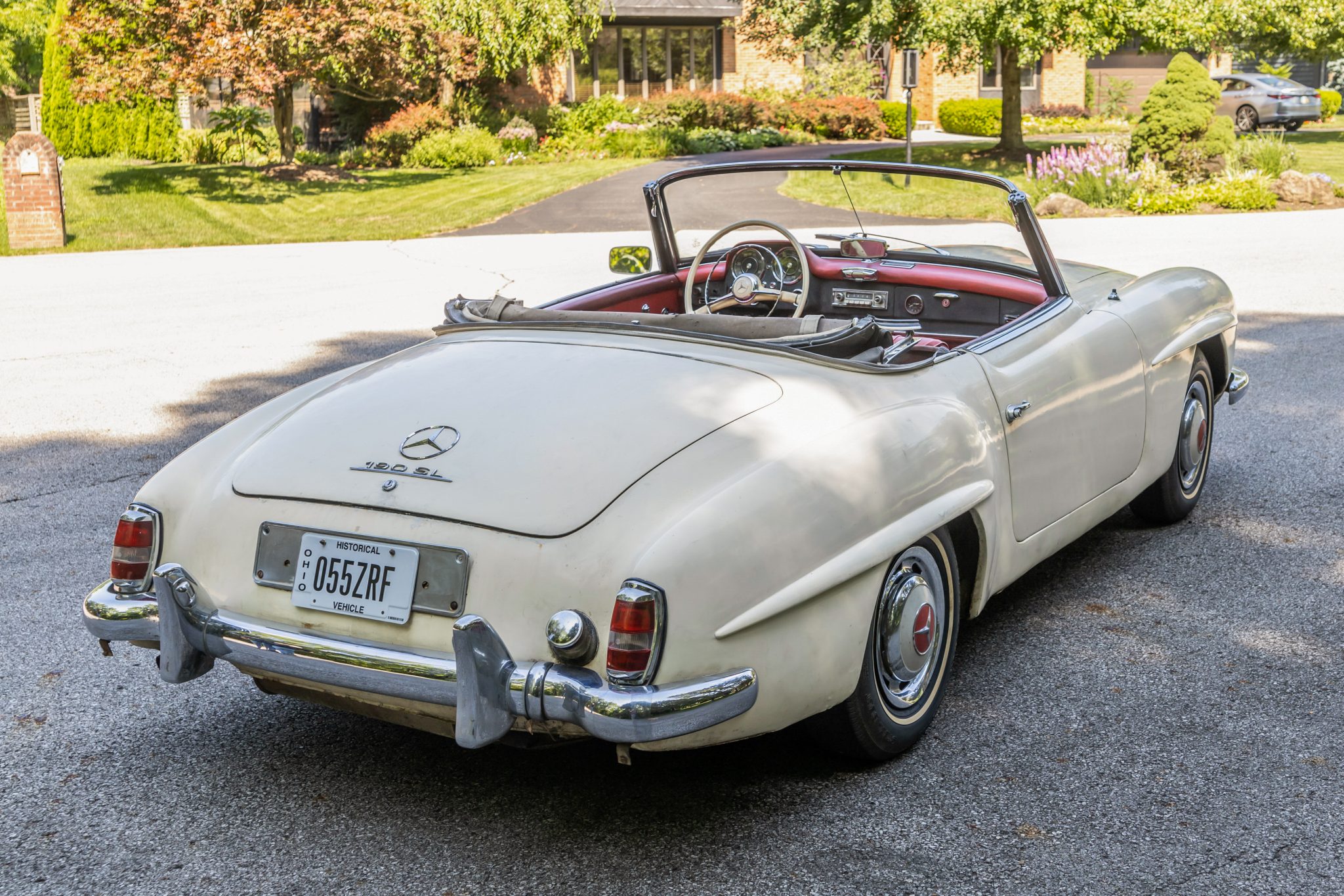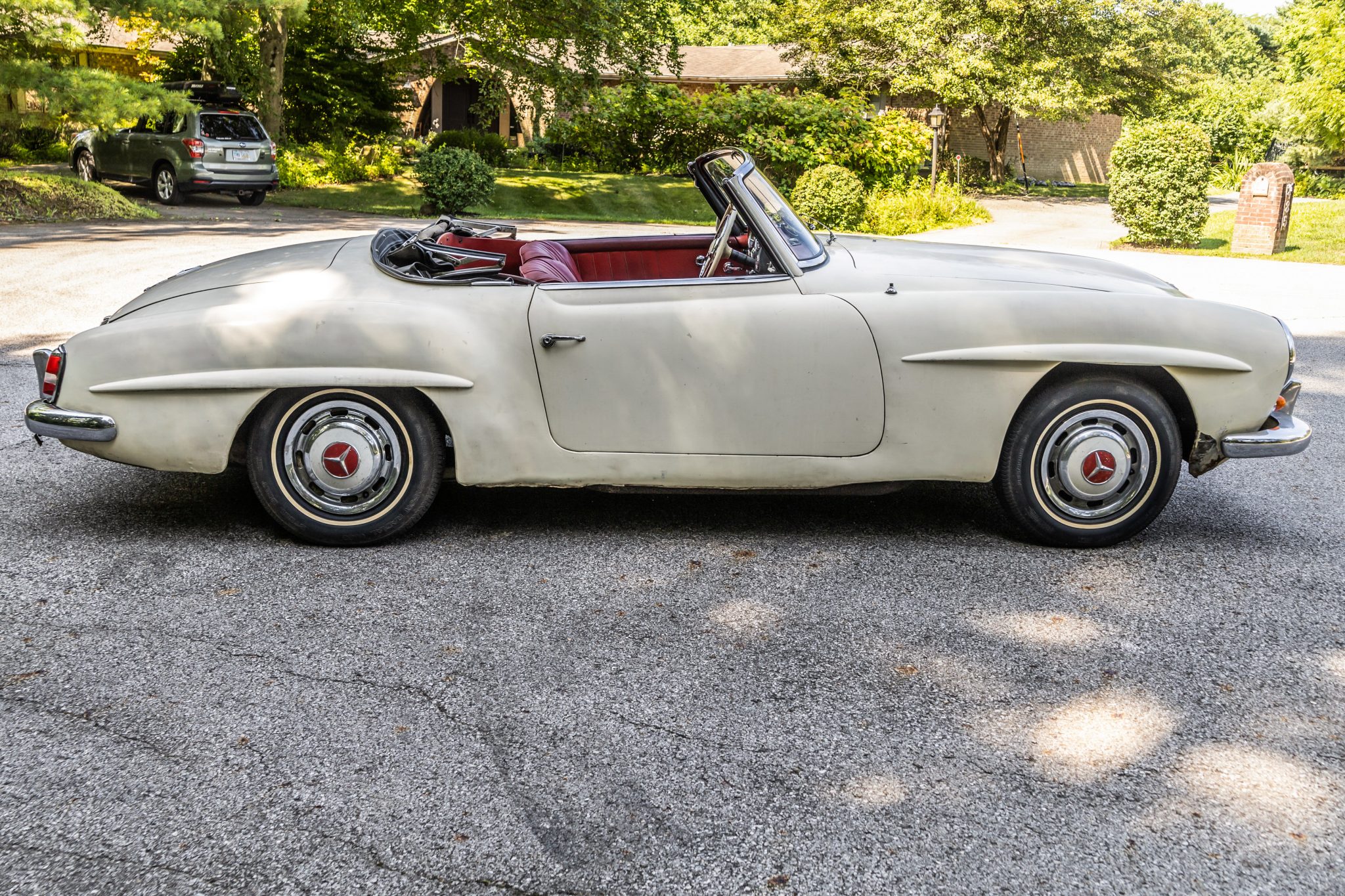 Steel 13″ wheels wear chrome trim rings, hubcaps with body-color accents, and 185/80 Dean Alpha IV Season Radial tires. The car is equipped with a double-wishbone front suspension, a rear swing axle with coil springs, and four-wheel drum brakes. The seller notes the car has been in storage and the brakes should be serviced.