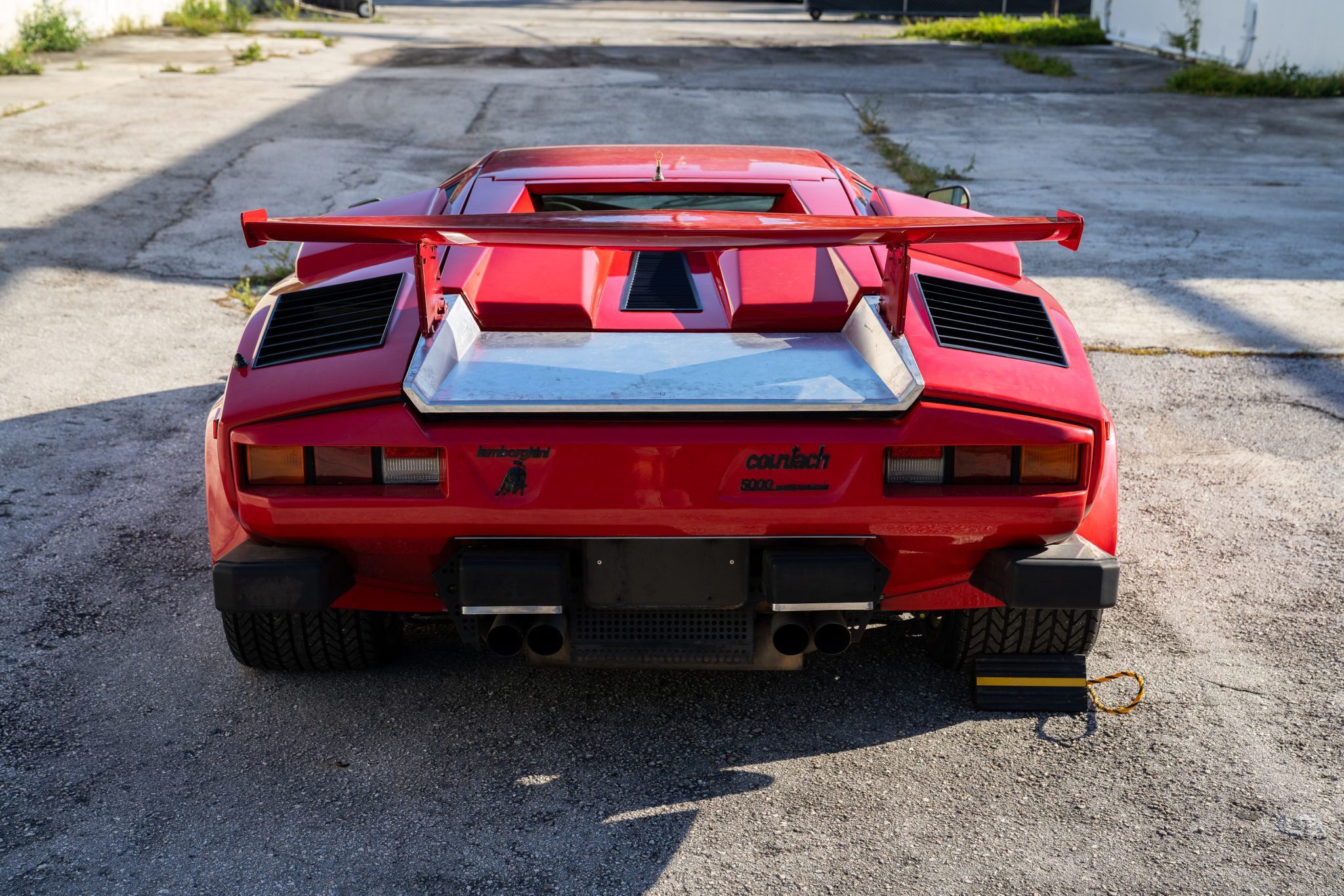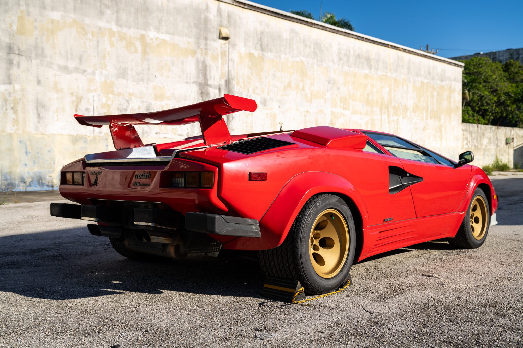 This example is finished in red, and various cracks and other imperfections in the finish and trim are shown in the photo gallery below. Features include a V-shaped rear wing, US-specification front and rear bumpers, a white-painted front chin spoiler with amber fog lamps, pop-up headlights behind faired-in turn signals, front and rear side markers, and Vitaloni side mirrors. The louvered panel between the passenger-side air box and rear quarter window is missing, and the lower portion of the driver-side window is off track. Flaking of the finish can be seen inside the turn-signal housing on the passenger side, and other imperfections are detailed in the gallery.