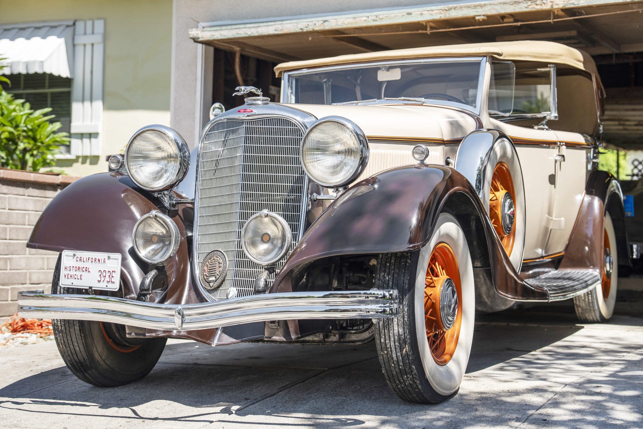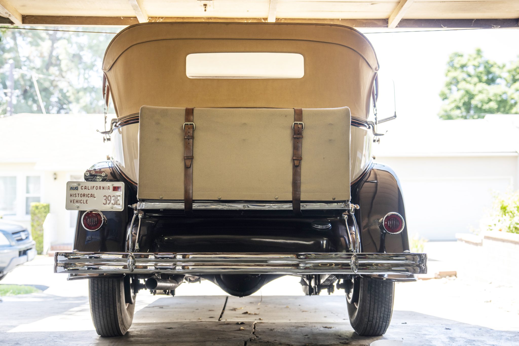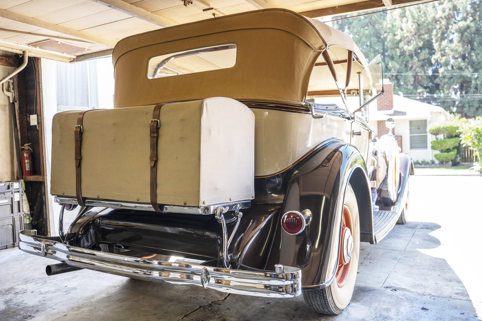 This example’s four-door, single-cowl coachwork features centrally hinged wind wings that can be folded inward to act in lieu of a central windshield or extended outward to serve as front and rear side windows. The body was finished in beige with brown fenders and beltline moldings accented by orange pinstriping during the refurbishment performed over 45 years ago. Features include a beige convertible top, a louvered hood, a chrome mesh grille with thermostatic shutters, a greyhound radiator-cap mascot, Trippe driving lights, and a fold-down luggage rack carrying a trunk under a beige cover. A CCCA National First Prize badge is affixed to the right side of the cowl.